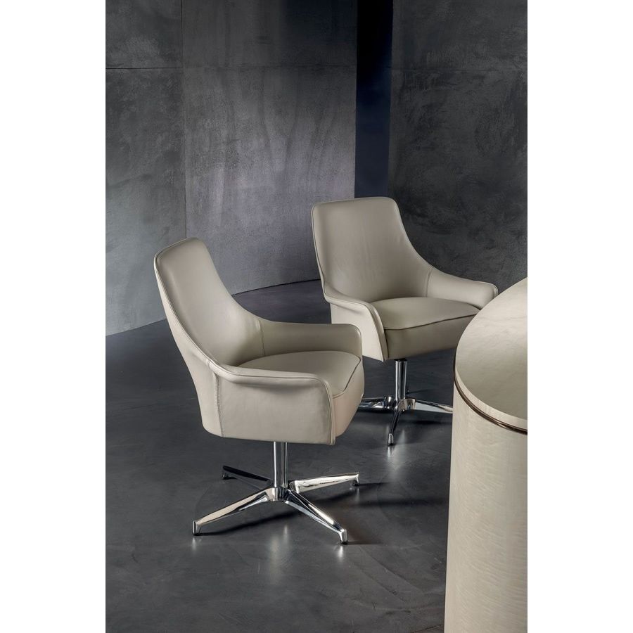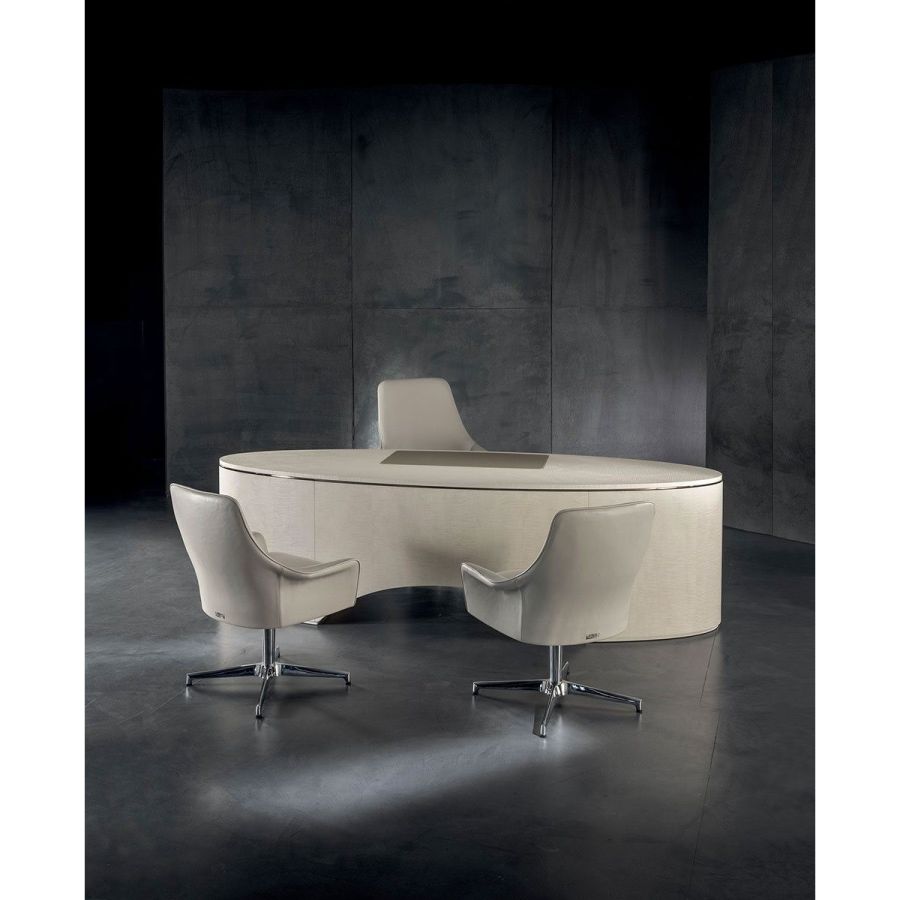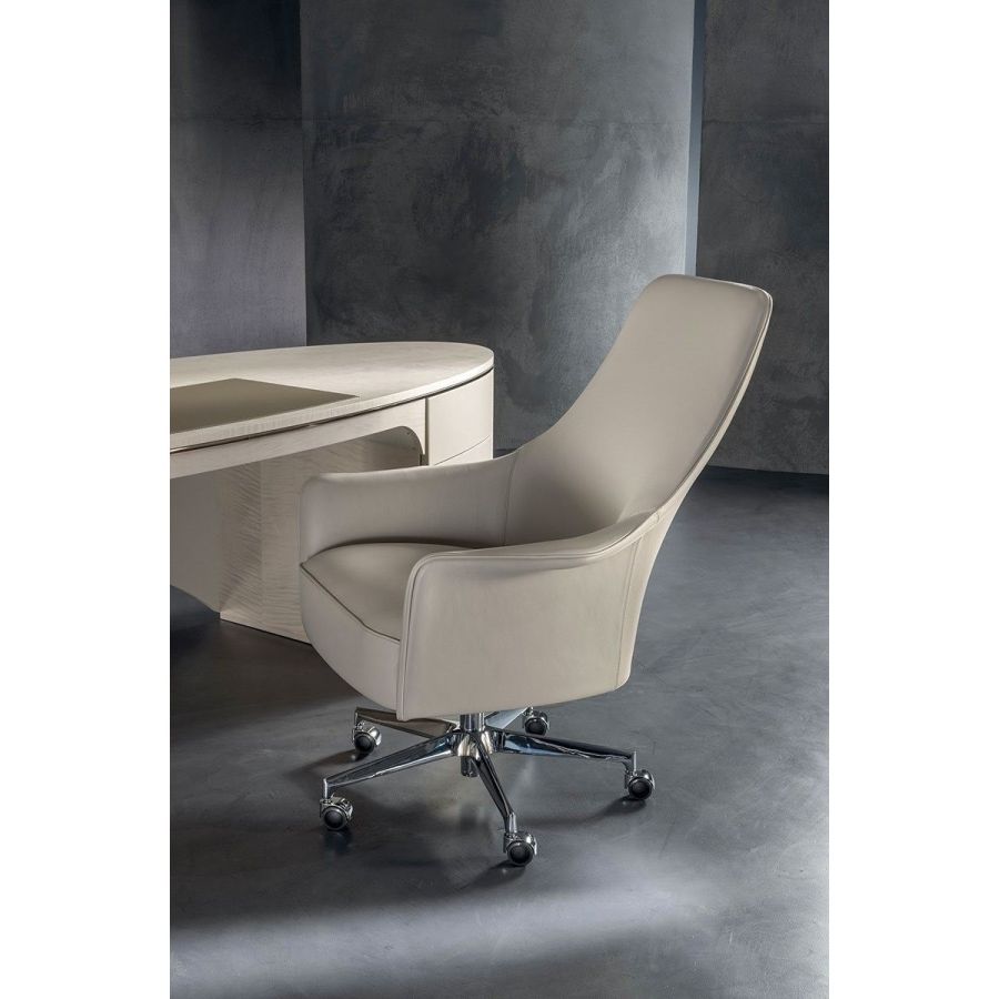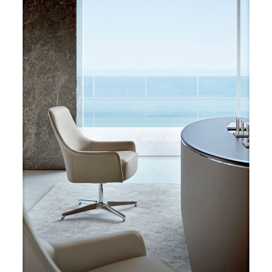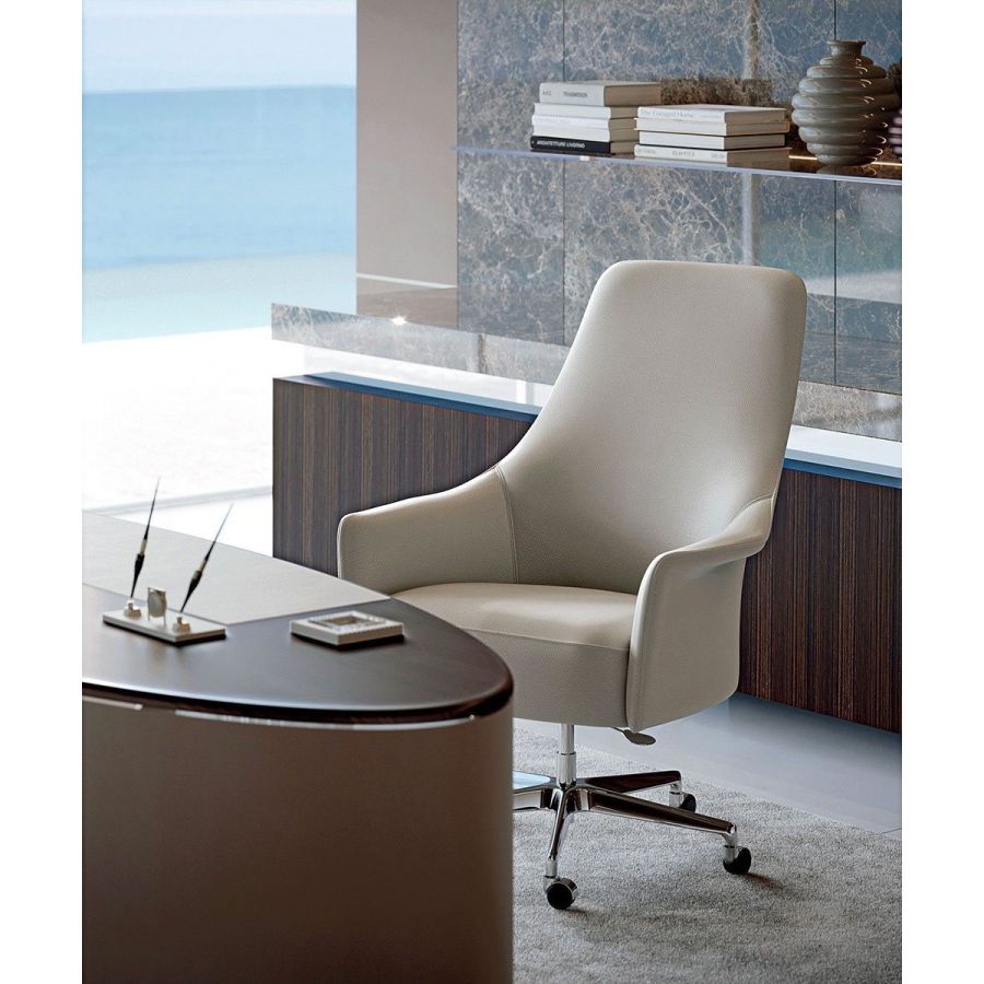 The load-bearing structure of the office armchair is made with an innovative technology that uses POLIMEX®. This is a poly-bonded material that combines polyurethanes with high mechanical resistance and multi-density polyurethane foams in a single material that can guarantee high structural resistance, reduced weight, and unmatched comfort. In addition, POLIMEX® has low environmental impact, since it is100% recyclable. The seat cushion is in wood covered in triple-density polyurethane foam. There are two versions of this armchair: With a high backrest and the base in bright chrome metal set on castors, 360°swivel, gas piston for height adjustments, and adjustable tilt from 4° forward and 11° backward. With a low backrest and the base in bright chrome metal set without castors, self-aligning 360° swivel, and adjustable tilt from 4° forward and 11° backward. The leather or fabric upholstery is NOT removable.