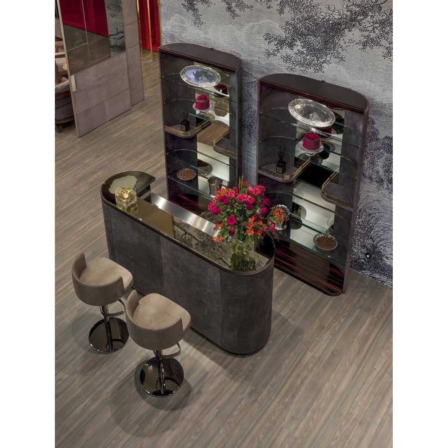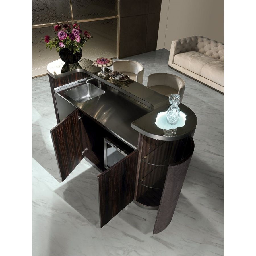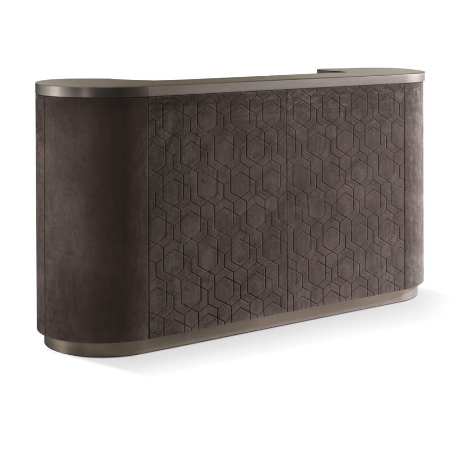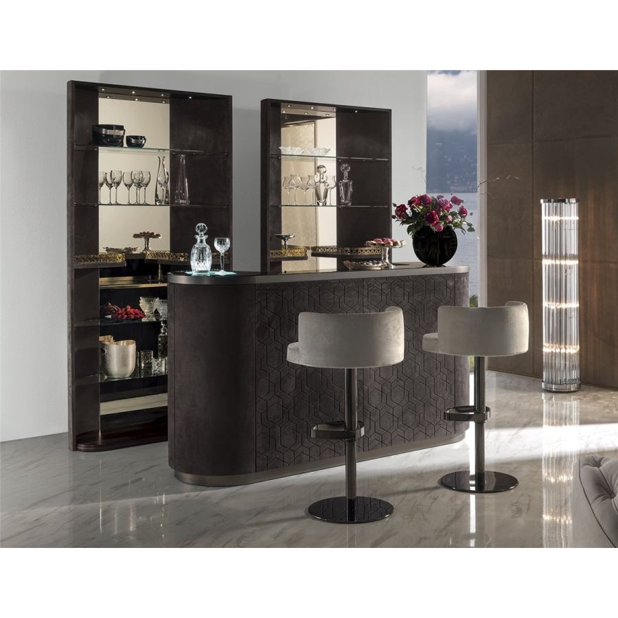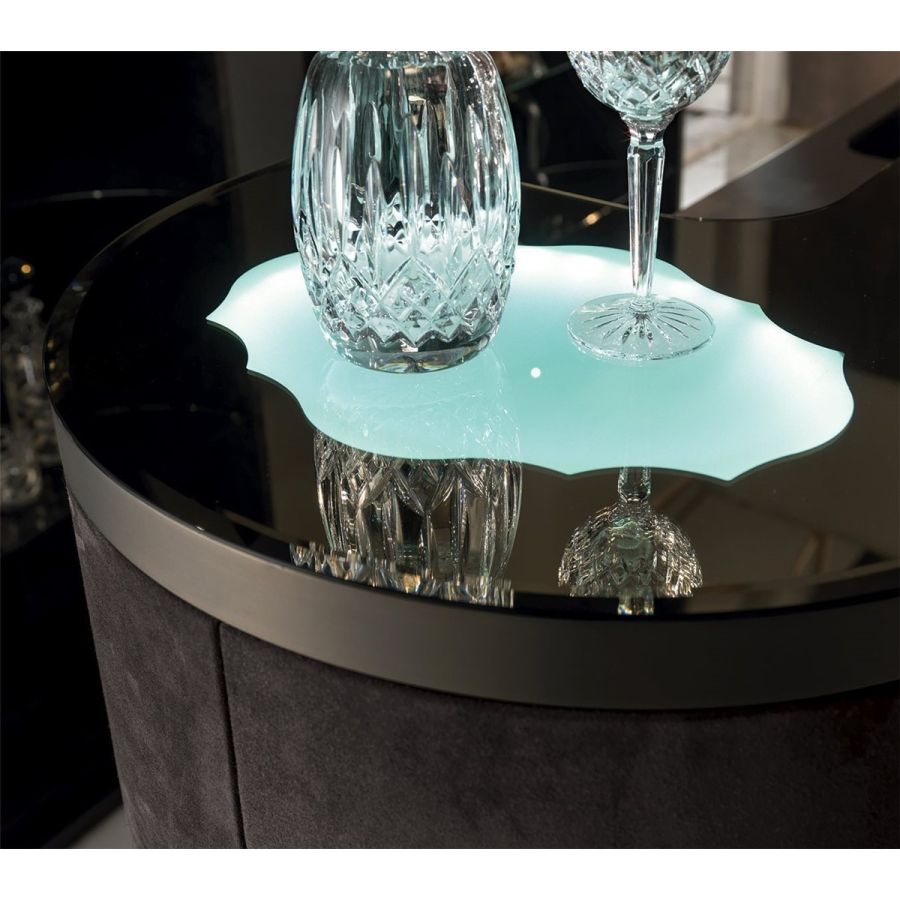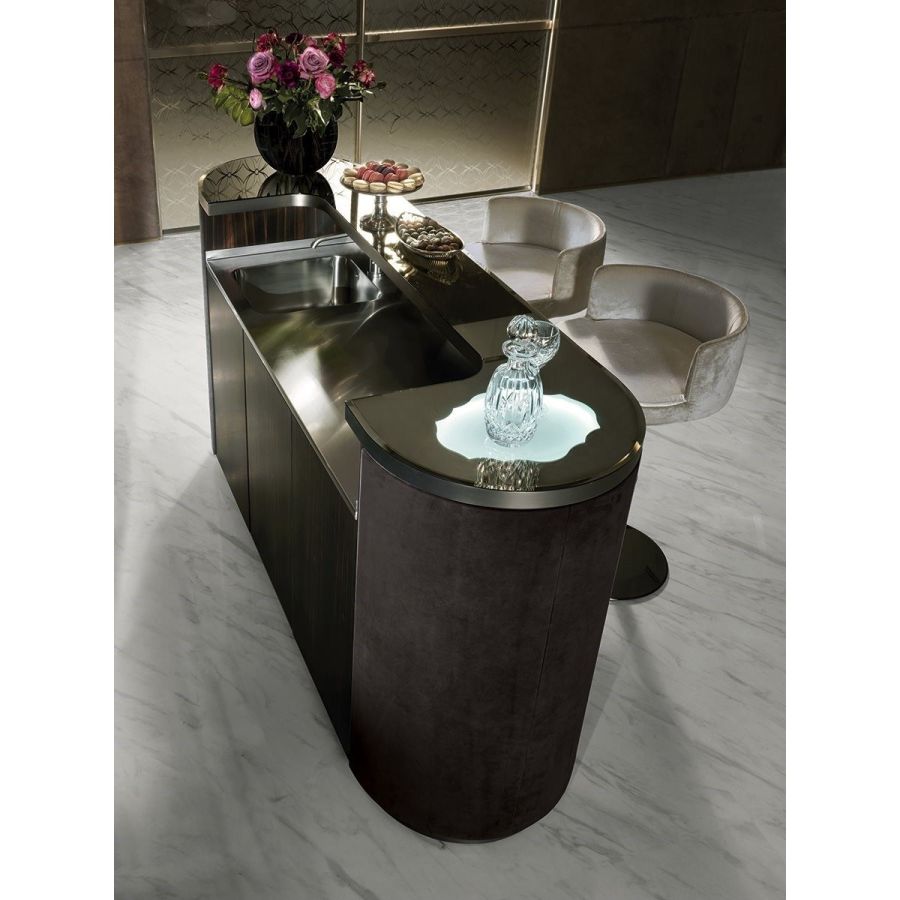Bar unit with top in satin steel, with basin and taps. The top is also available without accessories. Shaped upper top with bronze or smoky mirror 5 mm with bevel. On request, it is possible to insert a led light with frosted glass diffuser. The cabinet frame is covered in leather or cashmere from the Loro Piana Interiors catalogue, but only the front part can be covered in leather from the P.3 Suede ranges finished with 3D effect leather with “Diamond” or “Sequence” decor. The internal finish of the cabinet with doors in ebony and dark stained zebrano wood, and the cabinet with doors in Canaletto walnut has the internal finish in Canaletto walnut. Ground metal edges in the following finishes: Satin nickel, bright shaded brown, Black Rose gold, bright light gold, matt Champagne gold, bright chrome, bright black chrome, matt satin bronze, bright pink gold, matt pink gold. On request, a mini wine refrigerator is available.