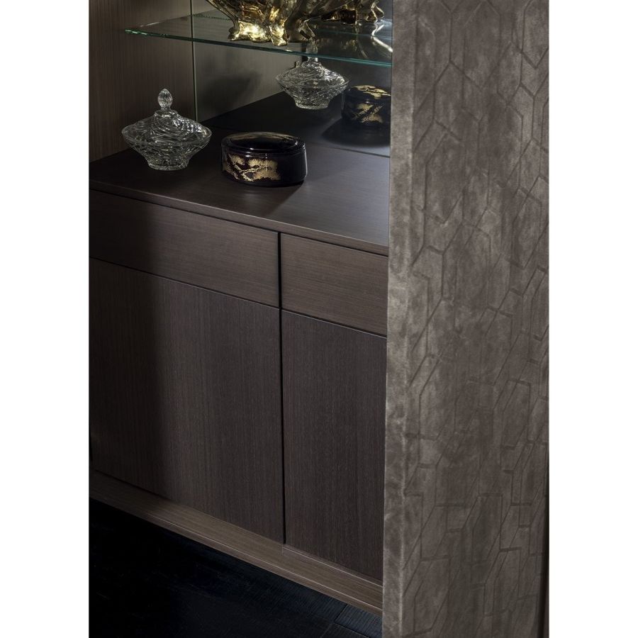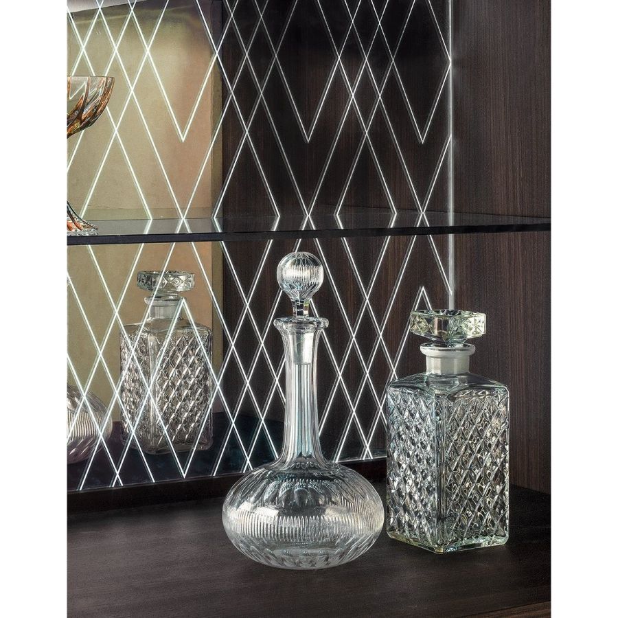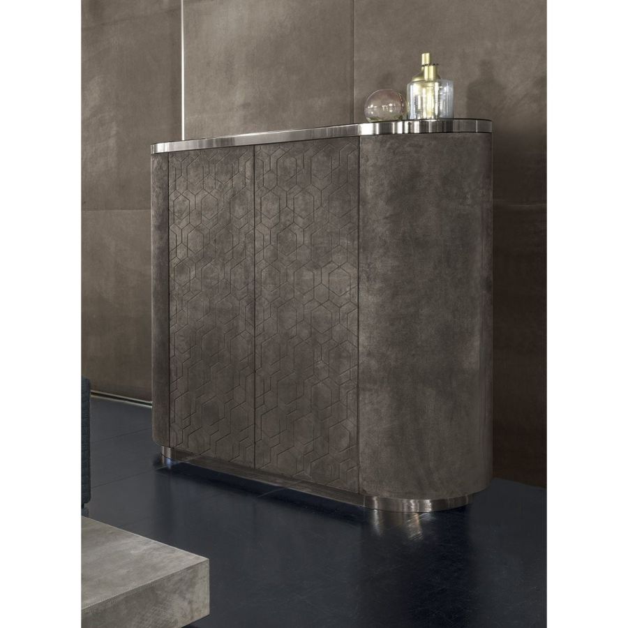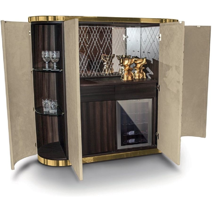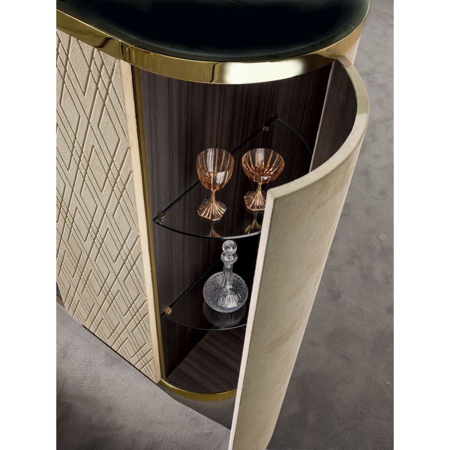 Bar unit fully covered in leather or cashmere from the Loro Piana Interiors catalogue. Dark stained zebrano wood internal finish, transparent glass shelves, lasered mirror with illuminated decoration, two drawers andan optional mini wine refrigerator. The 3D effect door covering with raised “Diamond” or “Sequence” decorationis only available in the P.3 Miami/SoftLeather/TecSuede range. Top surface finish: 5mm bronze orsmoky bevelled mirror. Ground metal base and edges in the following finishes: Satin nickel, bright shaded brown,Black Rose gold, bright light gold, matt Champagne gold, bright chrome, bright black chrome, matt satin bronze, bright pink gold, matt pink gold.