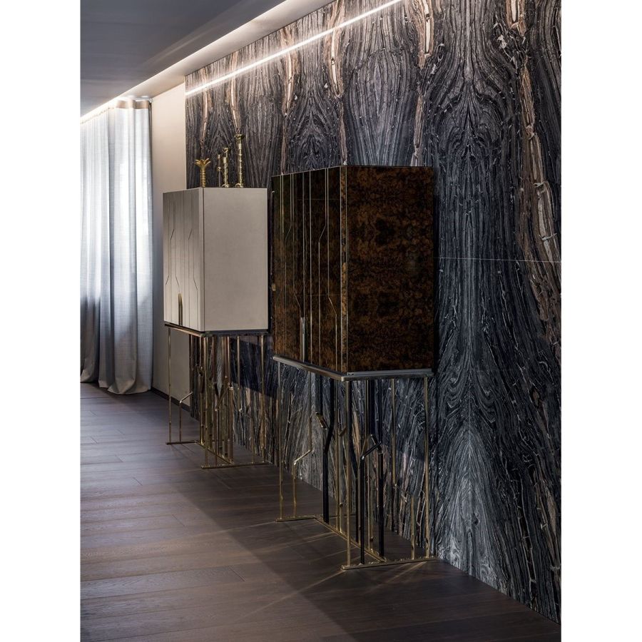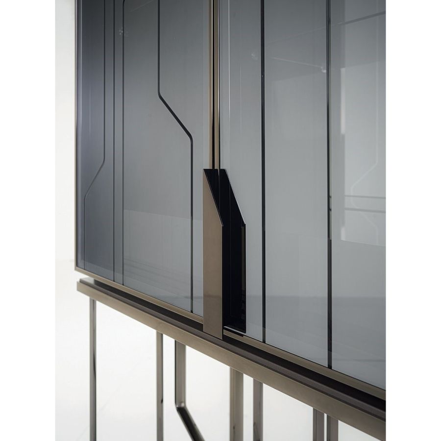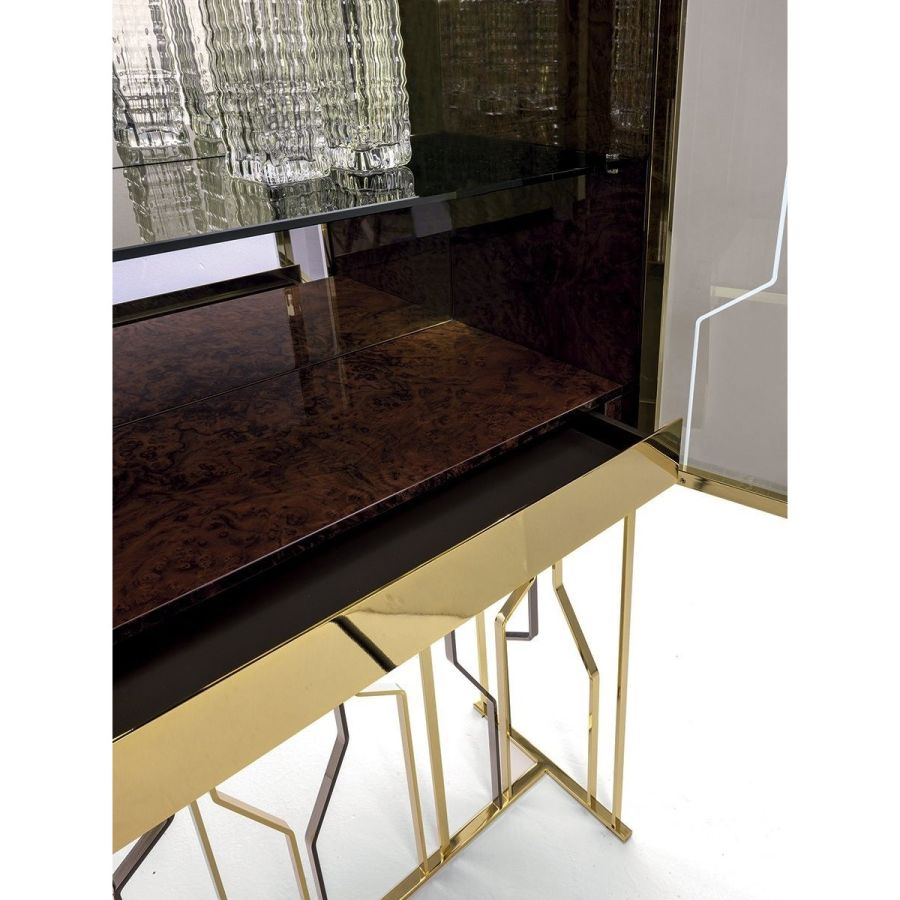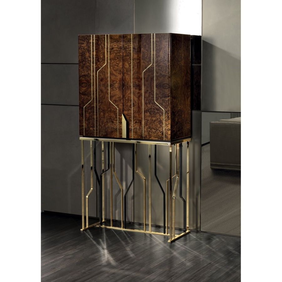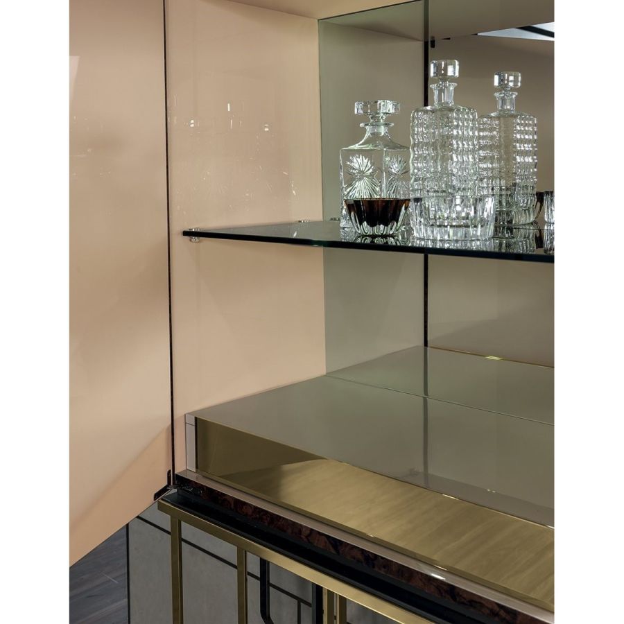 Bar unit with metal base, available in the following finishes: Satin nickel, bright shaded brown, Black Rose gold, bright light gold, matt Champagne gold, bright chrome, bright black chrome, matt satin bronze, bright pink gold, matt pink gold. Two-tone finish, upon request. A - Cabinet version completely in wood in Glossy Ebony, glossy Maple, glossy heat-treated Eucalyptus, glossy Sycamore frisè or glossy Walnut Burl with shaped metal profiles in the same finish as the base, built into the doors. Interior lacquered in glossy powder colour. The cabinet is outfitted with a drawer with metal front and a central shelf in transparent tempered glass 8mm. Rear panel in neutral mirror. Lighting with dimmable LED strip. A touch switch turns the light on. Handle in coordinated metal. Top in bronze or smoky mirror. B - Cabinet version completely covered in leather from the range, with shaped metal profiles in the same finish as the base, built into the doors. Interior lacquered in glossy powder colour. The cabinet is outfitted with a drawer with metal front and a central shelf in transparent tempered glass 8mm. Rear panel in neutral mirror. Lighting with dimmable LED strip. A touch switch turns the light on. Handle in coordinated metal.Top in bronze or smoky mirror. C - Cabinet version in bronze or smoky StopSol glass with decoration etched on the doors. Side pieces inbronze or smoky bevelled mirror. Doors with edge in metal in the same finish as the base. The cabinet isoutfitted with a drawer with metal front and a central shelf in transparent tempered glass 8mm.Interior inglossy ebony, glossy Maple, glossy heat-treated Eucalyptus, glossy Sycamore frisè or glossy Walnut Burlwood (from USA) and rear in neutral mirror. Lighting with dimmable LED strip. A touch switch turns the lighton. Handle in coordinated metal. Top in bronze or smoky mirror.