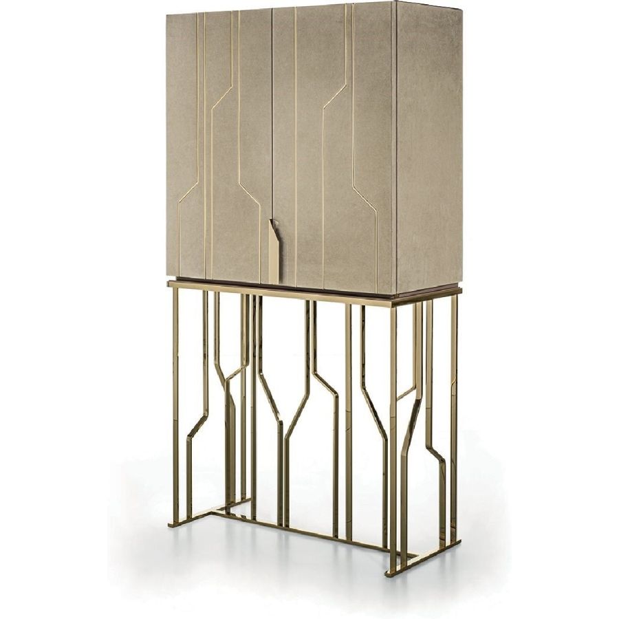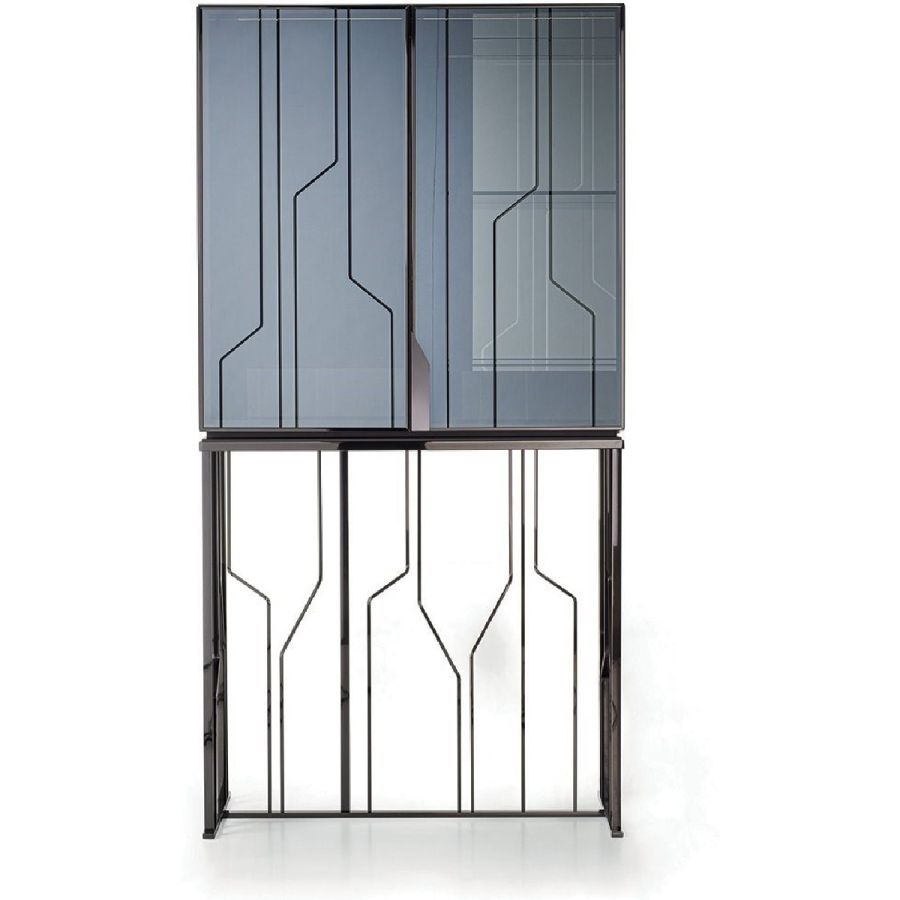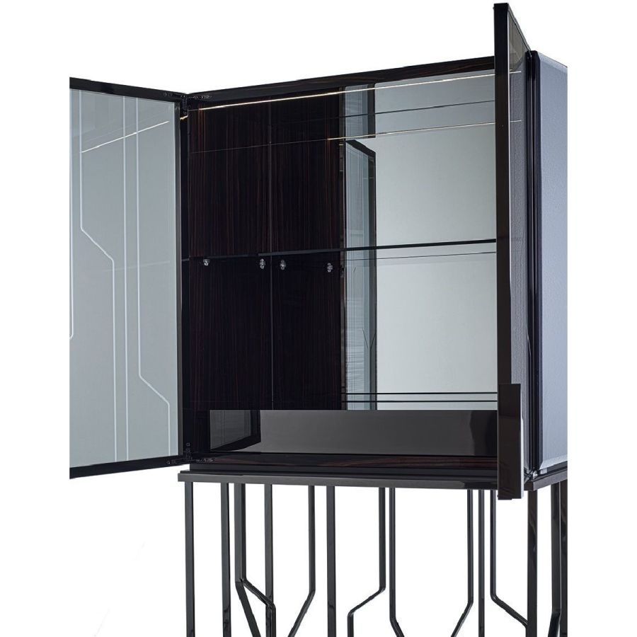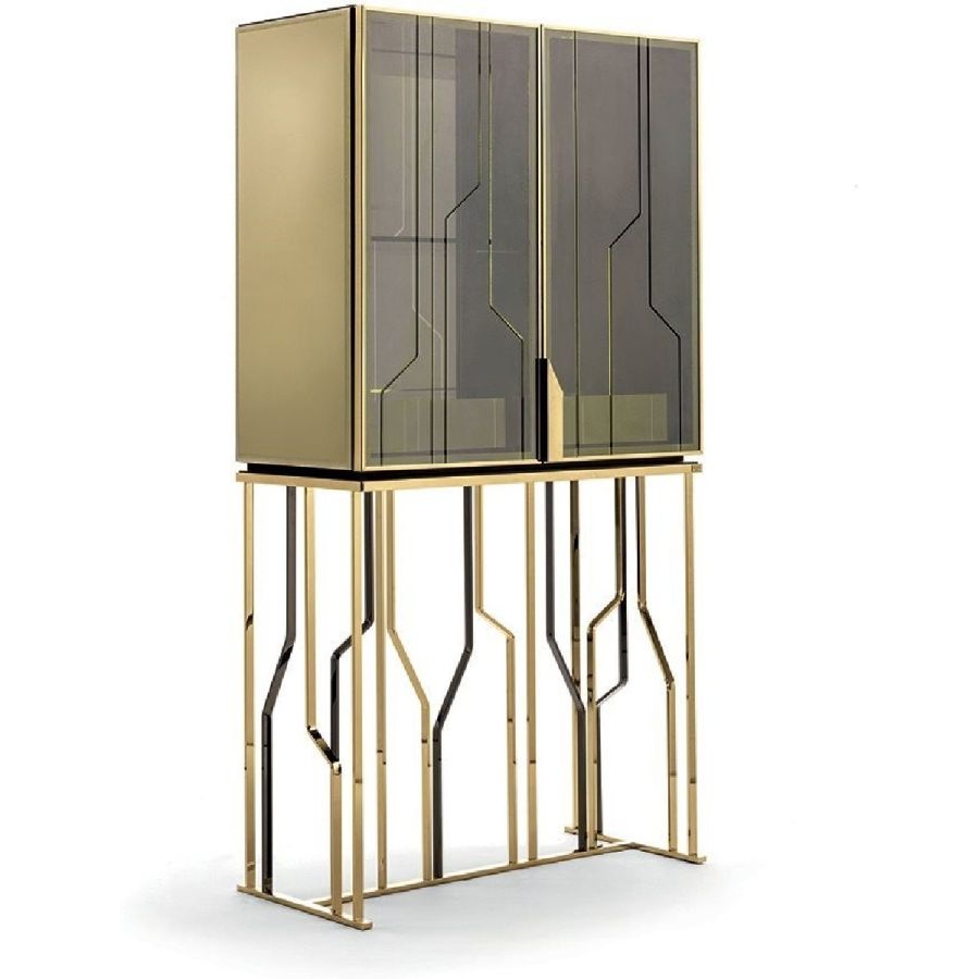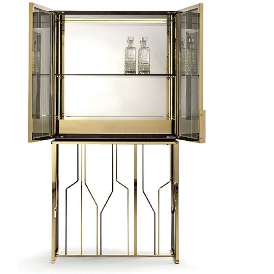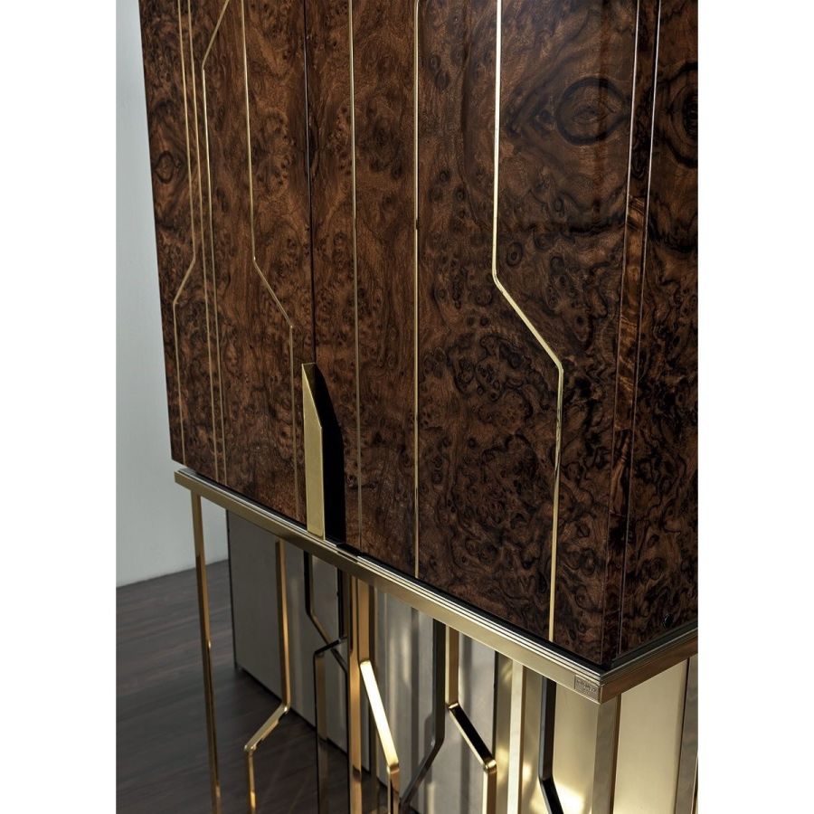 Bar unit with metal base, available in the following finishes: Satin nickel, bright shaded brown, Black Rose gold, bright light gold, matt Champagne gold, bright chrome, bright black chrome, matt satin bronze, bright pink gold, matt pink gold. Two-tone finish, upon request. A - Cabinet version completely in wood in Glossy Ebony, glossy Maple, glossy heat-treated Eucalyptus, glossy Sycamore frisè or glossy Walnut Burl with shaped metal profiles in the same finish as the base, built into the doors. Interior lacquered in glossy powder colour. The cabinet is outfitted with a drawer with metal front and a central shelf in transparent tempered glass 8mm. Rear panel in neutral mirror. Lighting with dimmable LED strip. A touch switch turns the light on. Handle in coordinated metal. Top in bronze or smoky mirror. B - Cabinet version completely covered in leather from the range, with shaped metal profiles in the same finish as the base, built into the doors. Interior lacquered in glossy powder colour. The cabinet is outfitted with a drawer with metal front and a central shelf in transparent tempered glass 8mm. Rear panel in neutral mirror. Lighting with dimmable LED strip. A touch switch turns the light on. Handle in coordinated metal.Top in bronze or smoky mirror. C - Cabinet version in bronze or smoky StopSol glass with decoration etched on the doors. Side pieces inbronze or smoky bevelled mirror. Doors with edge in metal in the same finish as the base. The cabinet isoutfitted with a drawer with metal front and a central shelf in transparent tempered glass 8mm.Interior inglossy ebony, glossy Maple, glossy heat-treated Eucalyptus, glossy Sycamore frisè or glossy Walnut Burlwood (from USA) and rear in neutral mirror. Lighting with dimmable LED strip. A touch switch turns the lighton. Handle in coordinated metal. Top in bronze or smoky mirror.