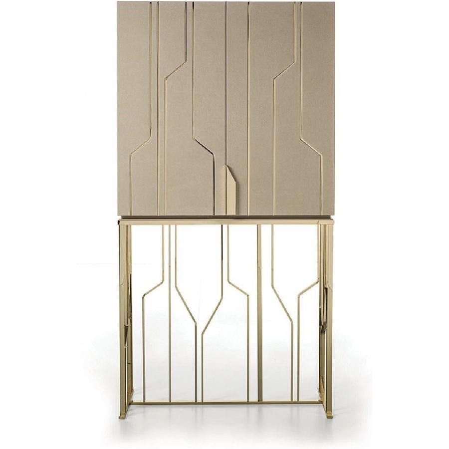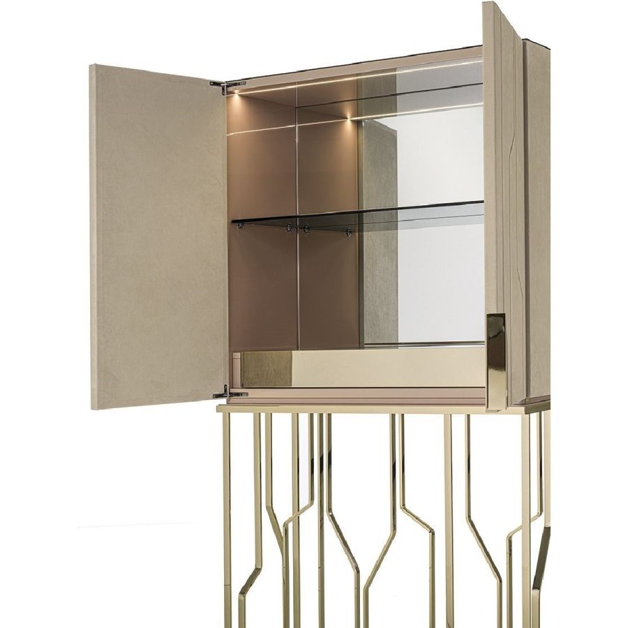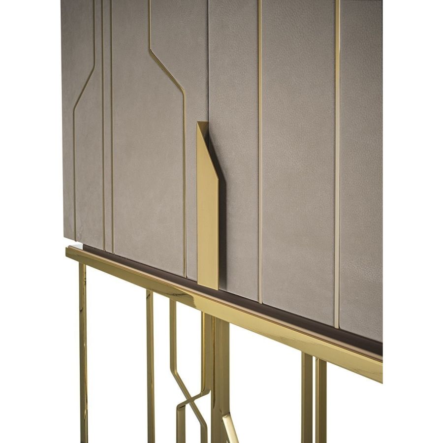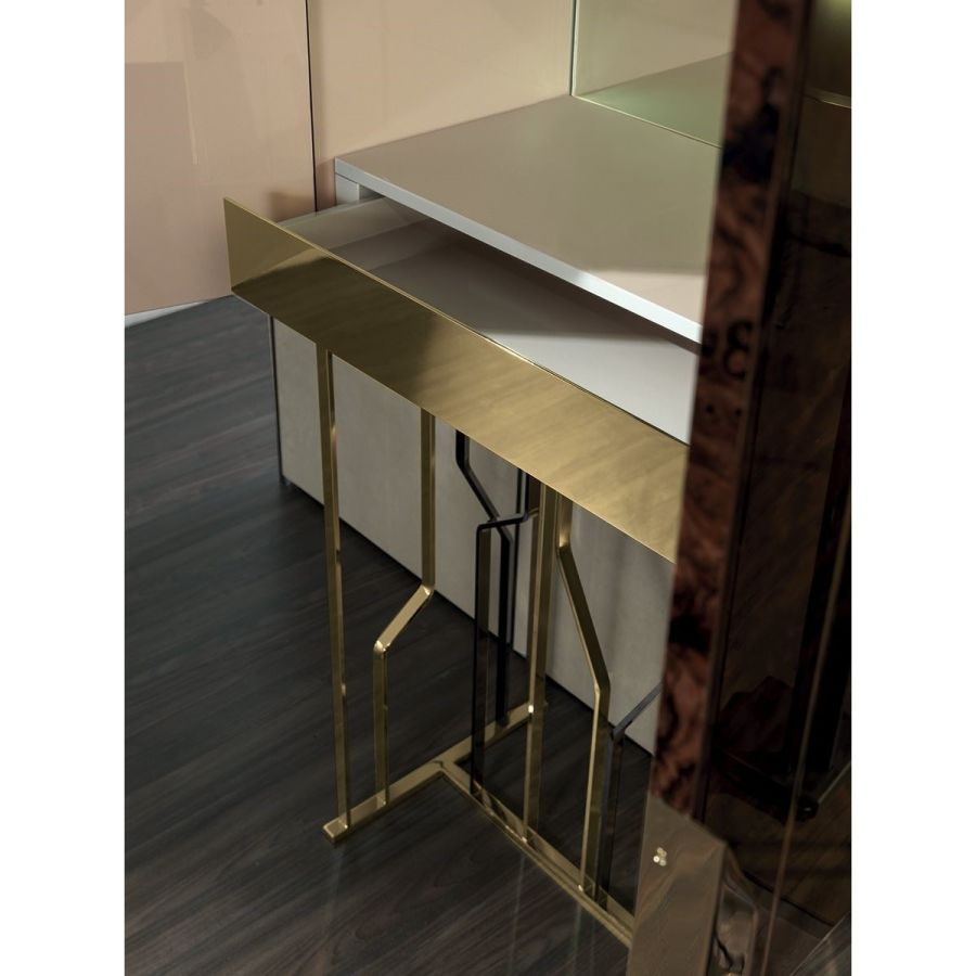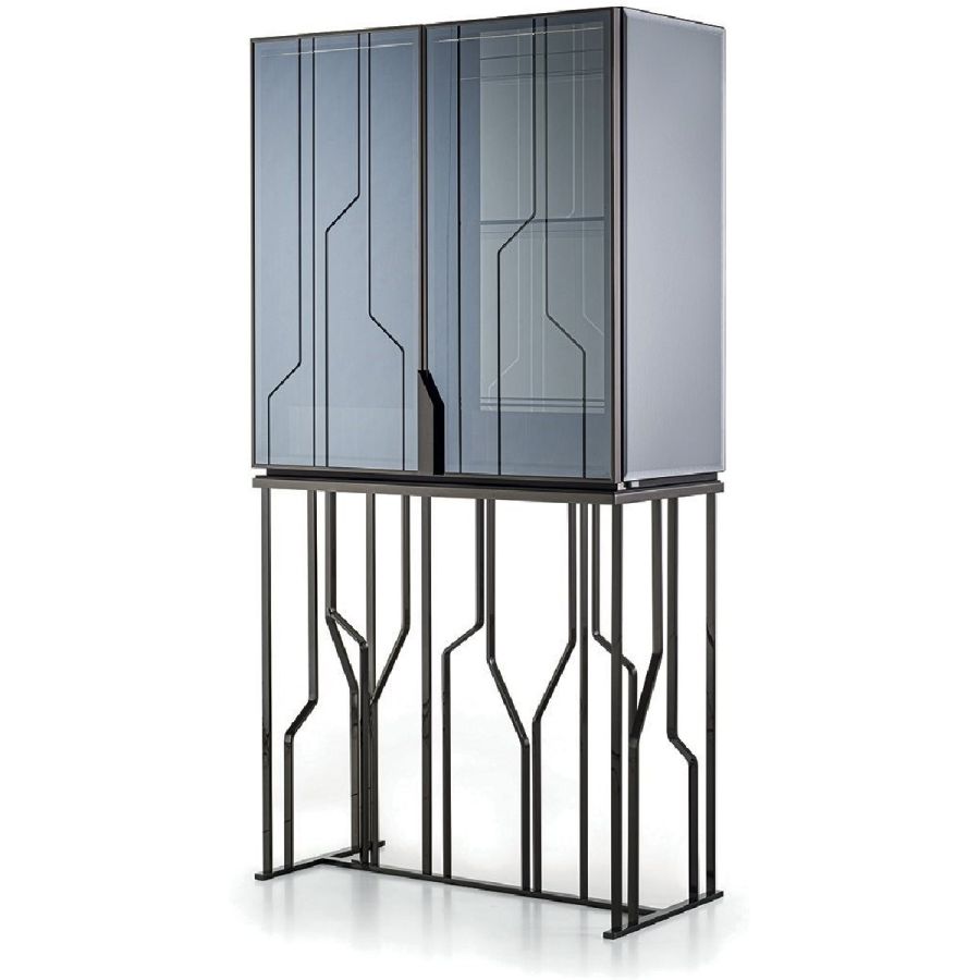 Bar unit with metal base, available in the following finishes: Satin nickel, bright shaded brown, Black Rose gold, bright light gold, matt Champagne gold, bright chrome, bright black chrome, matt satin bronze, bright pink gold, matt pink gold. Two-tone finish, upon request. A - Cabinet version completely in wood in Glossy Ebony, glossy Maple, glossy heat-treated Eucalyptus, glossy Sycamore frisè or glossy Walnut Burl with shaped metal profiles in the same finish as the base, built into the doors. Interior lacquered in glossy powder colour. The cabinet is outfitted with a drawer with metal front and a central shelf in transparent tempered glass 8mm. Rear panel in neutral mirror. Lighting with dimmable LED strip. A touch switch turns the light on. Handle in coordinated metal. Top in bronze or smoky mirror. B - Cabinet version completely covered in leather from the range, with shaped metal profiles in the same finish as the base, built into the doors. Interior lacquered in glossy powder colour. The cabinet is outfitted with a drawer with metal front and a central shelf in transparent tempered glass 8mm. Rear panel in neutral mirror. Lighting with dimmable LED strip. A touch switch turns the light on. Handle in coordinated metal.Top in bronze or smoky mirror. C - Cabinet version in bronze or smoky StopSol glass with decoration etched on the doors. Side pieces inbronze or smoky bevelled mirror. Doors with edge in metal in the same finish as the base. The cabinet isoutfitted with a drawer with metal front and a central shelf in transparent tempered glass 8mm.Interior inglossy ebony, glossy Maple, glossy heat-treated Eucalyptus, glossy Sycamore frisè or glossy Walnut Burlwood (from USA) and rear in neutral mirror. Lighting with dimmable LED strip. A touch switch turns the lighton. Handle in coordinated metal. Top in bronze or smoky mirror.