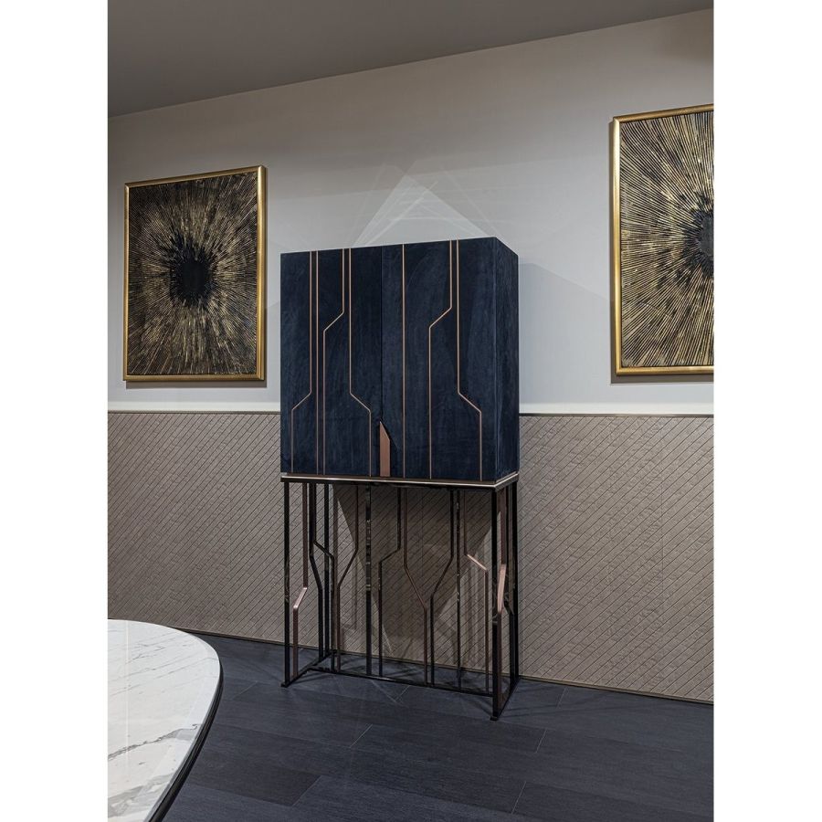 A must from the Loveluxe collection, this prestigious series by Alessandro La Spada, with its unmistakable style. A tall bar unit with carefully crafted details and precious finishes: noble woods like burl, soft leathers with doors decorated by thin metal inserts, supported by a characteristic base decorated with polished or matt metal rods that recall stylised “flash” symbols: the distinguishing mark of the entire Ginza series.