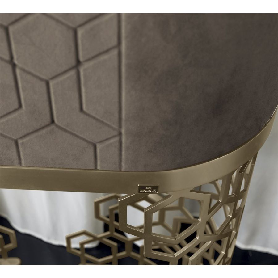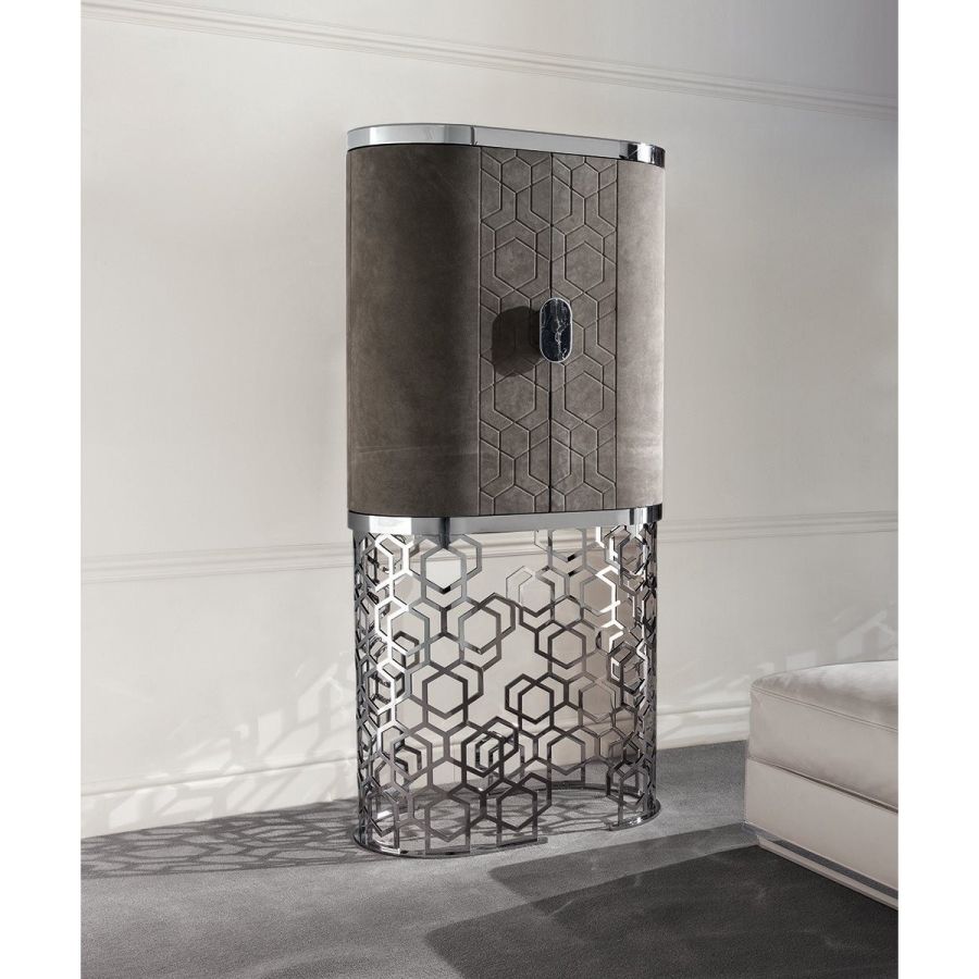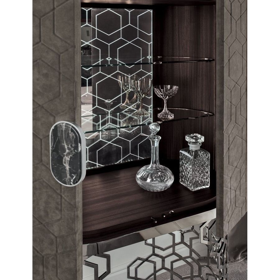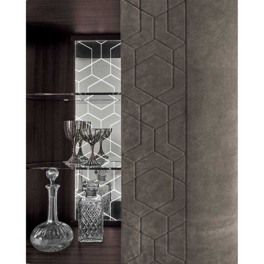 Minibar unit with ground metal base, laser cut with “Sequence” decoration and calendered. Base finish: Satin nickel, bright shaded brown, Black Rose gold, bright light gold, matt Champagne gold, bright chrome, bright black chrome, matt satin bronze, bright pink gold, matt pink gold. Bar unit fully coverd in leather or cashmere from the Loro Piana Interiors catalogue. Handle in marble from the range. Dark stained zebranowood internal finish, clear glass shelves, lasered mirror with illuminated decoration. The 3D effect door coveringwith raised “Diamond” or “Sequence” decoration is only available in the P.3 Cat. Miami/SoftLeather/Suede/TecSuede range. Top surface finish: 5mm bronze or smoky bevelled mirror.