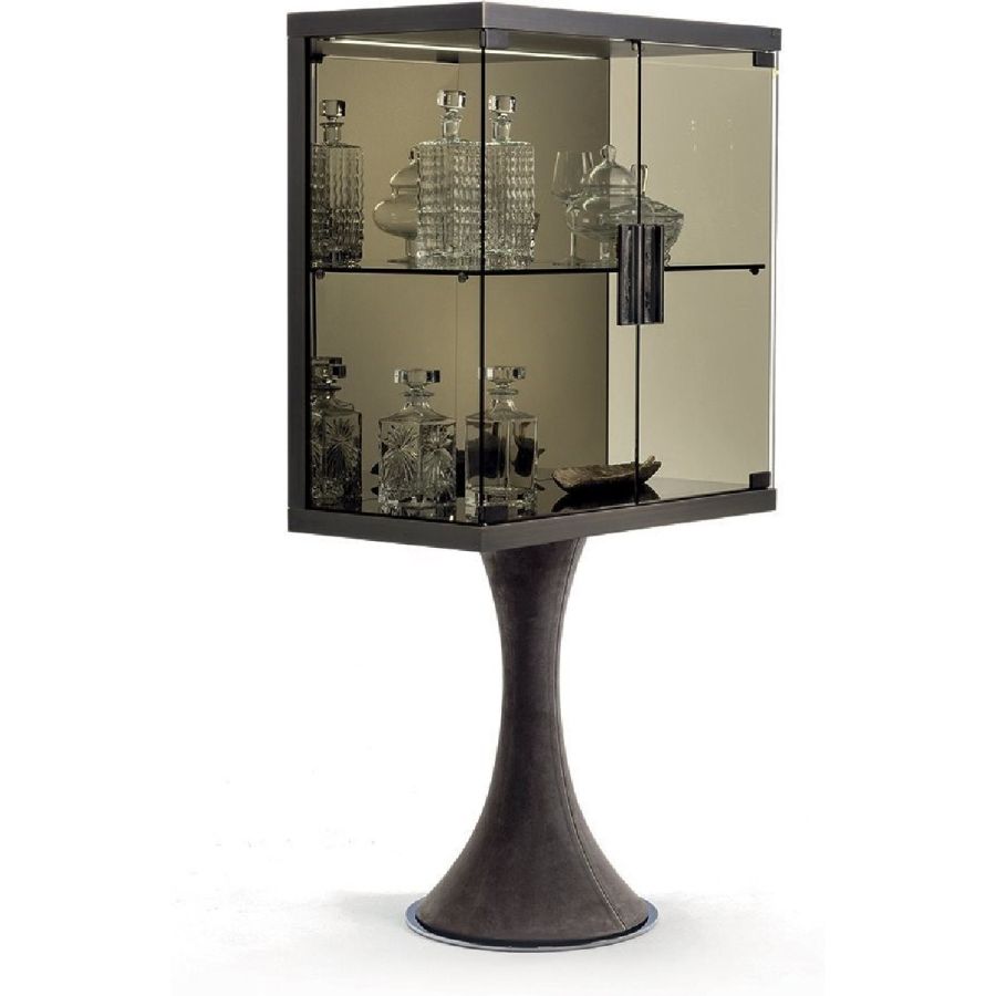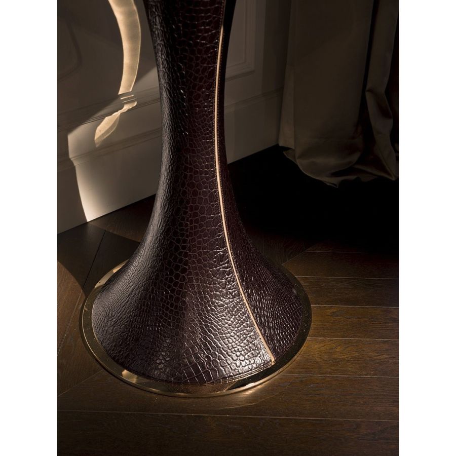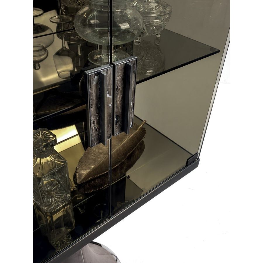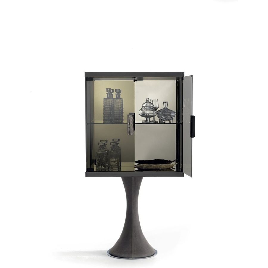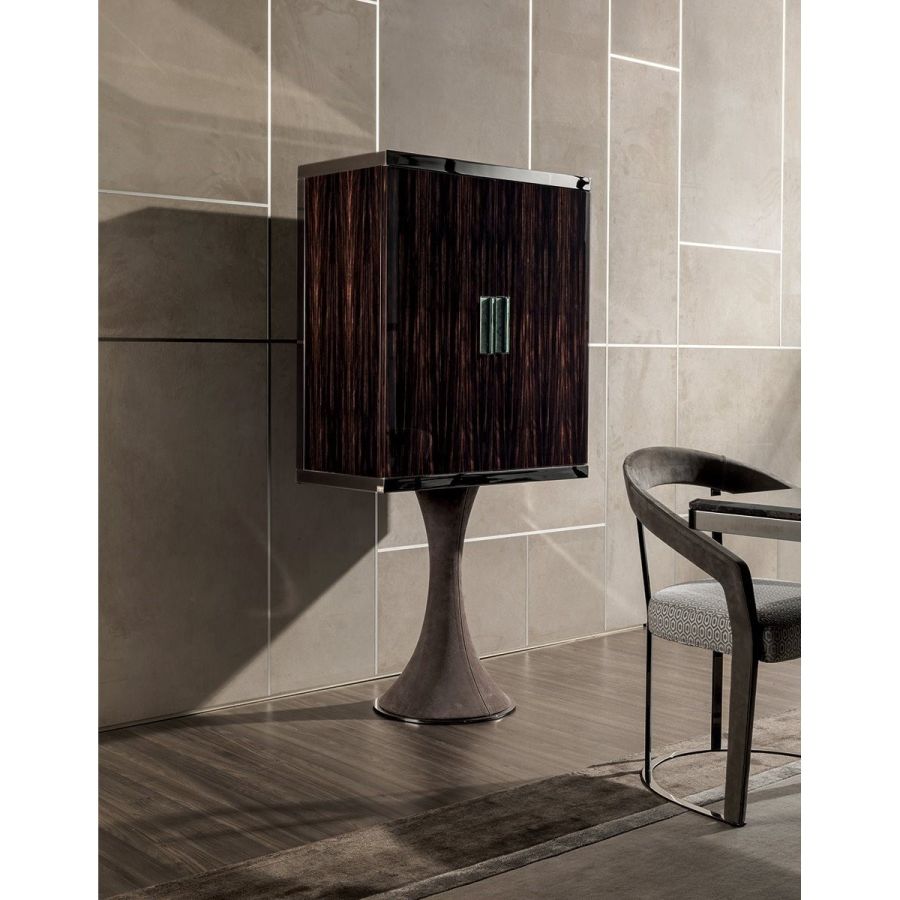 Series of cabinets with hyperboloid shaped base in glass fibre, with internal structure in painted metal, covered in range leathers. A/B - Cupboard in wood or leather: Wood cabinet: glossy/matt Maple, glossy/matt heat-treated Eucalyptus, glossy/matt ebony, glossy/matt Canaletto walnut, glossy/matt Sycamore frisè, glossy walnut burl wood.Doors in the same wood as the cabinet structure or covered in leather from the range. Interior covered incat. P.3 Miami/SoftLeather/Suede leather, the cabinet is outfitted with a drawer with metal front and a central shelf in transparent tempered glass 8mm. Rear in neutral mirror. Lighting with dimmable LED strip. A touch switch turns the light on. Handles in metal with insert in marble from the range. Edges and underbase plate in metal in the finishes: Satin nickel, bright shaded brown, Black Rose gold, bright light gold, matt Champagne gold, bright chrome, bright black chrome, matt satin bronze, bright pink gold, matt pink gold. 4 mm bronze or smoky mirror top with bevel. C - Display case: Cabinet with sides and door in tempered bronze or smoky glass (cabinet back in lacquered wood). The cabinet is outfitted with a central shelf in transparent tempered glass 8mm. Rear in neutral mirror. Lighting with dimmable LED strip. A touch switch turns the light on. Handles in metal with insert in marble from the range. Edges and underbase plate in metal in the finishes: Satin nickel, bright shaded brown, Black Rose gold, bright light gold, matt Champagne gold, bright chrome, bright black chrome, matt satin bronze, bright pink gold, matt pink gold. 4 mm bronze or smoky mirror top with bevel.