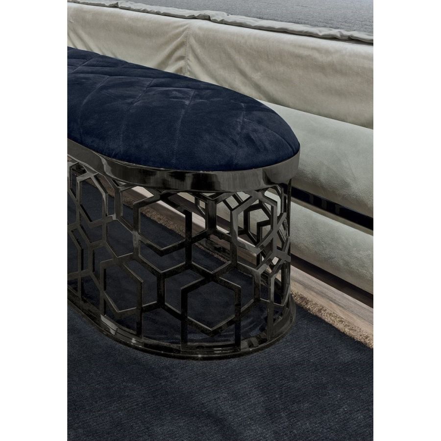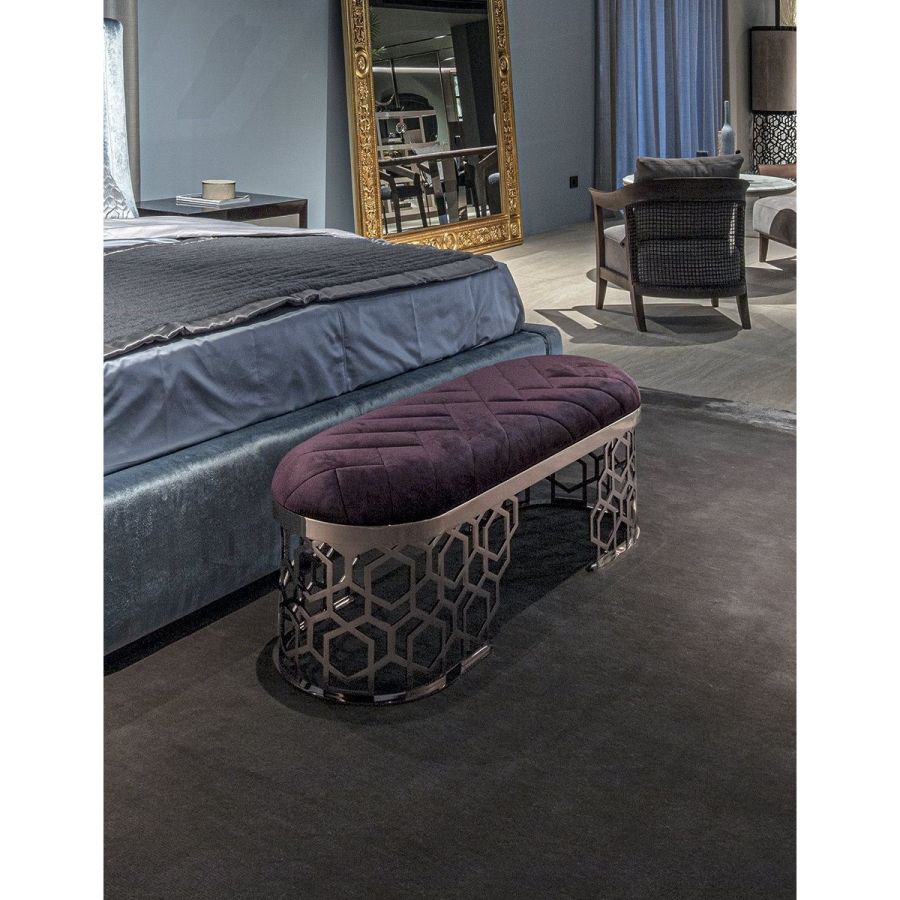 Amanda belongs to a family of accessories with an unmistakable personality due to the “Sequence” decoration on the base. “Sequence” is a perforated pattern that looks like the result of a manual process but is actually the result of a sophisticated laser cutting process. The “beehive” decoration, by Giuseppe Iasparra, is a style, an authentic iconographic pattern that appears on several pieces in the Loveluxe collection - including tables, furniture and boiserie panels. It is an authentic expression of the Longhi personality. This bench is a useful furnishing complement, designed to be provide seating and also give a particular touch to the bedroom.