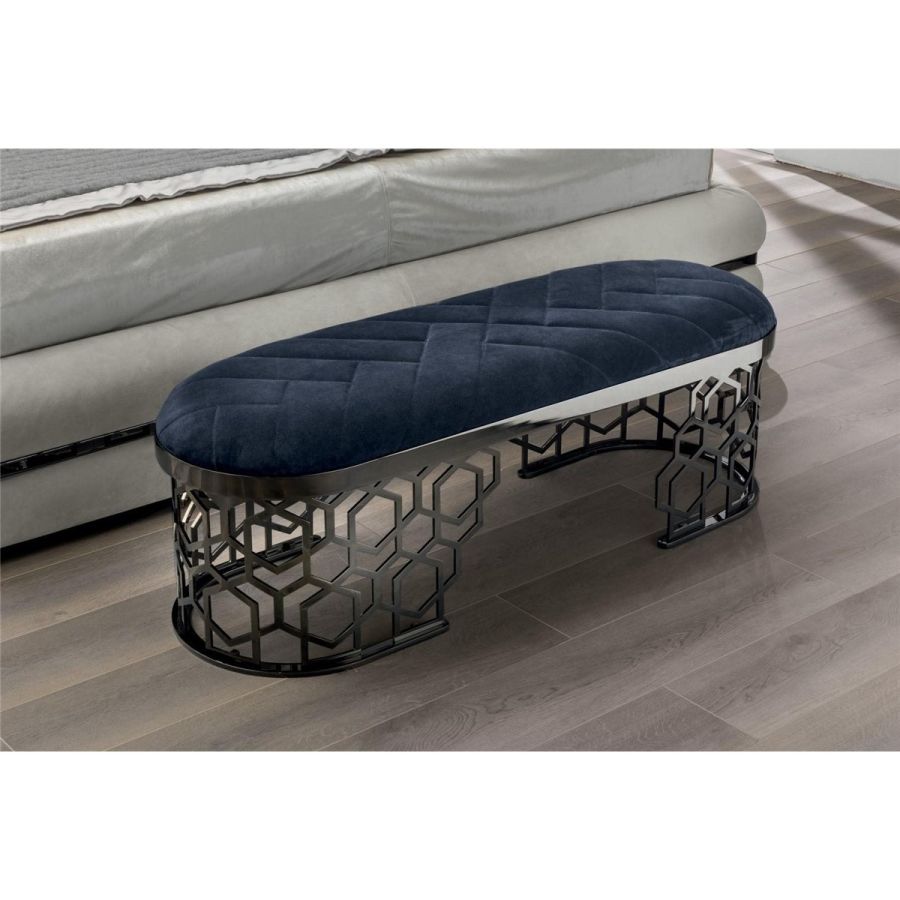 Bench with seat in medium density polyurethane foam with quilted or smooth decoration, in range colours.Non-removable upholstery.Base in calendared laser-cut ground metal with “Sequence” decoration.Frame finish:- Black Rose gold,- bright shaded brown, bright light gold,- matt Champagne gold,- bright chrome,- bright black chrome,- matt satin bronze,- bright pink gold,- matt pink gold.