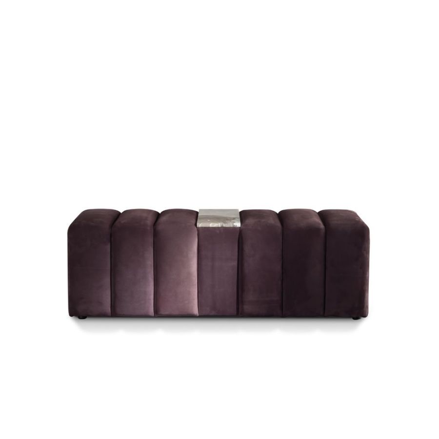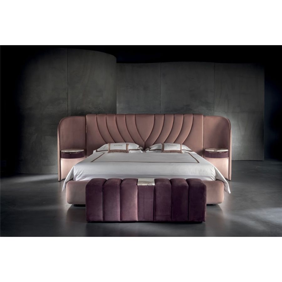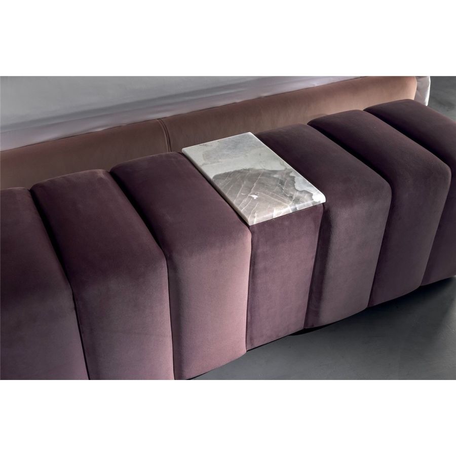Volumes and ridges alternate to form the Arianna bench, much like the pattern on the headboard. A marble surface at the centre of the seat adds beauty to the volumes.