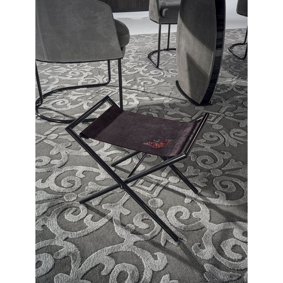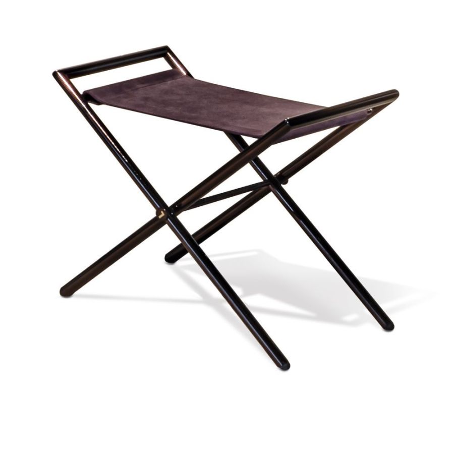 Closable bag holder in steel in the finishes: bright shaded brown, Black Rose gold, bright shaded brown, bright light gold, matt Champagne gold, bright chrome, bright black chrome, matt satin bronze, bright pink gold, matt pink gold.The luggage rack is formed from a strip of P.3 Suede leather with or without the embroidery. This is a versatile furnishing element that can be placed in any corner or room, near the dining table or in the bedroom, as a simple utility element for holding objects.