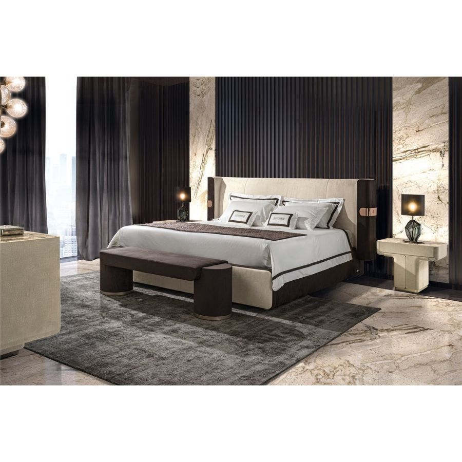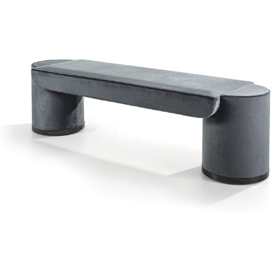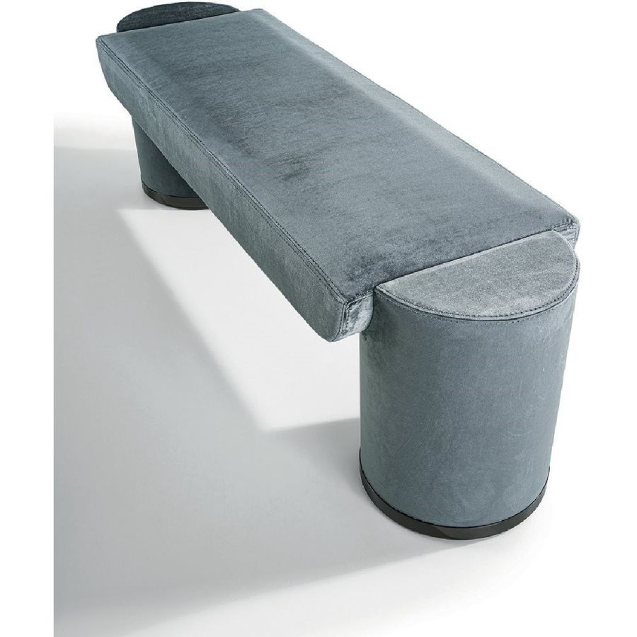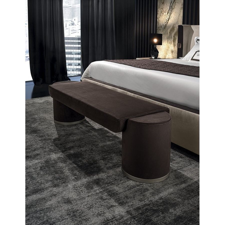 A bridge-style bench with architectural volumes, featuring soft and generous forms. The Mi bench is designed to be positioned in the bedroom and paired with the Mi bed.
