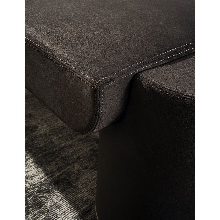 Frame in wood covered in medium thickness rigid polyurethane foam. A metal ring decorates the base, offered in the following finishes: Black Rose gold, bright shaded brown, bright light gold, matt Champagne gold, bright chrome, bright black chrome, matt satin bronze, bright pink gold, matt pink gold. Leather and fabric upholstery is NOT removable.