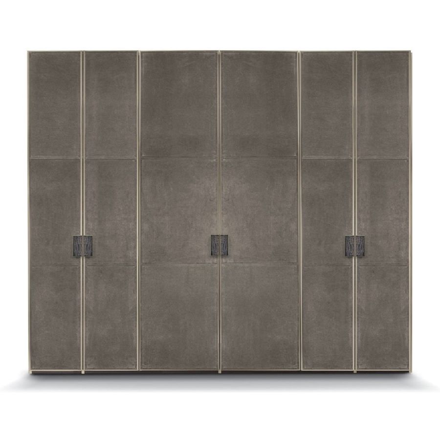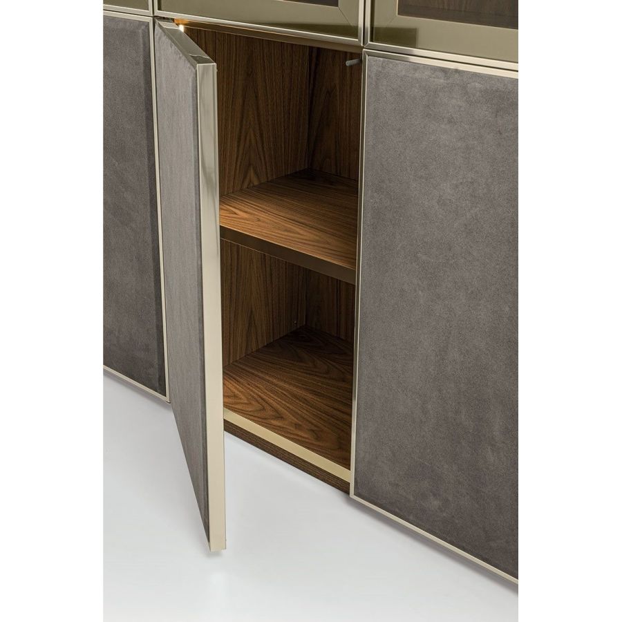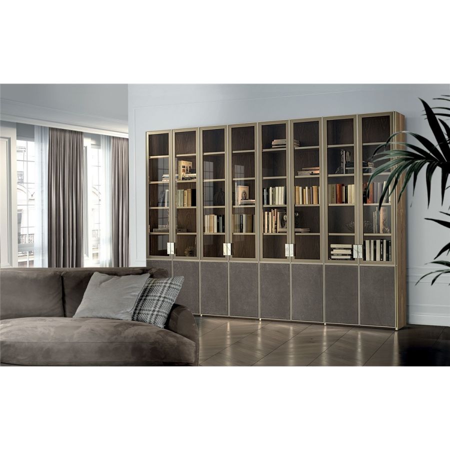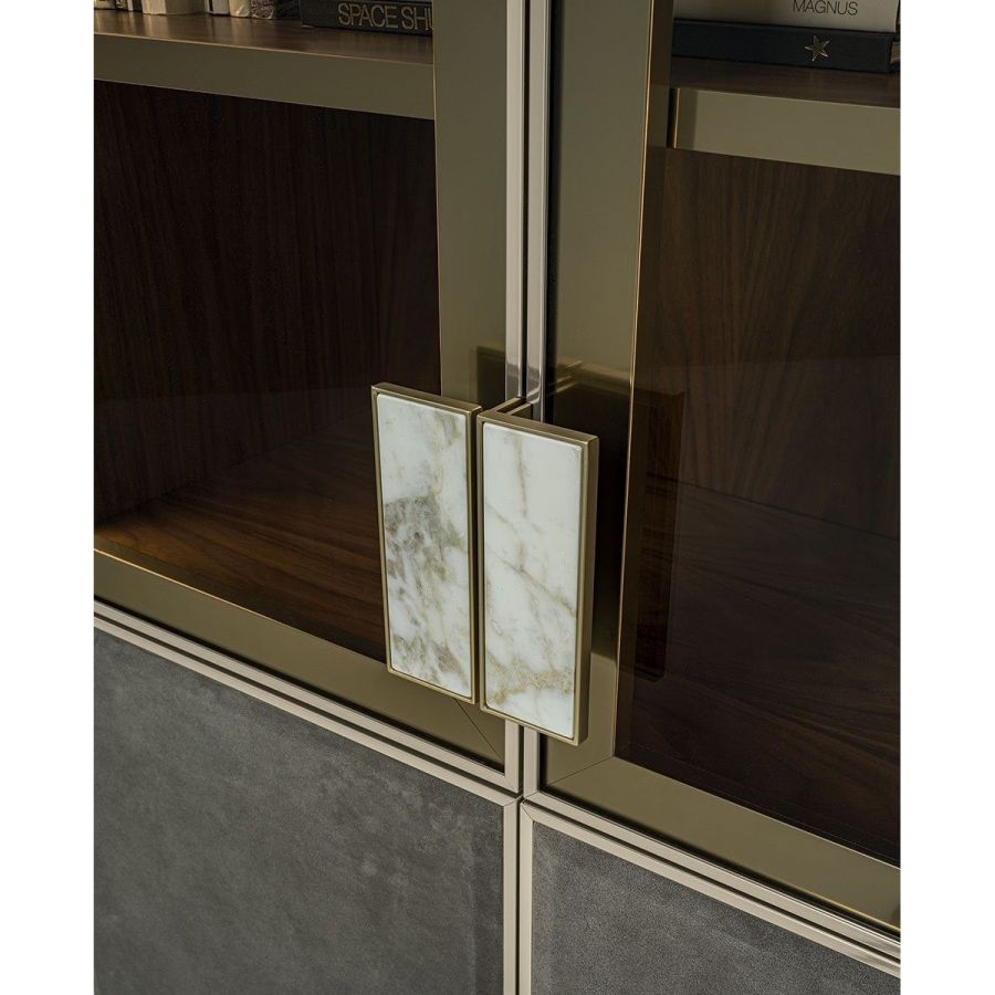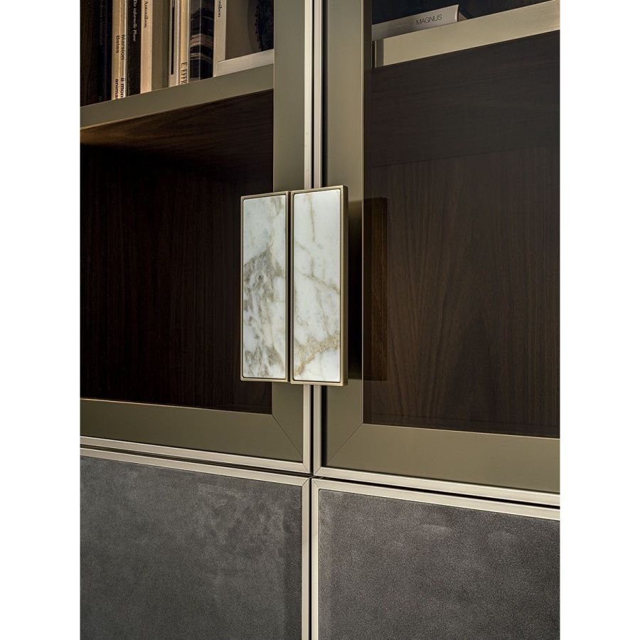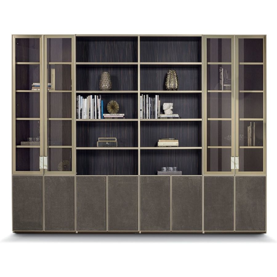Ianus Middle is a modular system for building equipped partition walls with open compartments, chests of drawers, shelves and small doors that can be inserted to perfectly complete the modular nature of the boiserie panels and the doors. The structure is in veneered wood in the finishes: matt tinted Zebrano wood, matt Canaletto walnut, matt Newood Ebony or closed pore matt lacquer. Front edges of modules and door profiles are in anodized aluminium finishes, as follows: Matt Platinum, Matt satin bronze, Bright Aluminium, Bright Champagne Gold, Bright dark brown electrocolour. The shelves are in dark matt tinted Zebrano wood, matt Canaletto walnut, matt Newood Ebony, closed pore matt lacquer, covered in P.3 Cat. Suede or Tecsuede, or in natural, bronzed, or smoky 8 mm glass. Drawer fronts are covered in leather P.3 Cat. Suede or Tecsuede. Drawer interior bottoms are in wood or lined with leather P.3 Cat. Suede or Tecsuede. The side panels have LED lighting over their entire height. The system includes a special 180 cm module customizable for the TV. NOTE_the side panel includes an adjustable foot.