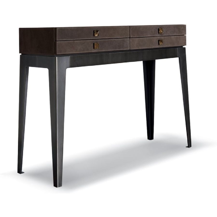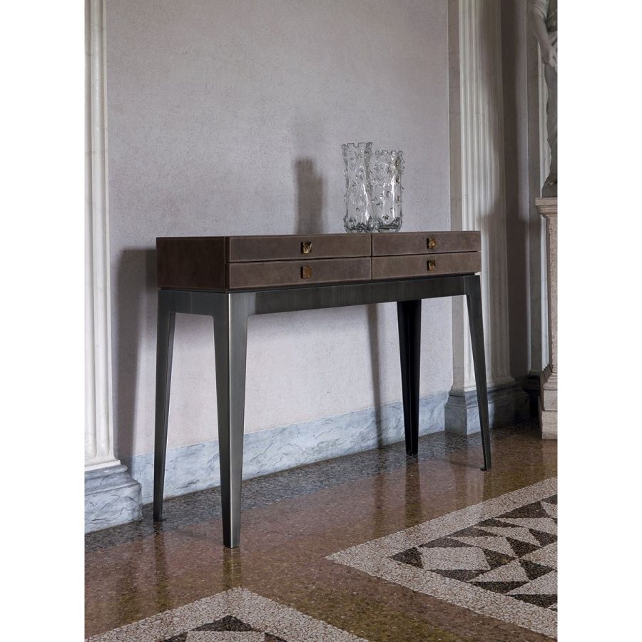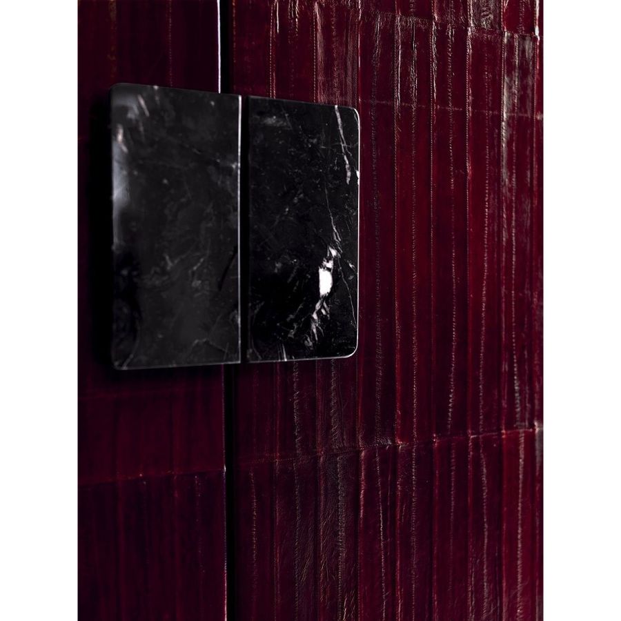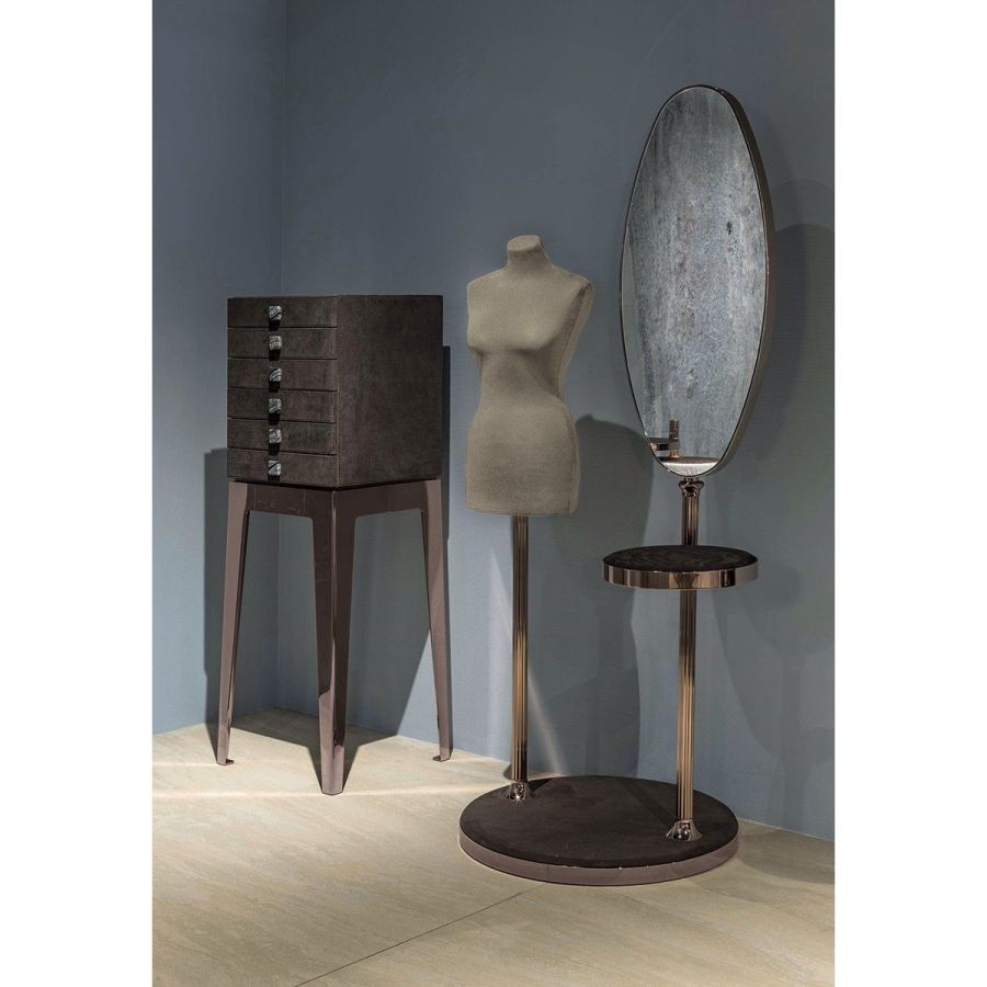 Wood accessories, finished in: glossy lacquered wood in range colours, glossy/matt Maple, glossy/matt heat-treated Eucalyptus, glossy/matt Sycamore frisè, glossy/matt Ebony, glossy/matt Canaletto walnut, glossy walnut burl wood. Completely covered in leather or cashmere from the Loro Piana Interiors catalogue, marble handles. Base of ground metal, laser cut with finishes in: Satin nickel, bright shaded brown, Black Rose gold, bright light gold, matt Champagne gold, bright chrome, bright black chrome, matt satin bronze, bright pink gold, matt pink gold. Handle: in marble of client’s choice, bronzed metal or bright black chrome. Available versions: A - Entirely covered in leather from the catalogue, B - Entirely in wood, C - Wooden structure and front drawers covered in leather from the catalogue (price on request).
