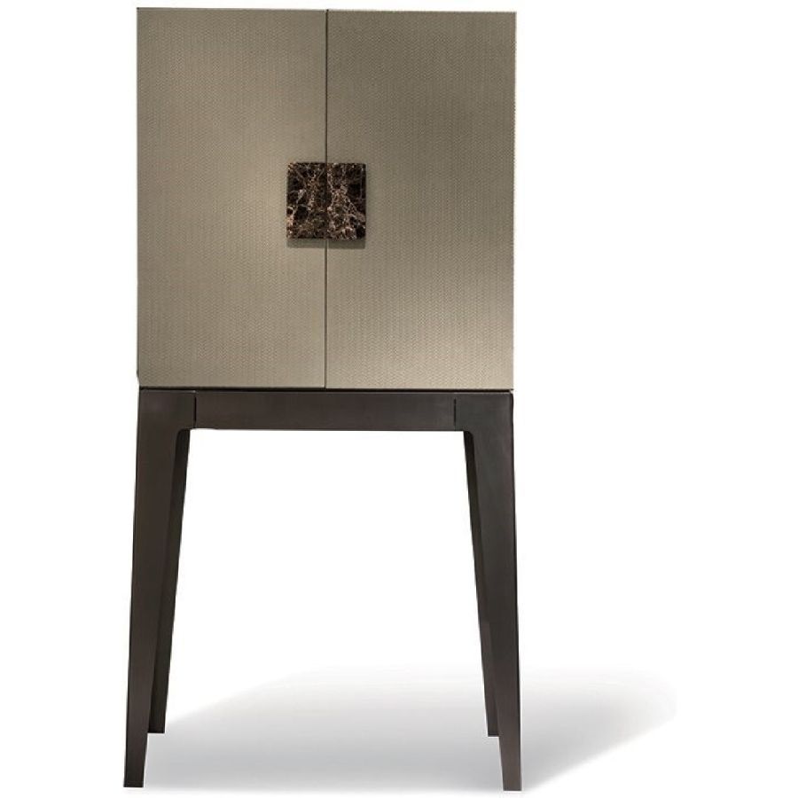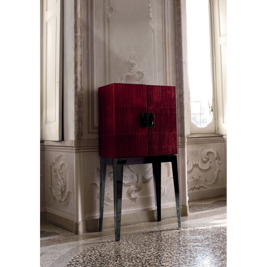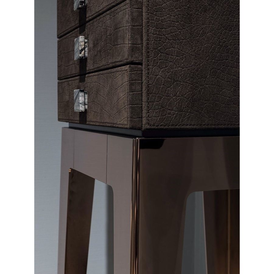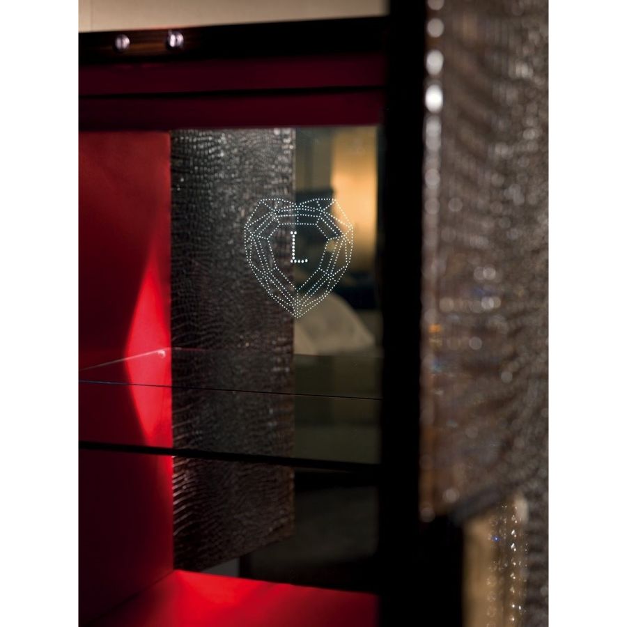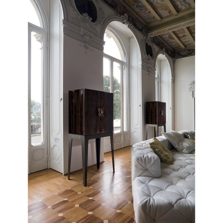 Wood cabinet, finished in: glossy lacquered wood in range colours, glossy/matt Maple, glossy/matt heat-treated Eucalyptus, glossy/matt Sycamore frisè, glossy/matt Ebony, glossy/matt Canaletto walnut, glossy walnut burl wood. Wood doors covered in leather or cashmere from the Loro Piana Interiors catalogue, marble handles. Interior covered in satin with a glass shelf and lit with led. Base of ground metal, laser cut with finishes in: Satin nickel, bright shaded brown, Black Rose gold, bright light gold, matt Champagne gold, bright chrome, bright black chrome, matt satin bronze, bright pink gold, matt pink gold.