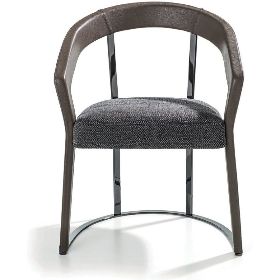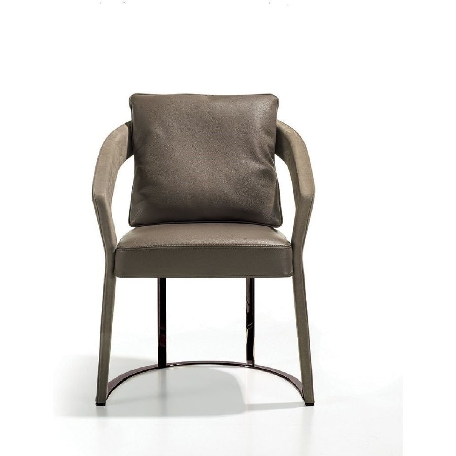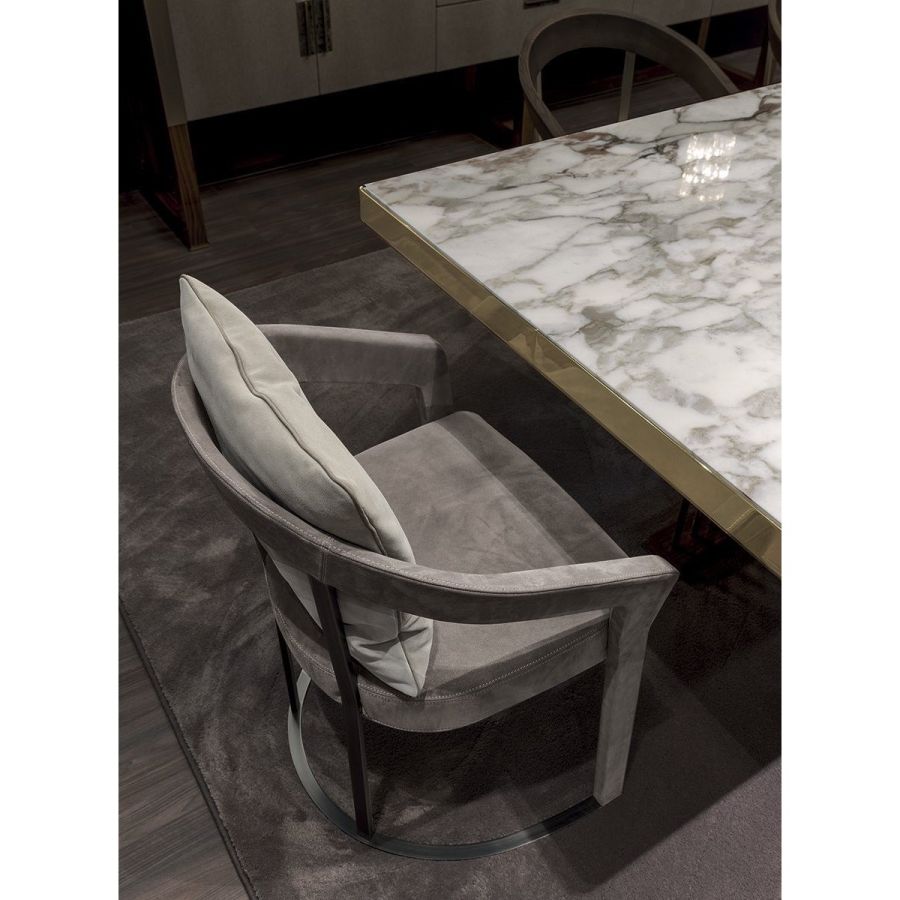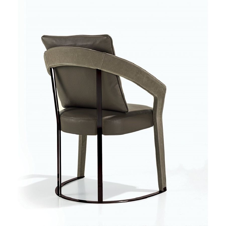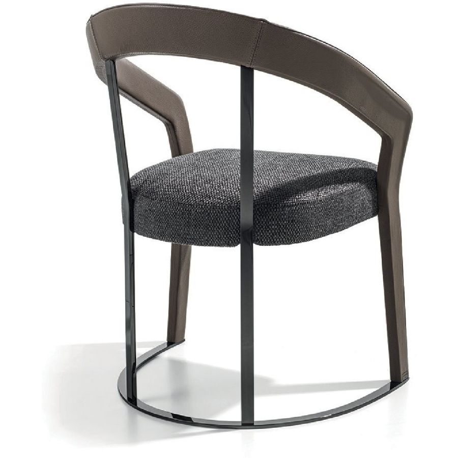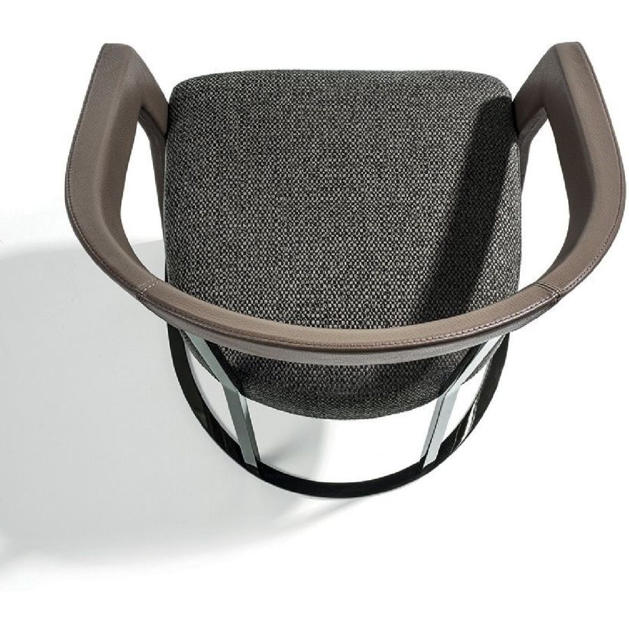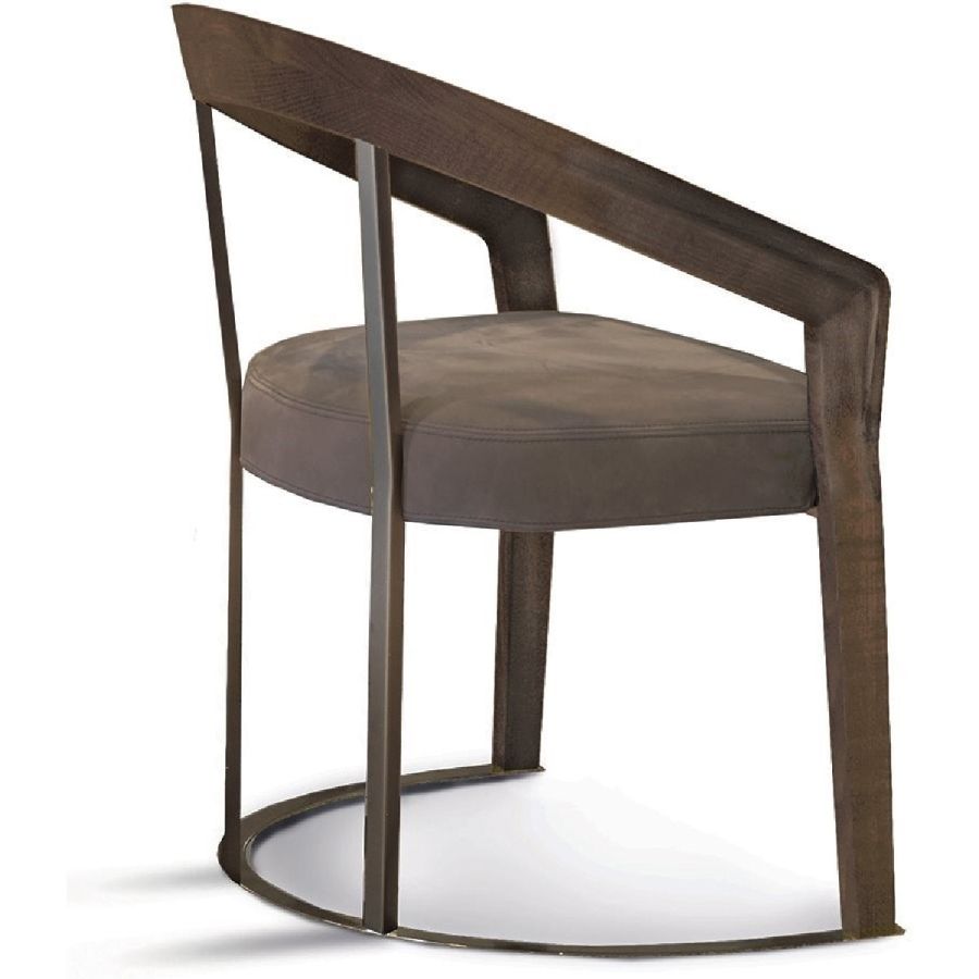 This chair and small armchair have soft, elegant lines that recall chairs made in the 1940s, with a solid wood structure in ash wood and a soft padded seat. The moulded, shaped and curved wood of the armrests communicates a reinterpretation in modern style of shapes of yesteryear. The backrest and base supports are in metal. The chair can be accompanied with a comfortable lumbar cushion.