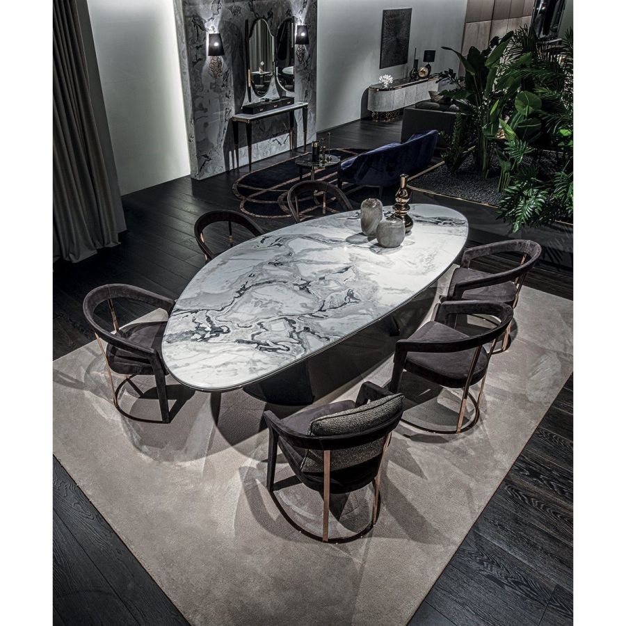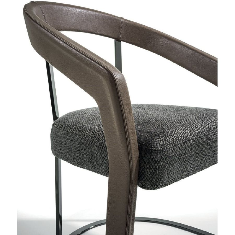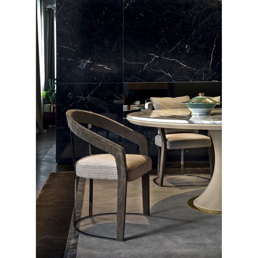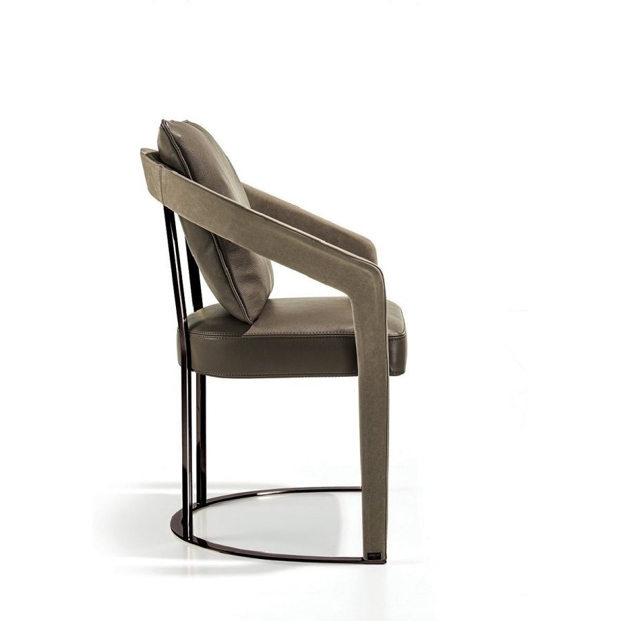Seat in double density polyurethane foam. Backrest cushion (optional) in sterilised goose down. non-removable upholstery. The frame is in solid ash wood moulded and shaped with CNC machines. Painted withwater-based colors in black, Mink brown, wengé, ebony, walnut or natural ash wood. The base and back rest support are in laser cut ground metal in the finishes: Satin nickel, bright shaded brown, bright light gold, matt Champagne gold, bright chrome, bright black chrome, matt satin bronze, bright pink gold, matt pink gold, Black Rose gold. The moulded structure can be covered in leather in range colours.