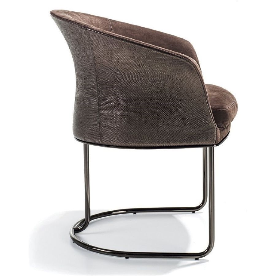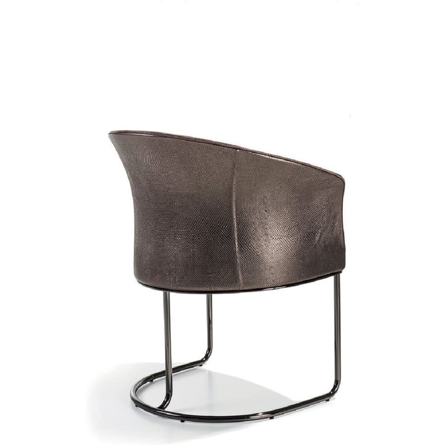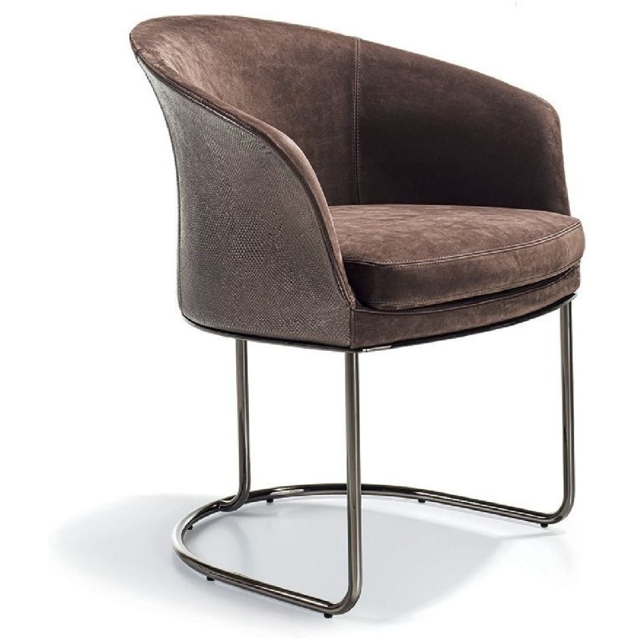 Chair offered in two versions: low backrest and wing-backed. The internal metal structure is cold-mouldedin foam. The seat cushion is in double density polyurethane foam covered in polyester fibre bonded with non-woven fabric. The base is in curved tubular metal assembled with a laser cut metal plate with the following finishes: Satin nickel, bright shaded brown, Black Rose gold, bright light gold, matt Champagne gold, bright chrome, bright black chrome, matt satin bronze, bright pink gold, matt pink gold. The upholstery CANNOT be removed from the structure, but the cushion covers in leather or fabric are removable.