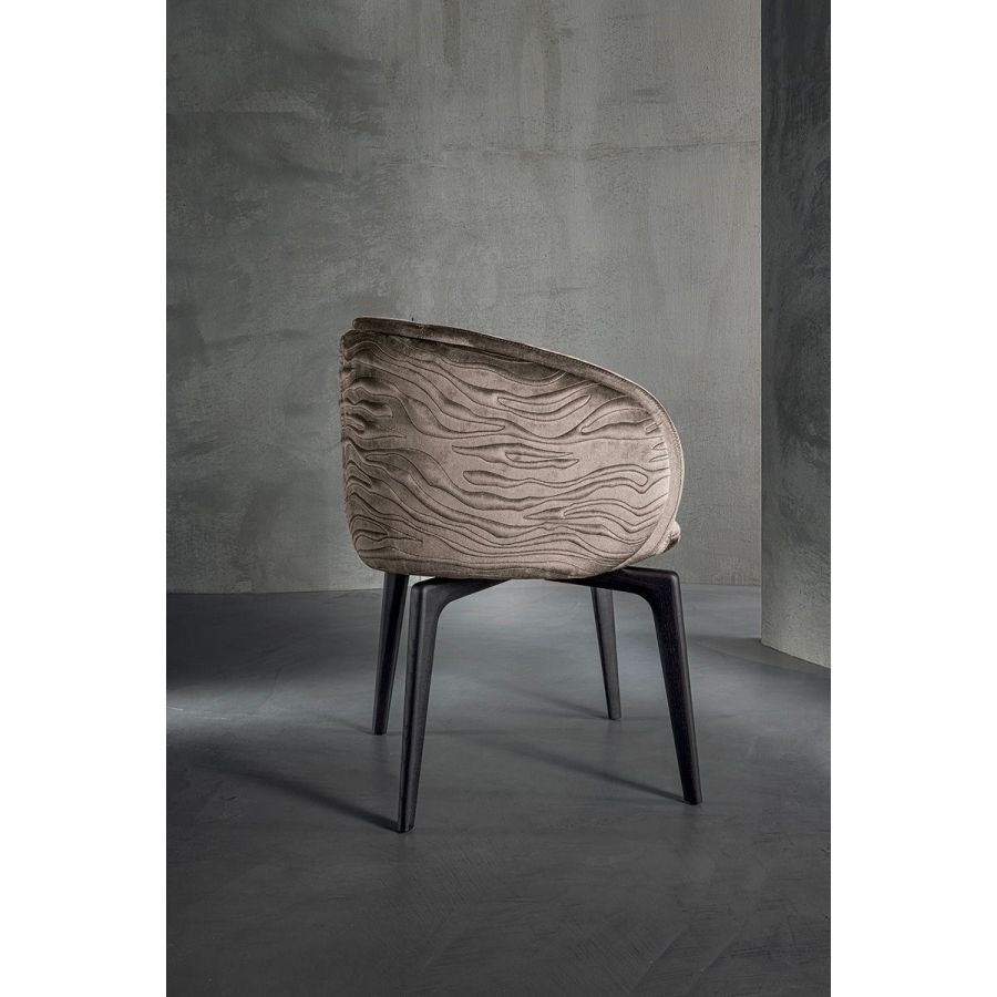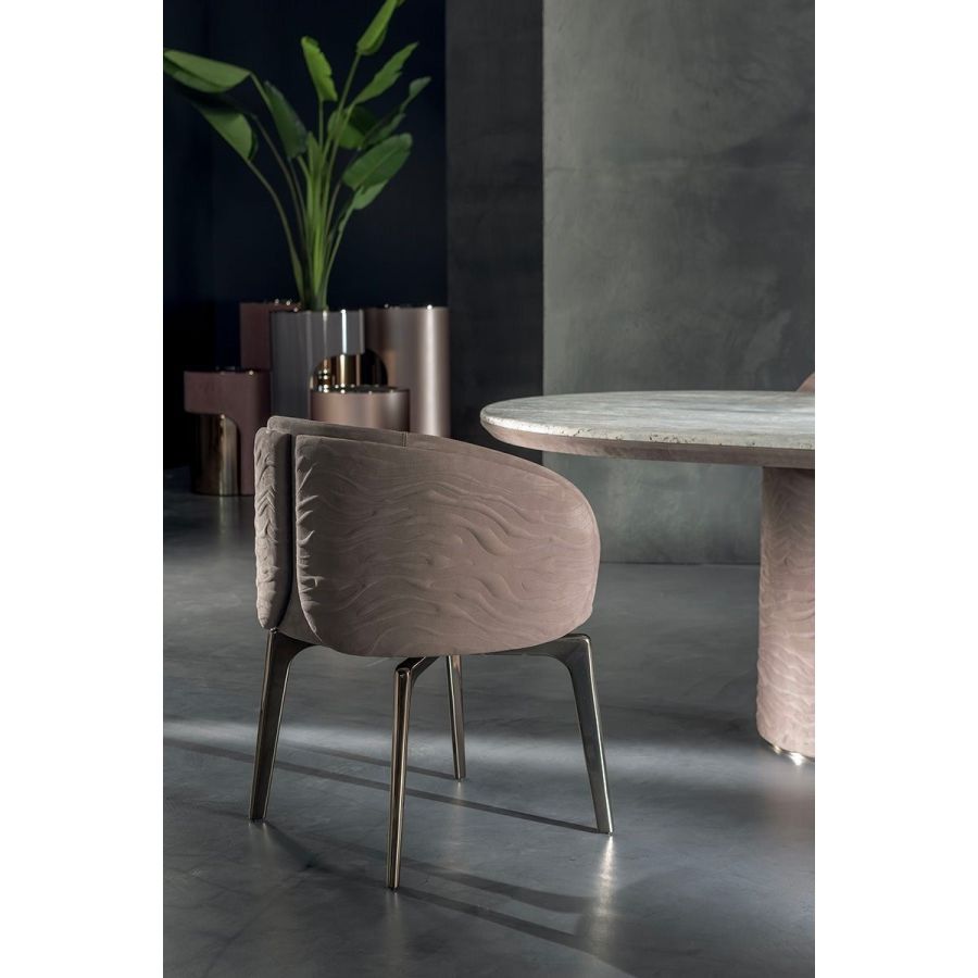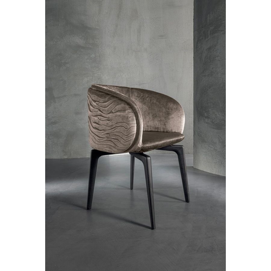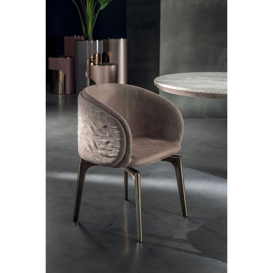 The chair’s frame is made from aluminium covered in polyurethane foam and injected into a mould. The external covers, on the structure’s either sides are made from curved plywood with a light layer of high density polyurethane foam and covered in plain or dual colour. These can be quilted with the “Groove”decoration. The legs come in two versions: either from solid ash wood available in black, liquorice, mink brown, wenge, ebony, walnut, or natural ash; or produced through a metal casting process using a special mould, and painted in the following finishes: Satined Champagne, Bright/satined Burnished, Shaded copper, Bright/satined shaded brown, Bright/ satined Black Rose gold, Bright/ satined light gold, Bright/satined chrome, Bright/ satined black chrome, Matt satined bronze. Leather and fabric upholstery is NOTr emovable.