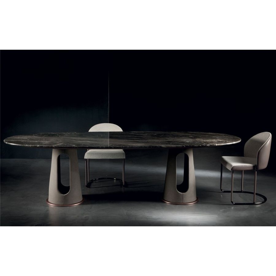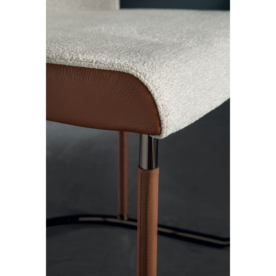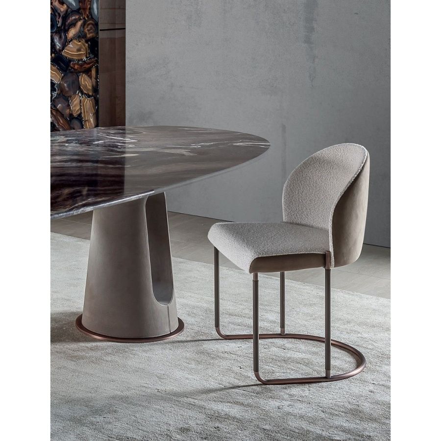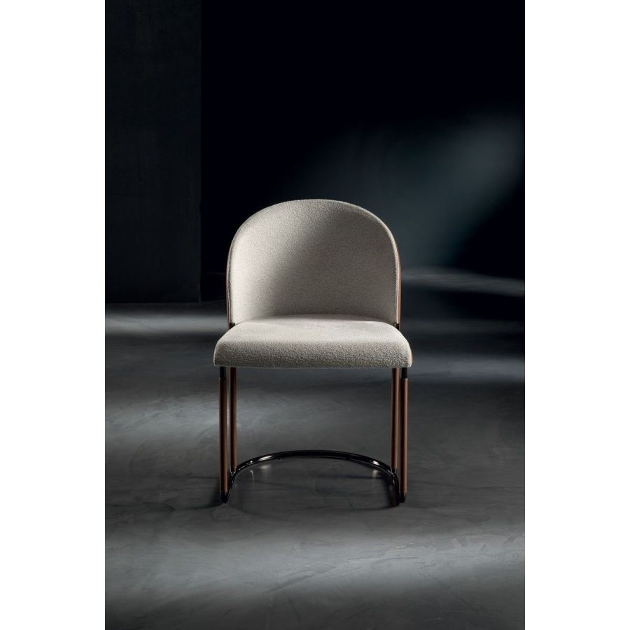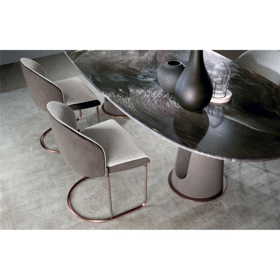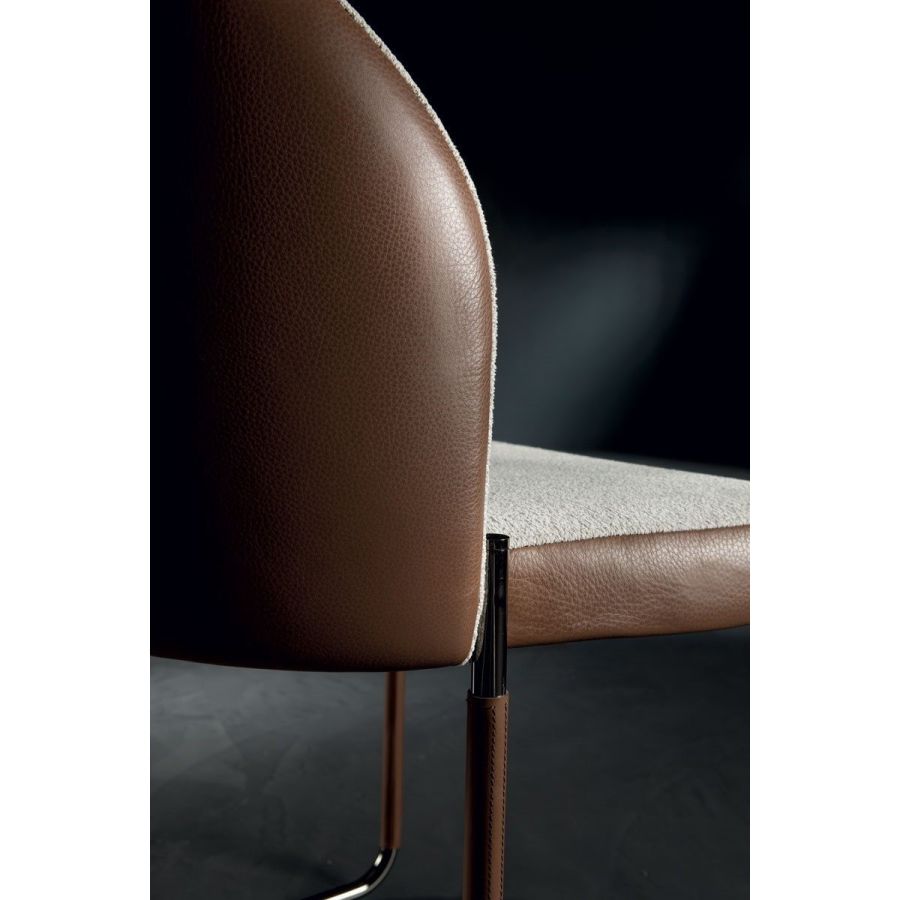 The load bearing structure is in tubular metal curved with variable radii, with a chrome finish in the following: Shaded copper, Bright shaded brown, Black Rose gold, bright light gold, Champagne gold, bright chrome, bright black chrome, matt satined bronze. The metal legs are partially covered in “Renova”, a particular type of recycled leather that is sustainable and anti-bacterial. This material matches or contrasts with the colour of the main upholstery. The seat is made of metal immersed in polyurethane foam injected into a mould. The leather or fabric upholstery is completely glued to the structure, and therefore NOT removable.