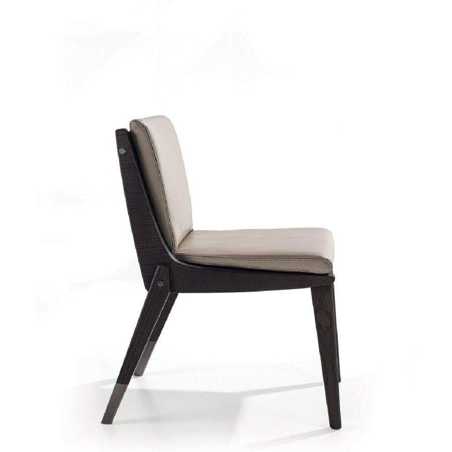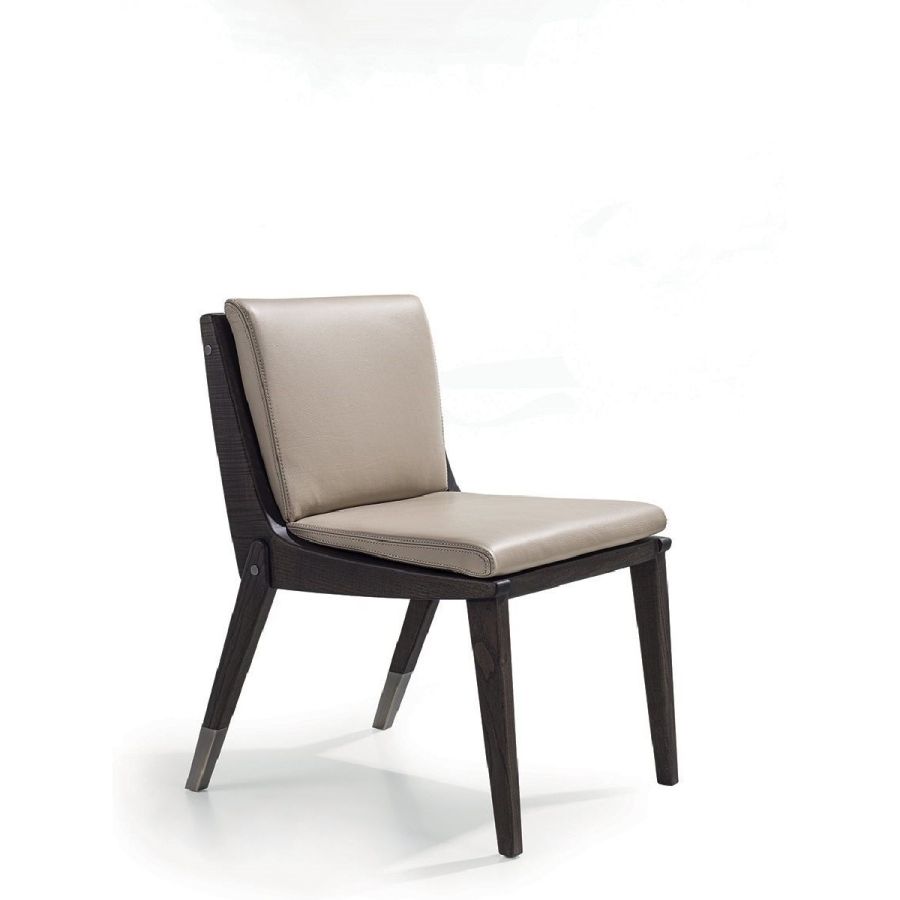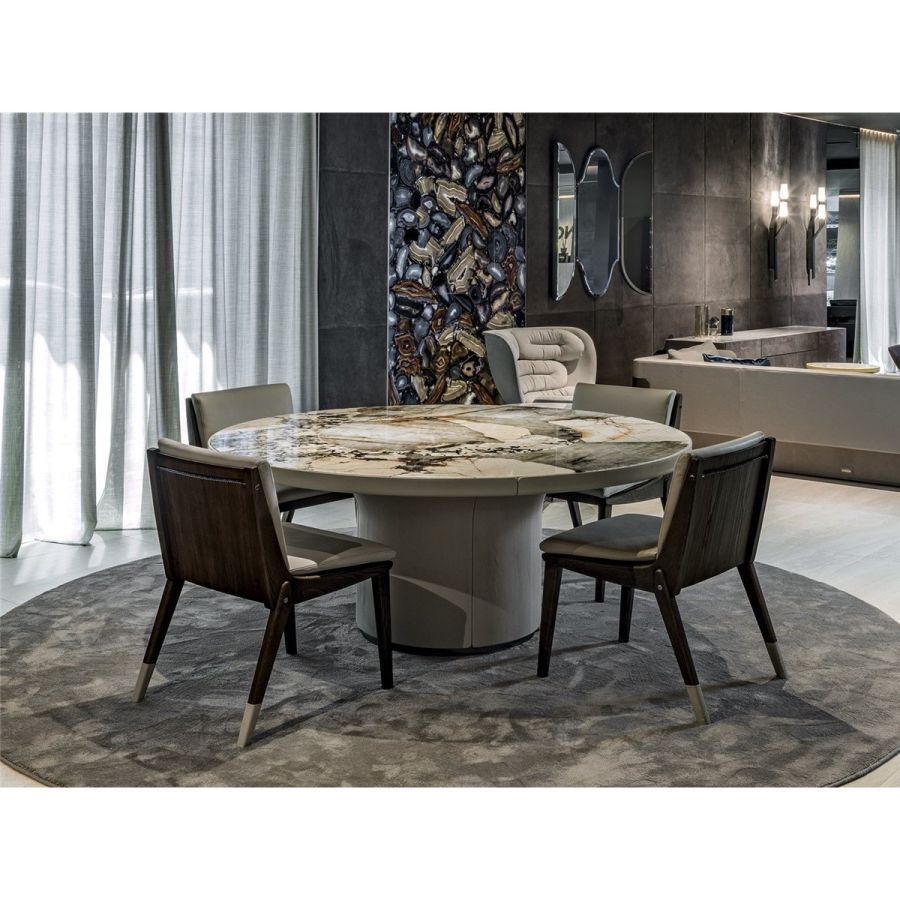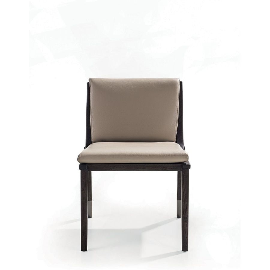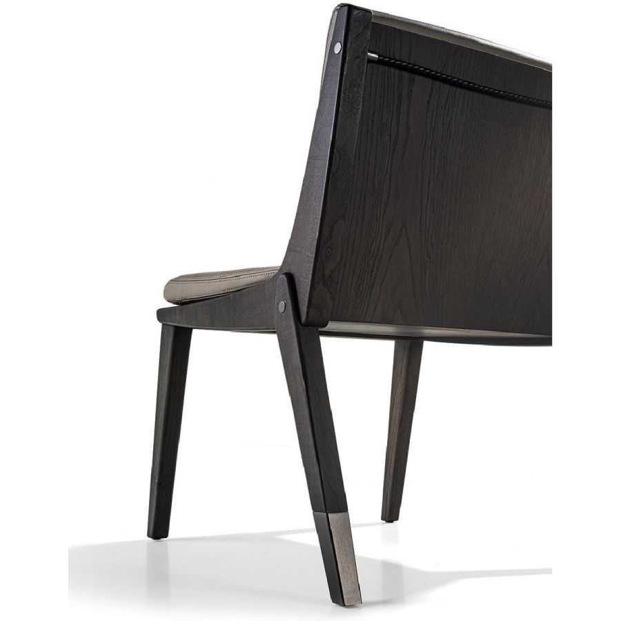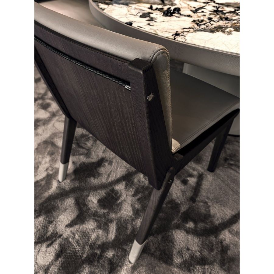 Solid ash wood structure, moulded and shaped with CNC machines, painted with water-based colours inBlack and Mink Brown. The seat and backrest are in medium density polyurethane foam, covered in non-removable leather or fabric upholstery. On the backrest, there is an elegant handle in braided saddle leather, coloured dark brown, fastened to the frame with chromed metal studs in the following finishes. At the bottom of the rear legs are installed two chromed metal ferrules also available in leather as per our sample set.All metals are available in the following galvanised finishes: Satin nickel, bright shaded brown, Black Rose gold, bright light gold, matt Champagne gold, bright chrome, bright black chrome, matt satin bronze, bright pink gold, matt pink gold.