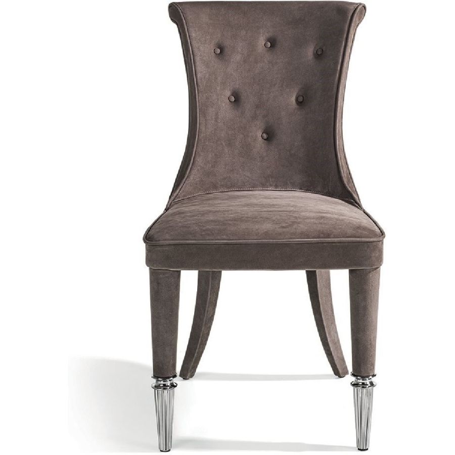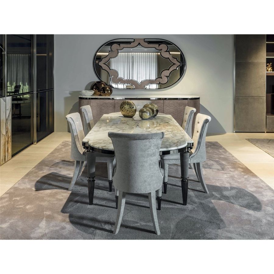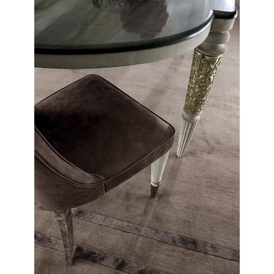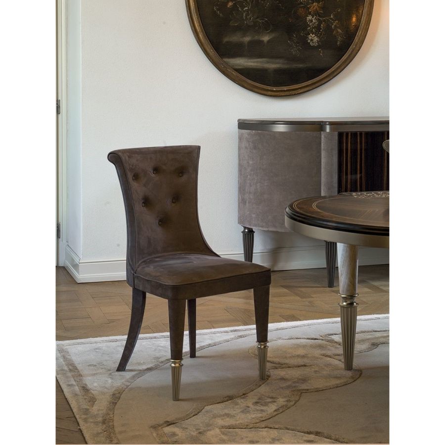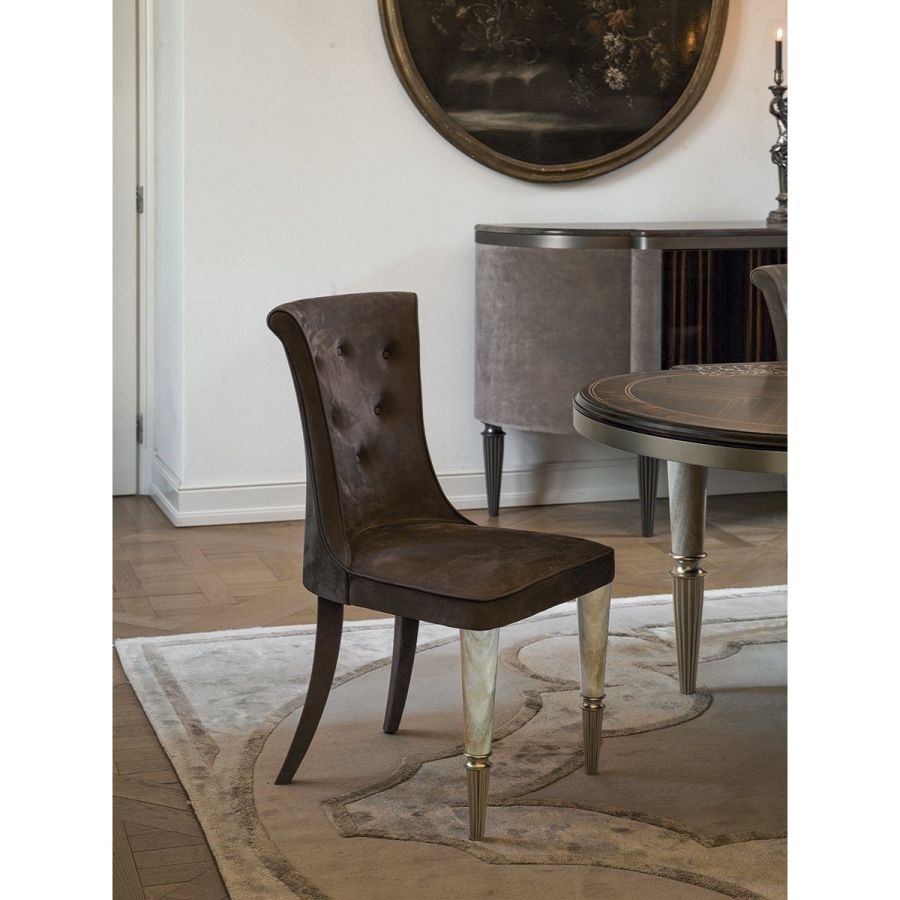 Chair with metal frame and elastic bands covered in high density moulded polyurethane foam. Finishing buttons in the backrest covered in plain colour or in Swarovski crystals. Rear legs are in wood in the same upholstery as the frame. Front legs (A) are made of various materials that are interchangeable depending on client preferences and available in the finishes: ivory onyx, Guatemala Green marble, Corteccia marble,Elegant Brown marble, Shale Rosewood marble, Silver Wave marble, Agatha Black marble, Calacatta marble, covered in leathers/velvets as in our sample set. Version with front legs (D) only covered in leather from the range. Turned details of legs (B-C) available in the finishes: Satin nickel, bright shaded brown, Black Rose gold, bright light gold, matt Champagne gold, bright chrome, bright black chrome, matt satin bronze, covered in leathers from the catalogue. Given the special manufacturing process, velvet or leather upholstery is not removable.