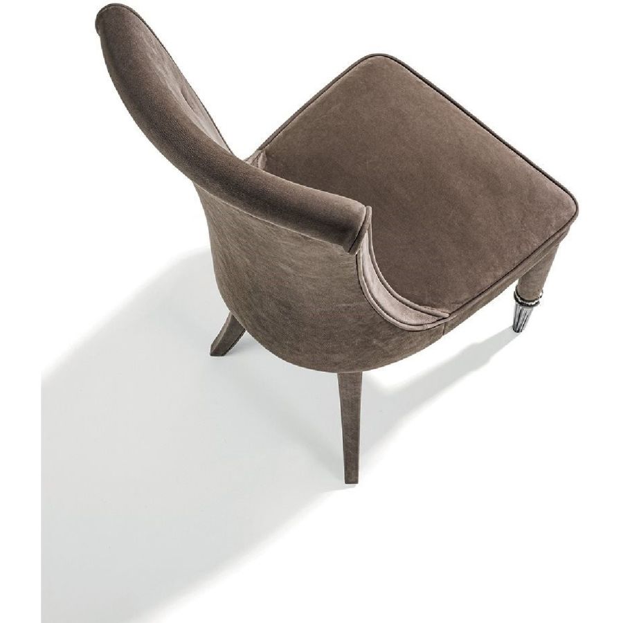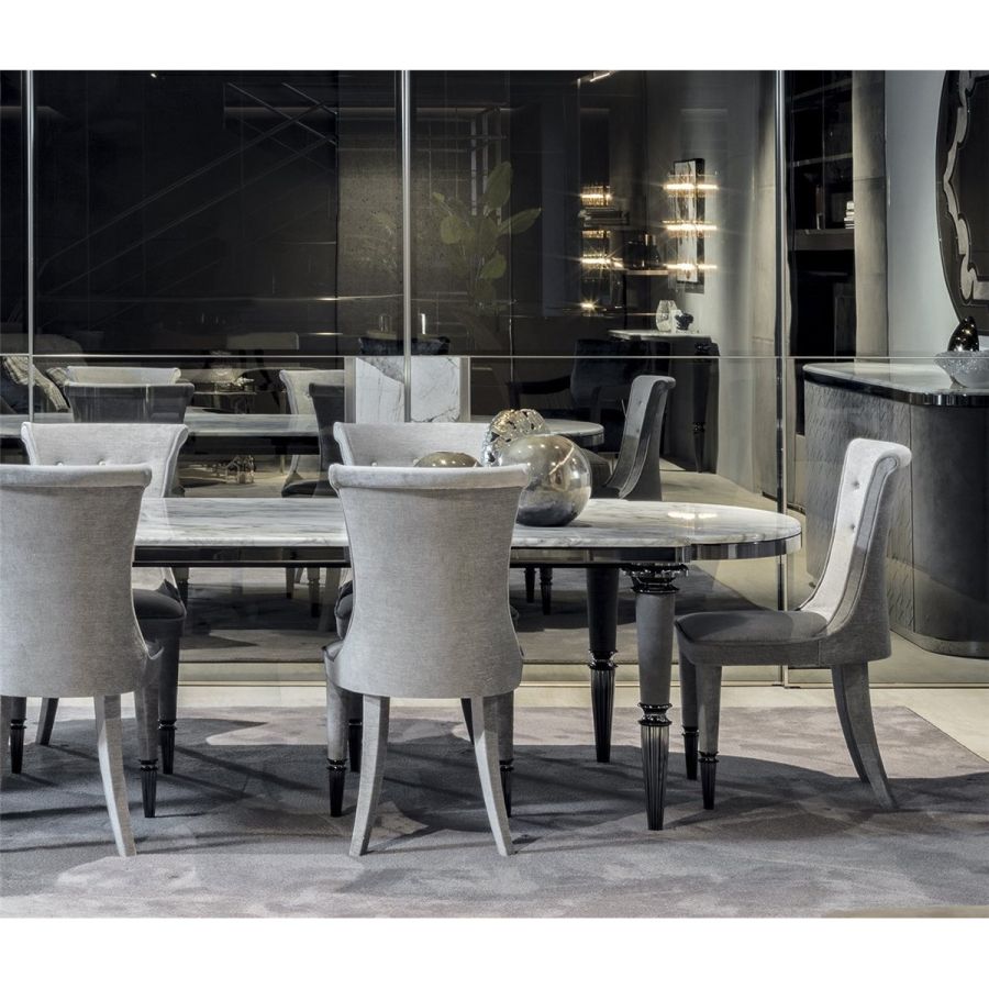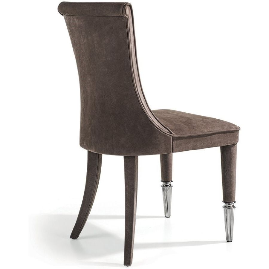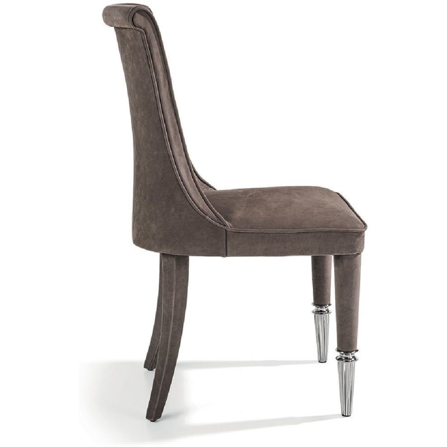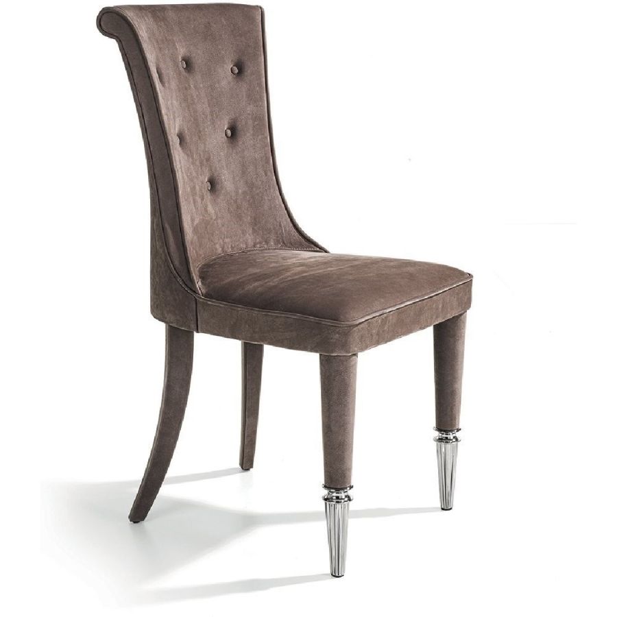 Chair with metal frame and elastic bands covered in high density moulded polyurethane foam. Finishing buttons in the backrest covered in plain colour or in Swarovski crystals. Rear legs are in wood in the same upholstery as the frame. Front legs (A) are made of various materials that are interchangeable depending on client preferences and available in the finishes: ivory onyx, Guatemala Green marble, Corteccia marble,Elegant Brown marble, Shale Rosewood marble, Silver Wave marble, Agatha Black marble, Calacatta marble, covered in leathers/velvets as in our sample set. Version with front legs (D) only covered in leather from the range. Turned details of legs (B-C) available in the finishes: Satin nickel, bright shaded brown, Black Rose gold, bright light gold, matt Champagne gold, bright chrome, bright black chrome, matt satin bronze, covered in leathers from the catalogue. Given the special manufacturing process, velvet or leather upholstery is not removable.