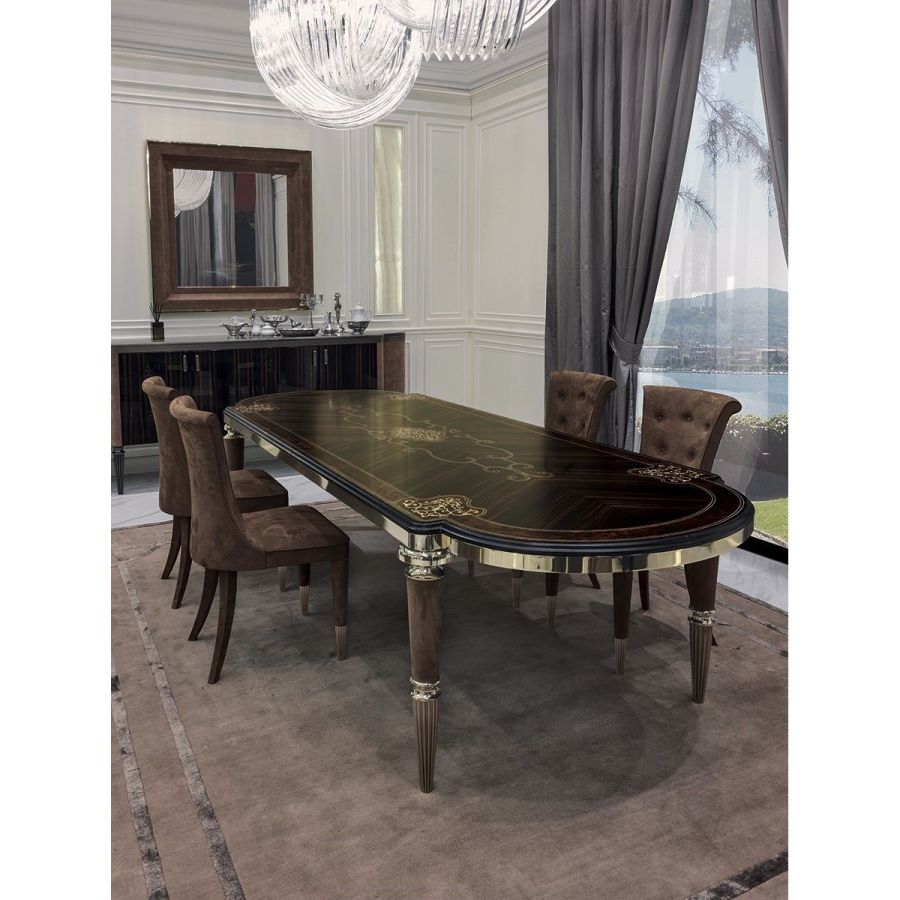 Chair and dining room armchair in a combination of materials with rear legs in wood covered in wood, and front legs comprising a ferrule and parts in grooved turned metal plus an insert in onyx, marble or leather that creates a pleasant contrast between the materials.