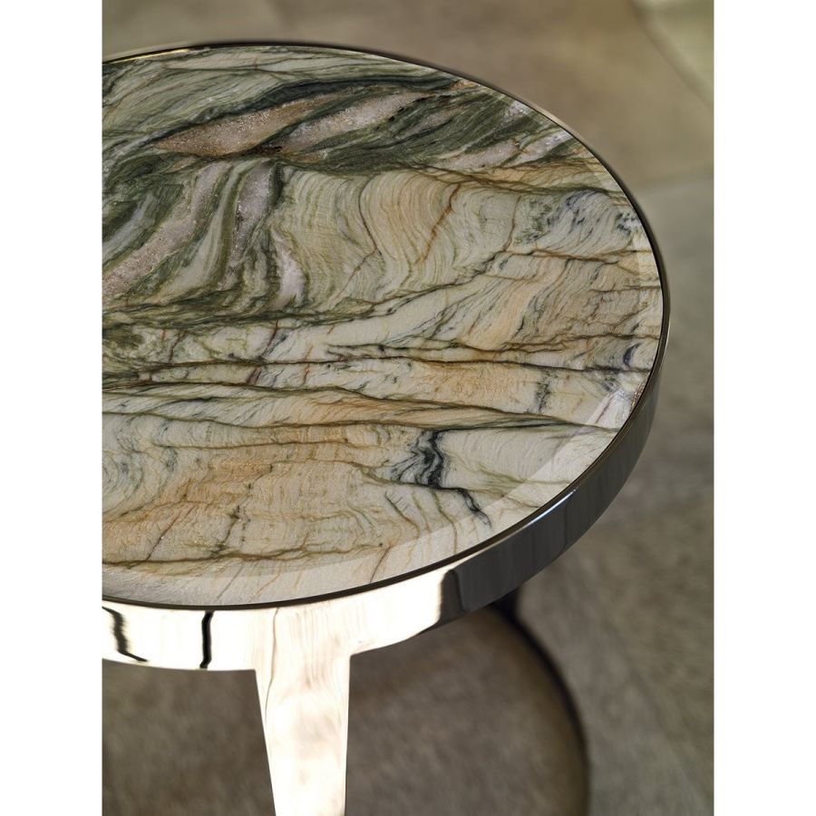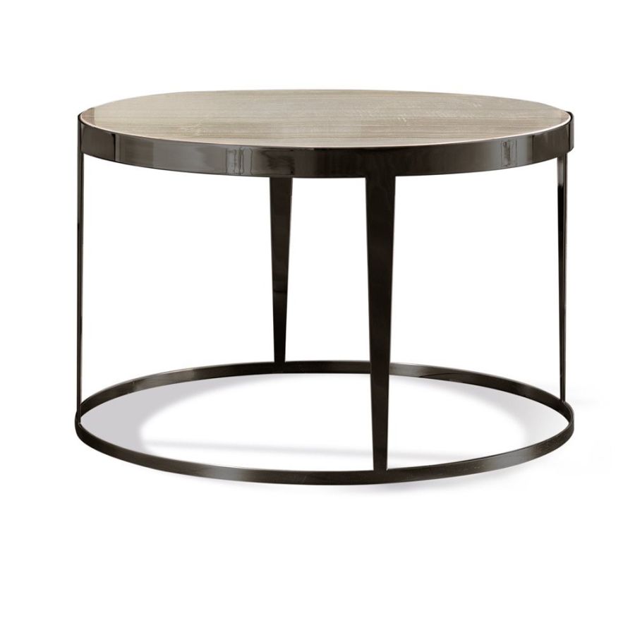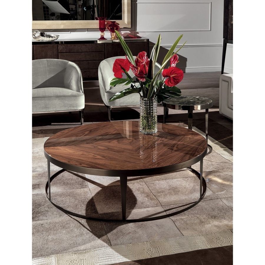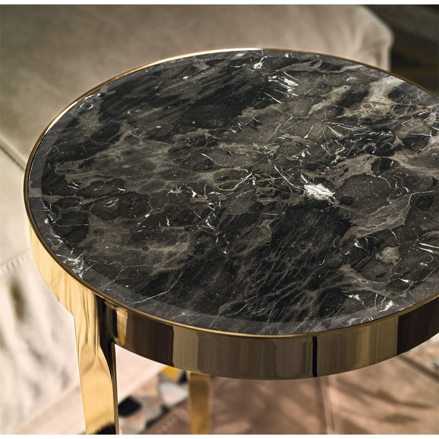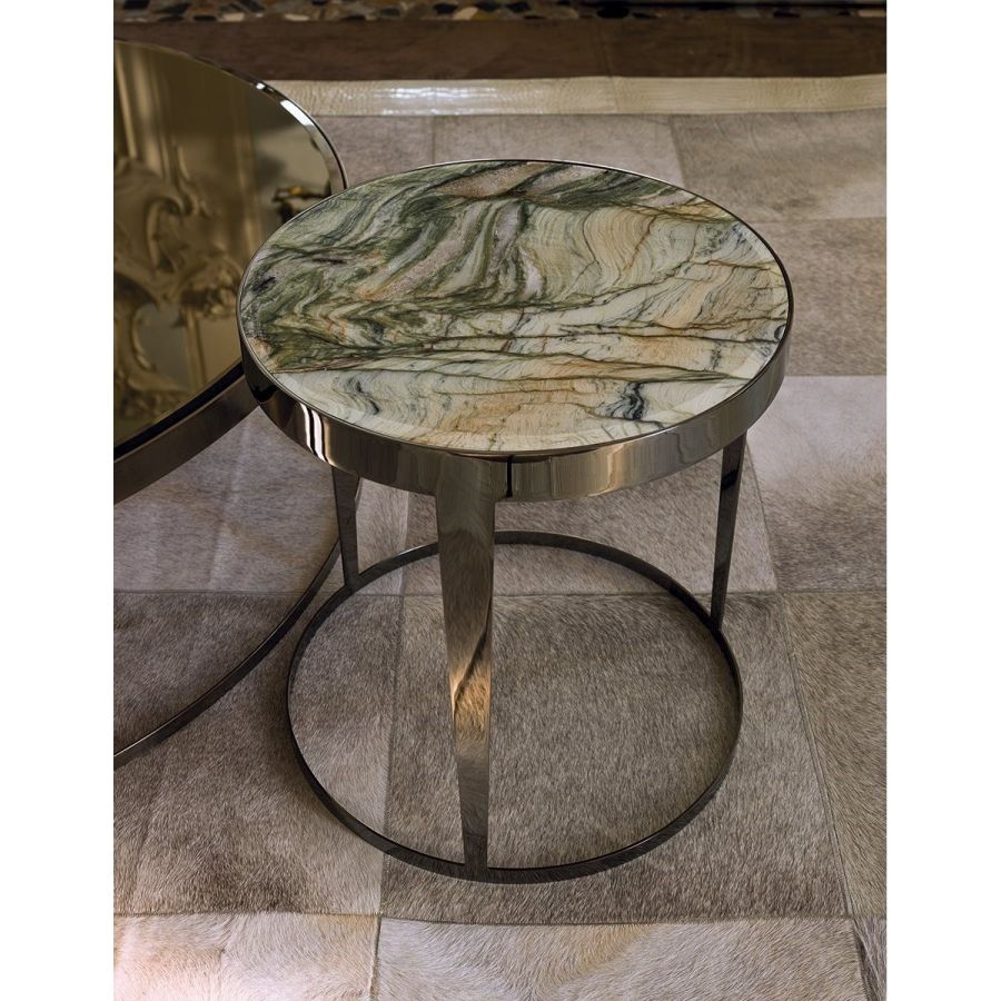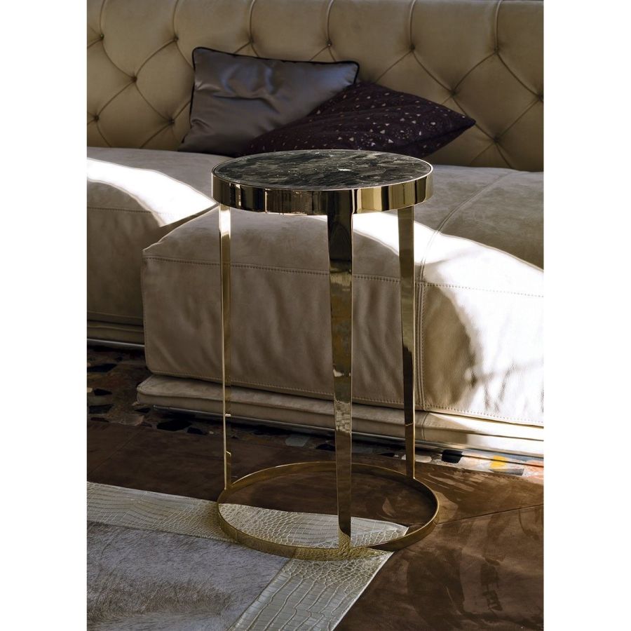 Small table in laser cut ground metal. Frame finish: Satin nickel, bright shaded brown, Black Rose gold, bright light gold, matt Champagne gold, bright chrome, bright black chrome, matt satin bronze, bright pink gold, matt pink gold. Top finish: painted black crystal 8 mm with bevelling, bronze or smoky mirror 6 mm with bevelling, White Carrara marble, Imperial Brown marble, Sahara Noir marble (glossy and matt polyester finish), Dover White marble, Panda White marble, Guatemala Green marble, Corteccia marble, Port Saint Laurent marble, RedLevanto marble, Bardiglio Nuvolato marble, Elegant Brown marble, Shale Rosewood marble, Emperador Dark marble, Silver Wave marble, Agatha Black marble, Frappuccino marble, Calacatta marble, Fusion Light marble, Patagonia marble, Explosion Blue marble, Fusion Multicolor marble, Juliet Quartz marble, Calcite Azul marble, Red onyx, Ivory onyx, glossy lacquered wood in range colours, glossy/matt Maple, glossy/mattheat-treated Eucalyptus, glossy/matt Sycamore frisè, glossy/matt Ebony, glossy/matt Canaletto walnut.