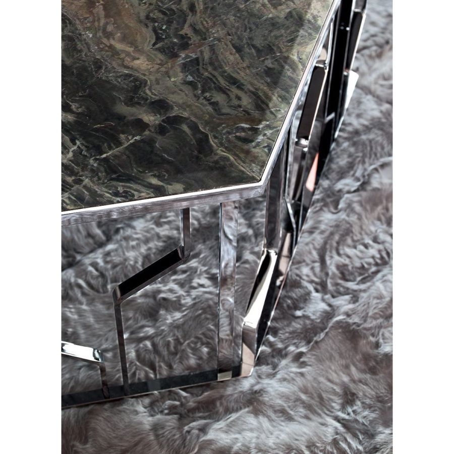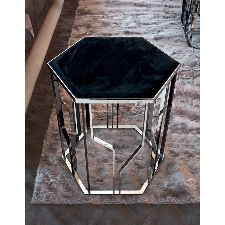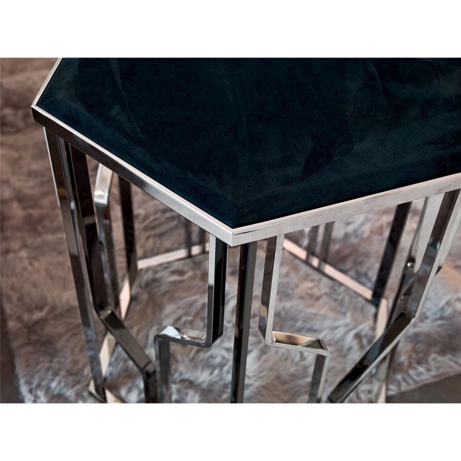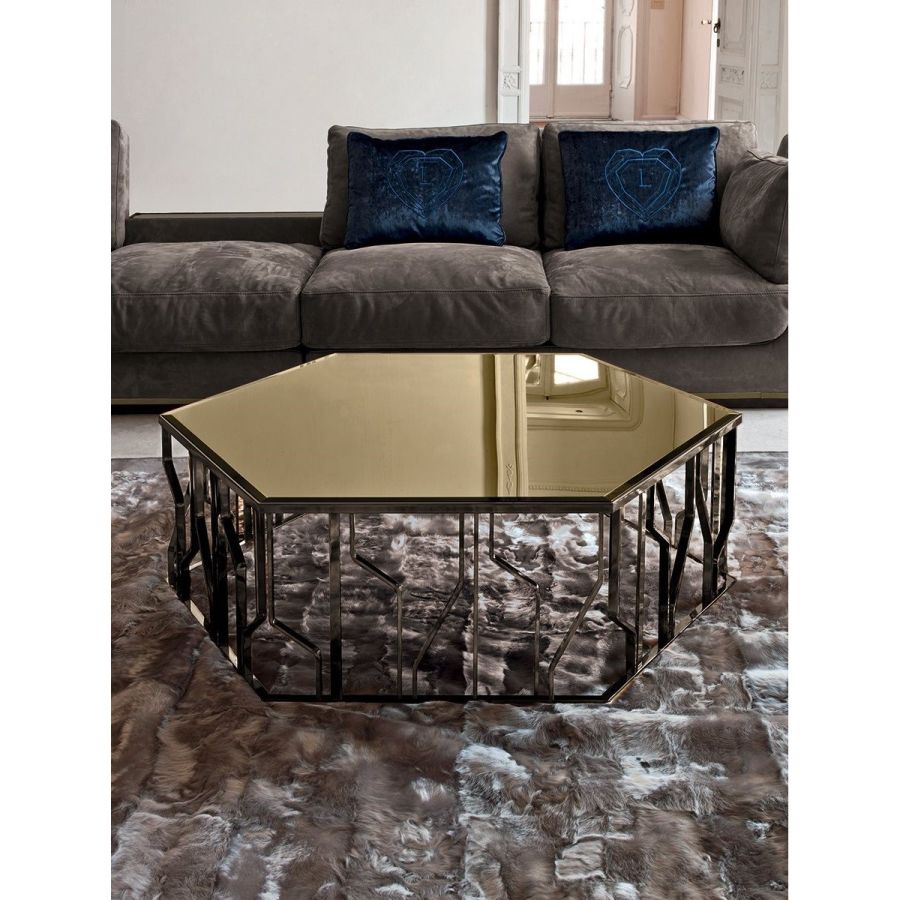 A must from the Loveluxe collection, a well-known series of small tables, consoles and other pieces with the unmistakable style of Alessandro La Spada. To set in the centre of the room or near the sofas, the Ginza tables have hexagonal tops - clear and rigid - supported by a characteristic base decorated with polished or matt finish metal rods that recall stylized “flashes”:the symbol of the entire Ginza series.
