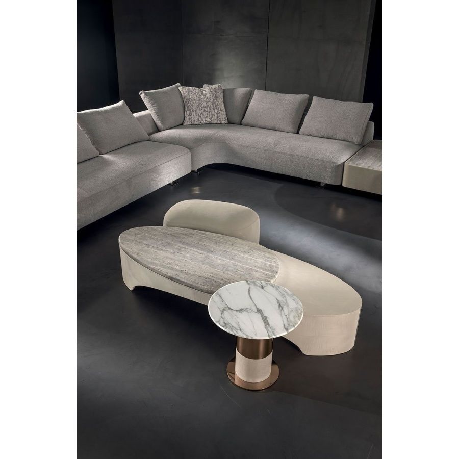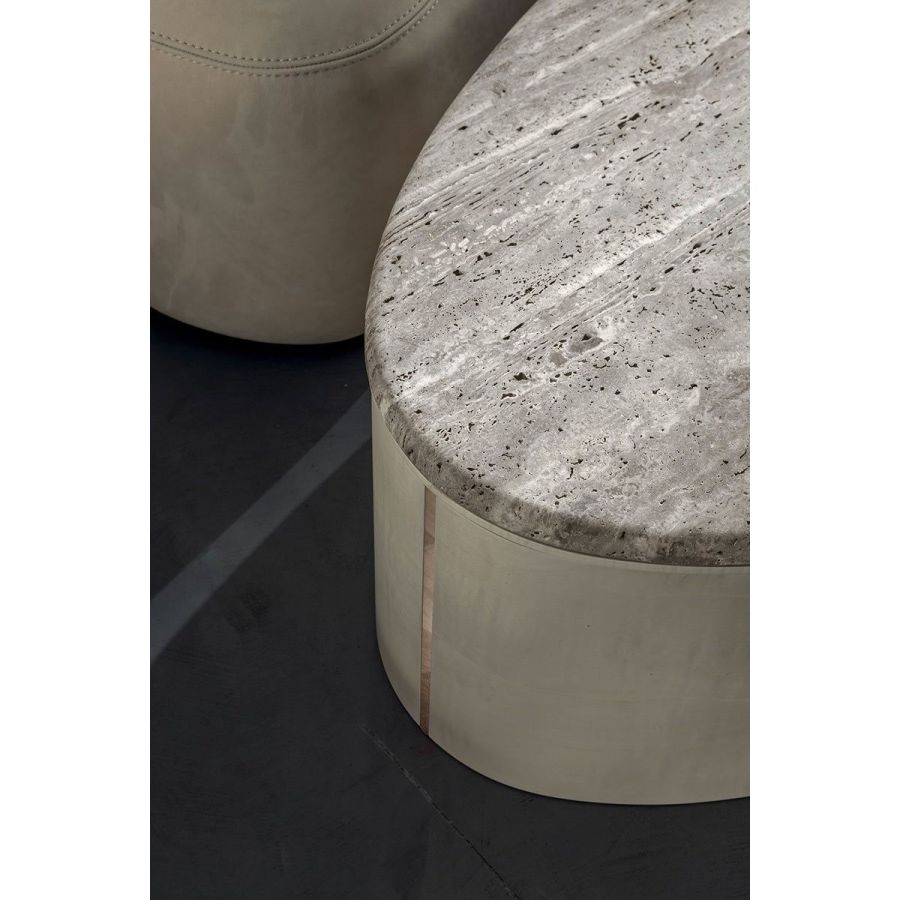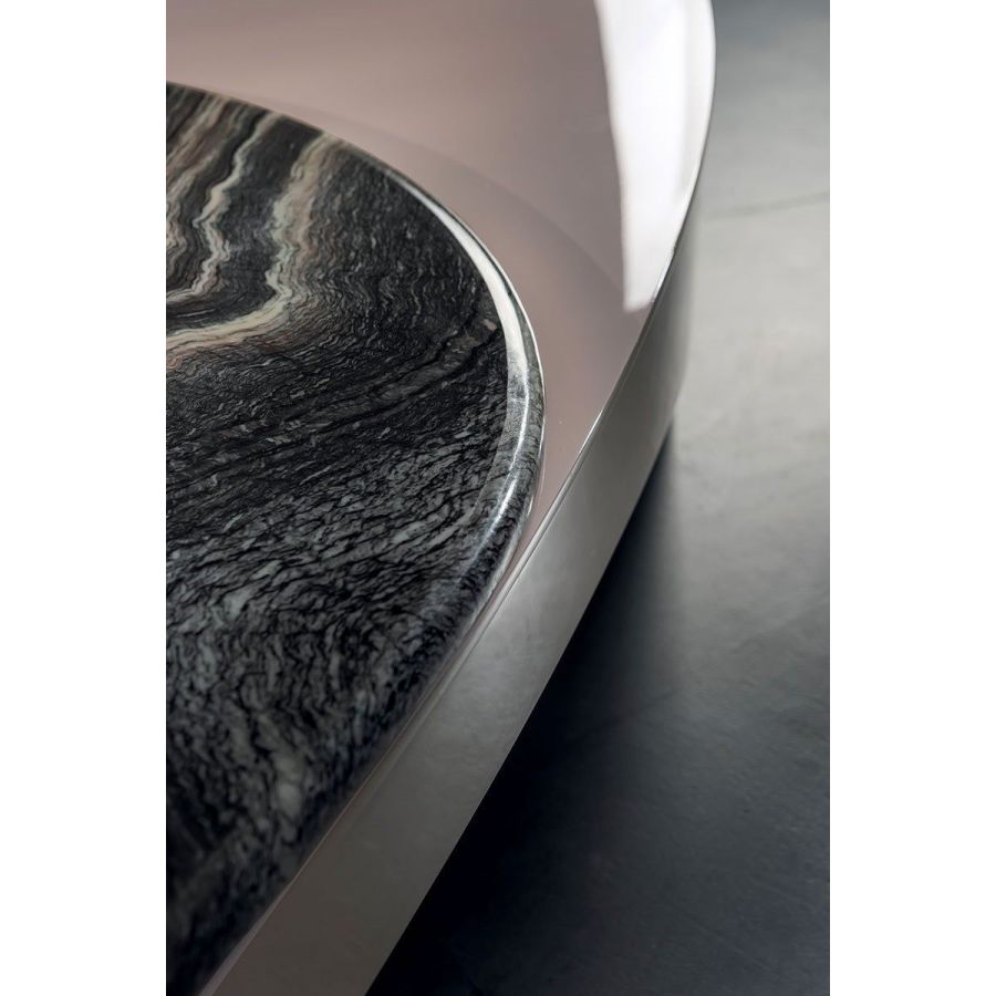 Curved lines define the Gregg table, a piece with a strong aesthetic line that it shares with the rest of the pieces in this collection. The Gregg table has a drop-shaped marble top positioned slightly off centre of the oval shaped bridge structure, and it is decorated with a metal insert on the side. To complete the project, Giuseppe Viganò created Leda, a small table with the base in two materials and a circular top. Leda can be placed alongside Gregg to create an exclusive composition with dual height.