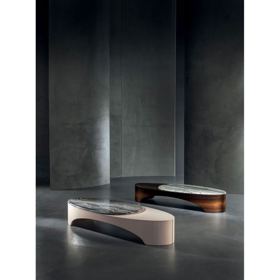 Small oval table with a wooden bridge structure in the finishes: Matt eucalyptus, Matt ebony, Matt sycamore frisè. Or glossy lacquer in the colours in the catalogue. The marble is set on the top in an asymmetrical and off-centred position, with a 20 mm thick half bullnose edge: Travertino, Silver Beola, Cipollino marble, Arabescato Orobico marble, Silver Stream marble, White Carrara marble, Imperial Brown marble, ElegantBrown marble, Sahara Noir marble (polyester finish), Dover White marble, Guatemala Green marble, RedLevanto marble, Shale Rosewood marble, Emperador Dark marble, Silver Wave marble, Agatha Black marble, Frappuccino marble, Calacatta marble, Patagonia marble, Juliet Quartz marble. On the two ends of the ellipse, there are two metal inserts, in the finishes: Satined champagne, Bright/satined Burnished,Shaded copper, Bright/satined brown, Bright/satined Black rose, Bright/satined light gold, Bright/satined chrome, Bright/satined black chrome, Matt satined bronze.GREGGDesign by Giuseppe VIGANÒ_Y 928 pg.281807732474070