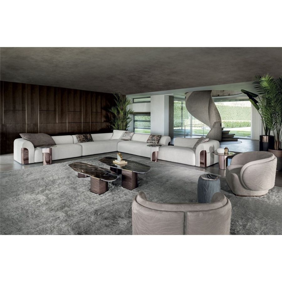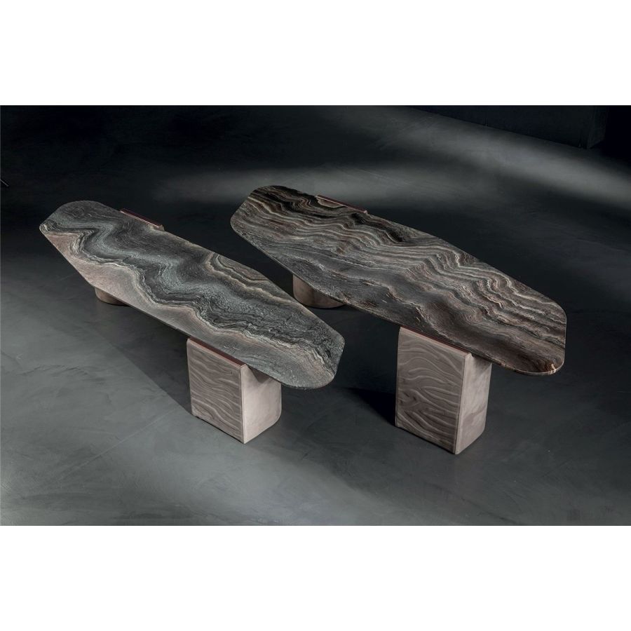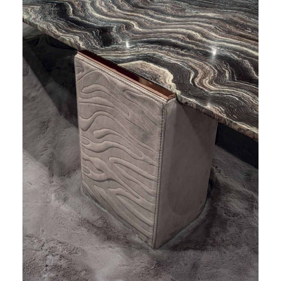 Small table offered in double dimensions to create original bridgeable compositions. Semi-circular wood legs stained in moka or grey, with the exterior decorated with a special “Wavy” print or all covered in leather with the exterior decorated with the quilted “Groove” pattern. To enhance the joint between the leg and the marble top, there is a metal plate in the finishes: Shaded copper, Bright shaded brown, Black Rose gold, bright light gold, Champagne gold, bright chrome, bright black chrome, matt satined bronze. Shaped marble top 20 mm, in the finishes: Silver beola stone, Cipollino marble, Arabescato Orobico marble, Silver Stream marble, White Carrara marble, Imperial Brown marble, Sahara Noir marble (glossy and matt polyester finish), Dover White marble, Guatemala Green marble, Red Levanto marble, Shale Rosewood marble, Emperador Dark marble, Silver Wave marble, Agatha Black marble, Frappuccino marble, Calacatta marble, Patagonia marble, Juliet Quartz marble.