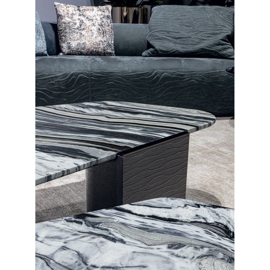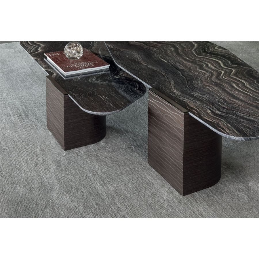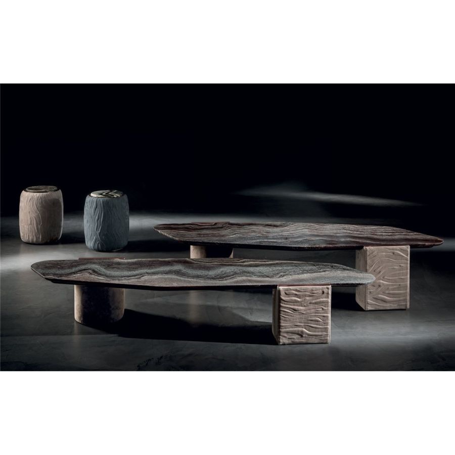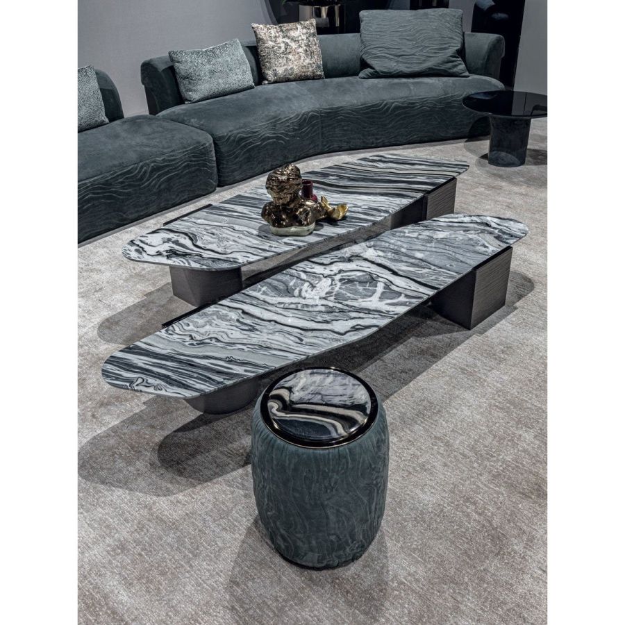 A small table with an irregular shape, available in two heights for very interesting overlapping effects between the tall and low version. Offset has been conceived as a jewel that teams precious aesthetics with geometric design. Its distinguishing feature are semi-circular wood legs stained in moka or grey, their exterior decorated with a special “Wavy” print or all covered in leather and the exterior decorated with the quilted “Groove” pattern. A metal plate enhances the joint between the leg and the marble surface.
