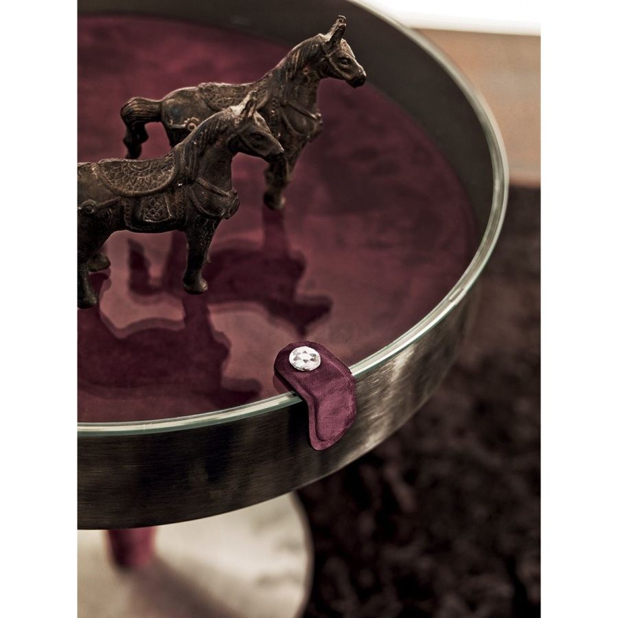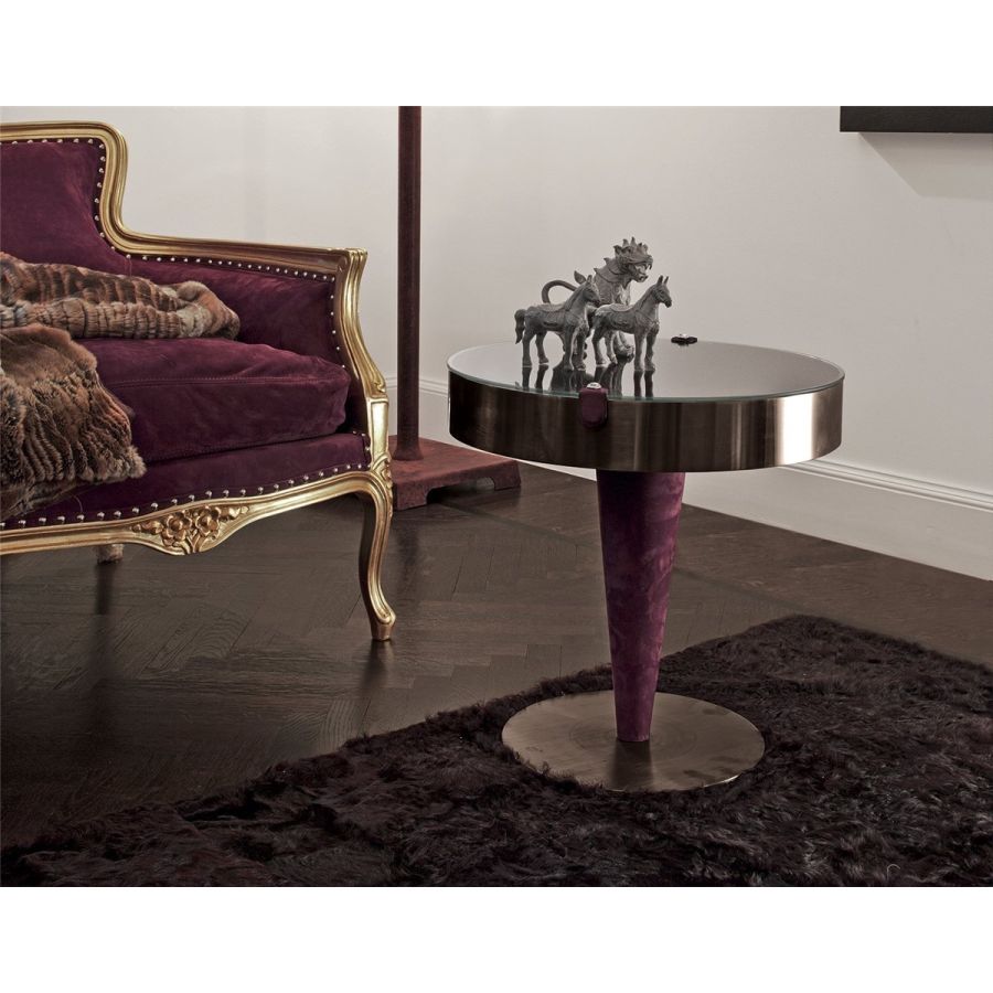 Small table with internal shelf and column covered in leather in the colours in the catalogue. Top surface in shaped transparent tempered glass. Edge and base in ground metal in the finishes: Satin nickel, bright shaded brown, Black Rose gold, bright light gold, matt Champagne gold, bright chrome, bright black chrome, matt satin bronze, bright pink gold, matt pink gold.