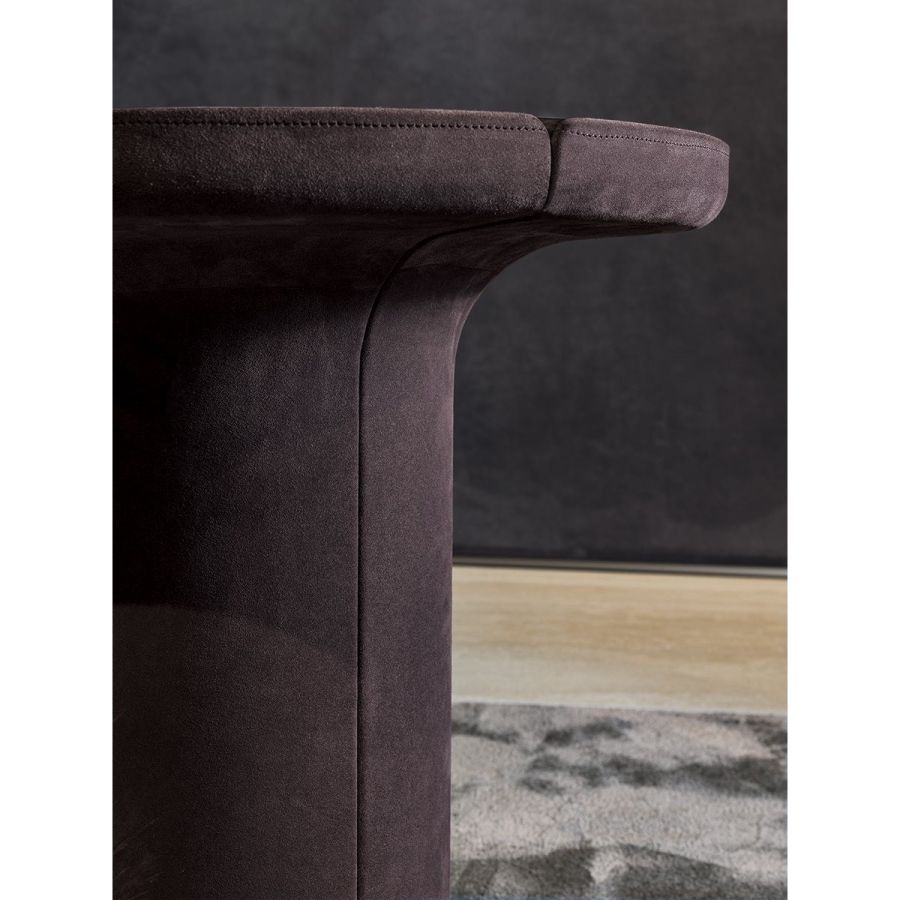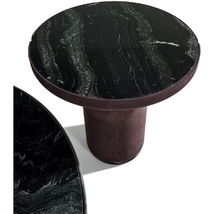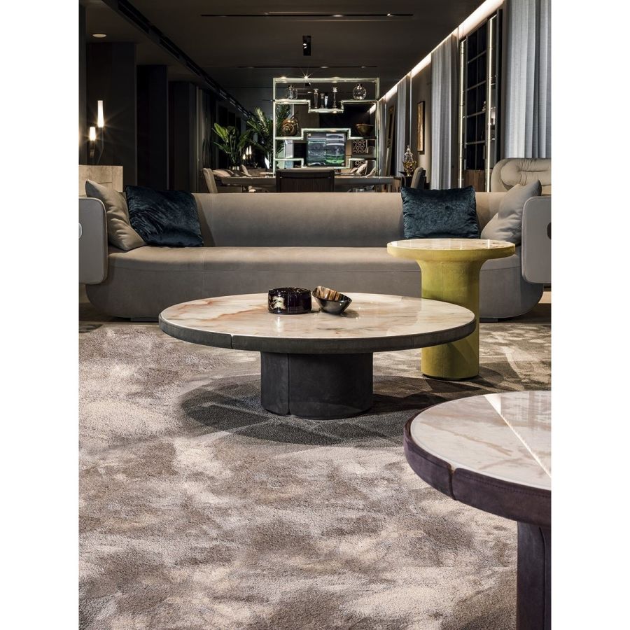 Small round table with internal structure in painted metal and shell in manually moulded glass fibre covered in leather from the range. Ground metal baseboard and edges in the following finishes: Satin nickel, bright shaded brown, bright light gold, matt Champagne gold, bright chrome, bright black chrome, matt satin bronze, bright pink gold, matt pink gold, Black Rose gold. Top finishes: bronze or smoky mirror, White Carrara marble, Imperial Brown marble, Sahara Noir marble (glossy and matt polyester finish), Dover White marble, Panda White marble, Guatemala Green marble, Corteccia marble, Port Saint Laurent marble, Red Levanto marble, Bardiglio Nuvolato marble, Elegant Brown marble, Shale Rosewood marble, Emperador Dark marble, Silver Wave marble, Agatha Black marble, Frappuccino marble, Calacatta marble, Fusion Light marble, Patagonia marble, Explosion Blue marble, Fusion Multicolor marble, Juliet Quartz marble, Calcite Azul marble, Azul Macauba marble, Portoro marble, Red onyx, wood worked in “wedges” and marquetry in wood: glossy Ebony, glossy Canaletto walnut.