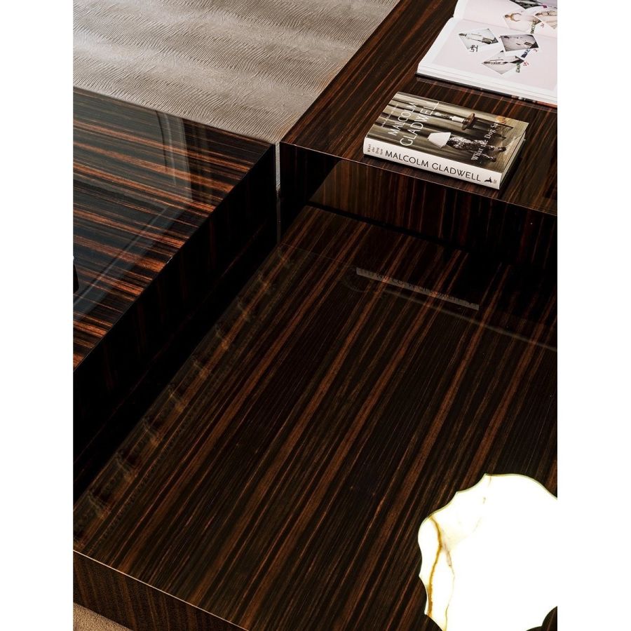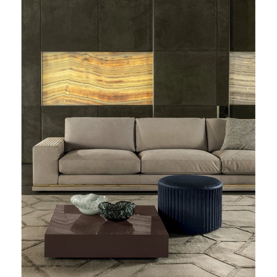 A prism with a square base is charming in any of the many available finishes: covered in leather, finished in glossy lacquer or veneered in fine wood. To make the piece even more precious, as an optional, it is possible to add a small shaped top in backlit onyx. Safir small tables come in two heights, which makes it possible to form an original interplay of volumes and create interesting interactions with other types of small tables from the collection.