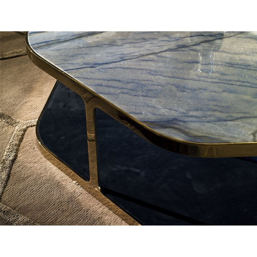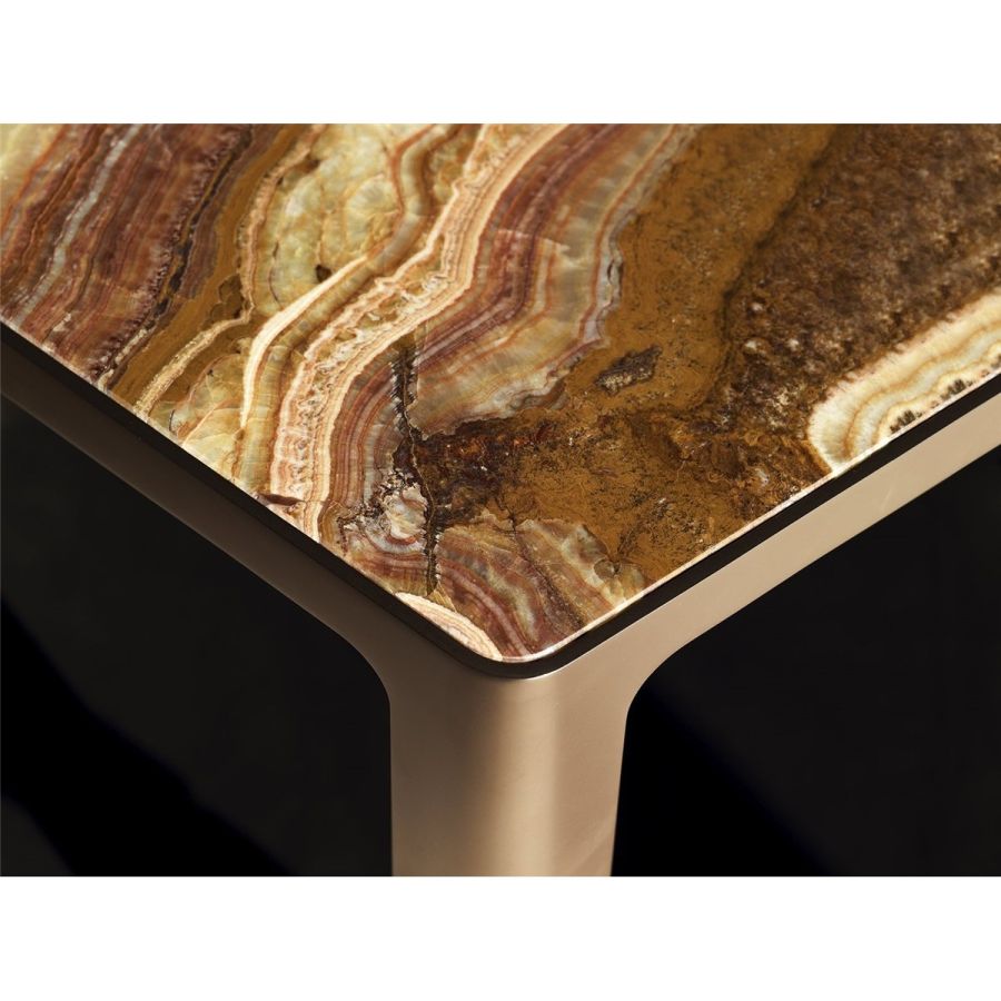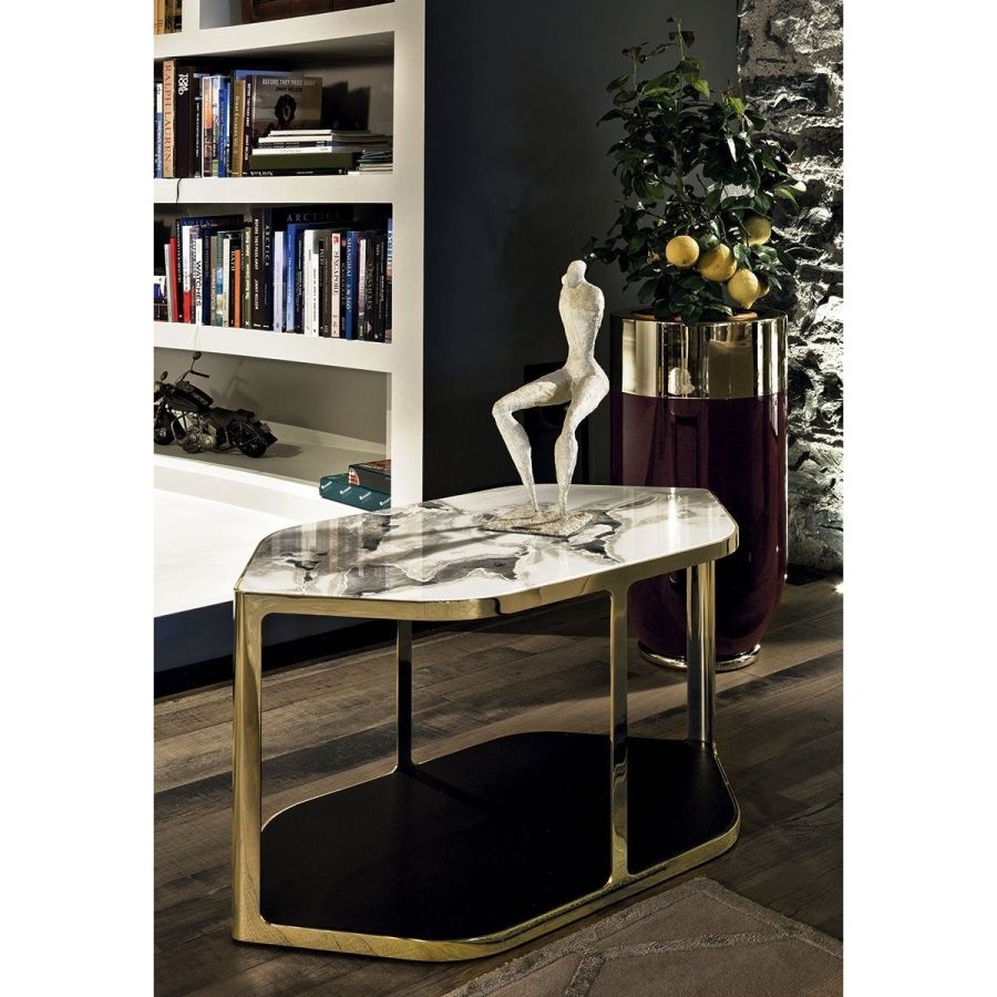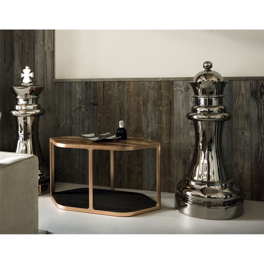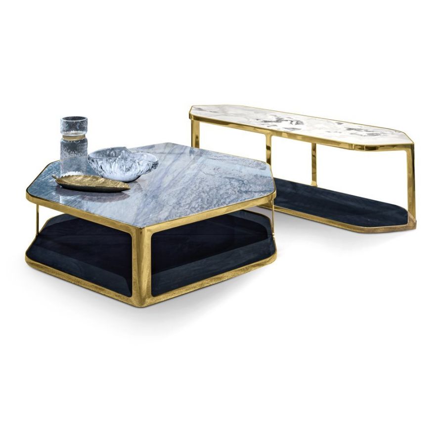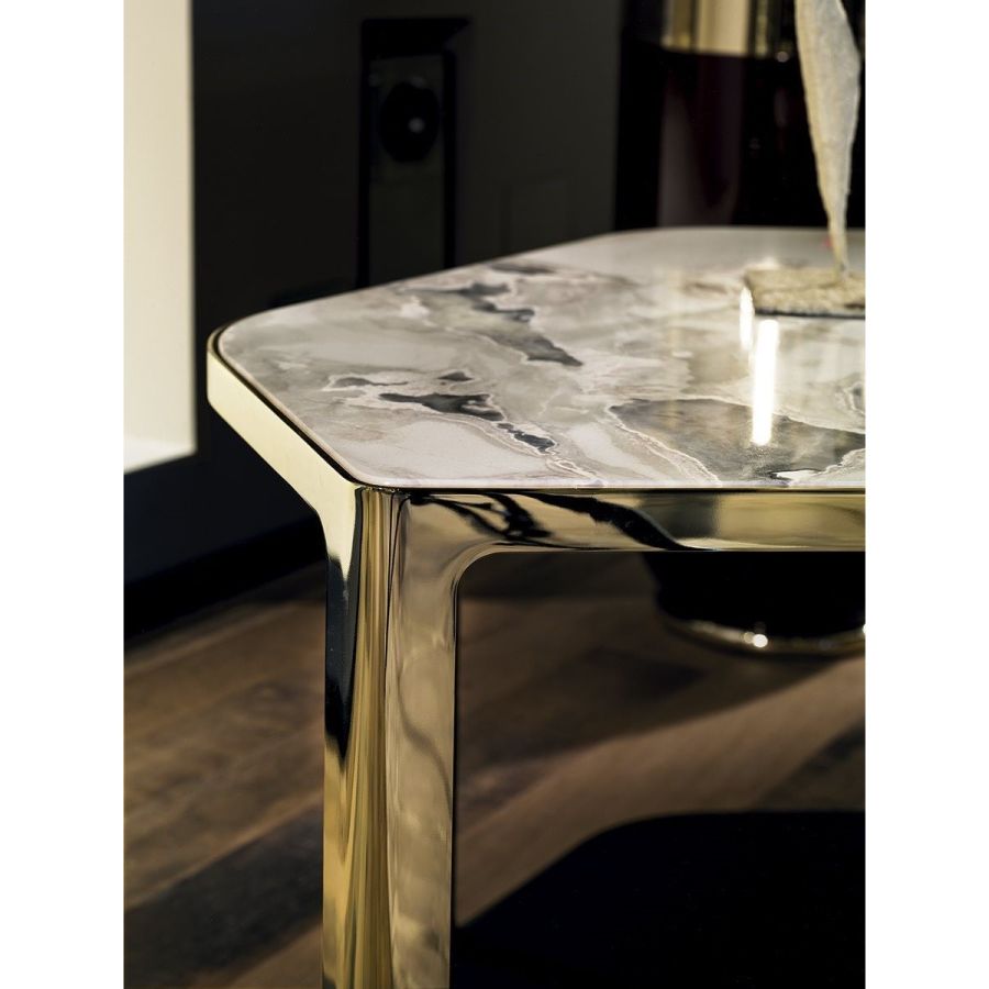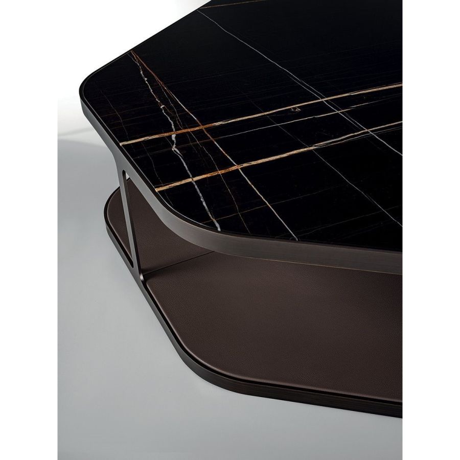 Small table in ground, laser-cut metal in a single piece. Frame finishes: Satin nickel, bright shaded brown,Black Rose gold, bright light gold, matt Champagne gold, bright chrome, bright black chrome, matt satinbronze, bright pink gold, matt pink gold. Top surface finish: Bronze or smoky mirror, White Carrara marble,Imperial Brown marble, Sahara Noir marble (glossy and matt polyester finish), Dover White marble, PandaWhite marble, Guatemala Green marble, Corteccia marble, Port Saint Laurent marble, Red Levanto marble, Bardiglio Nuvolato marble, Elegant Brown marble, Shale Rosewood marble, Emperador Dark marble, SilverWave marble, Agatha Black marble, Frappuccino marble, Calacatta marble, Fusion Light marble, Patagoniamarble, Explosion Blue marble, Fusion Multicolor marble, Juliet Quartz marble, Calcite Azul marble, AzulMacauba marble, Red onyx. In the base, a shelf is inserted, upholstered in leathers from the catalogue.