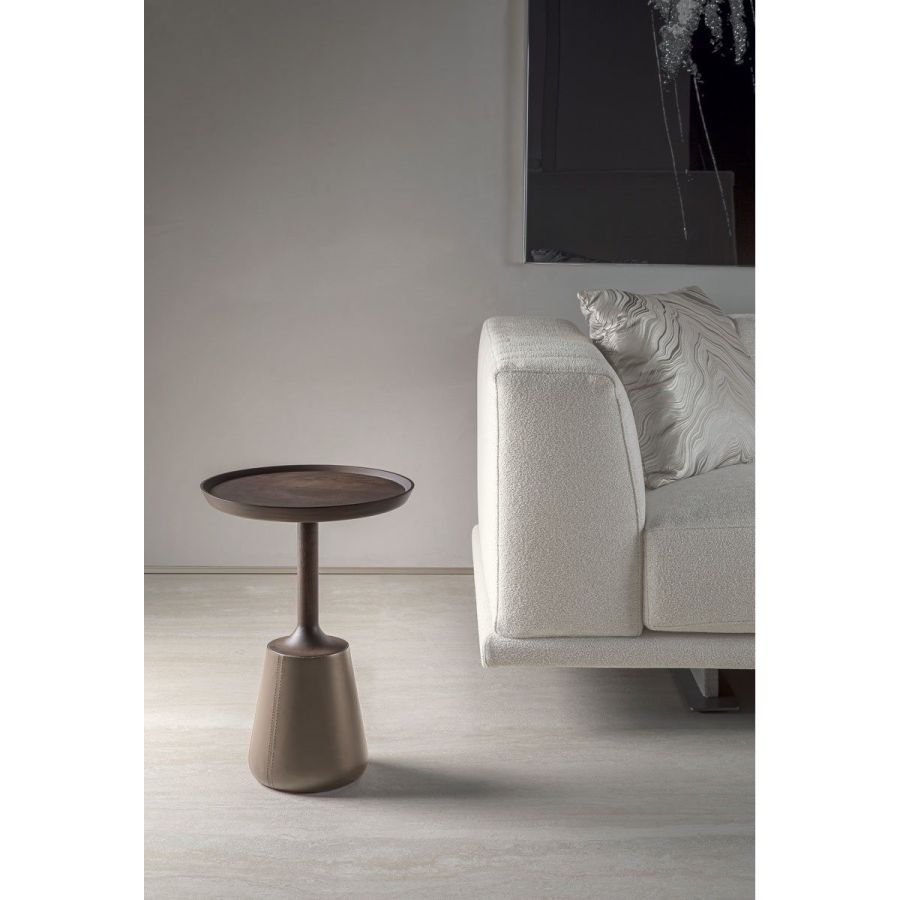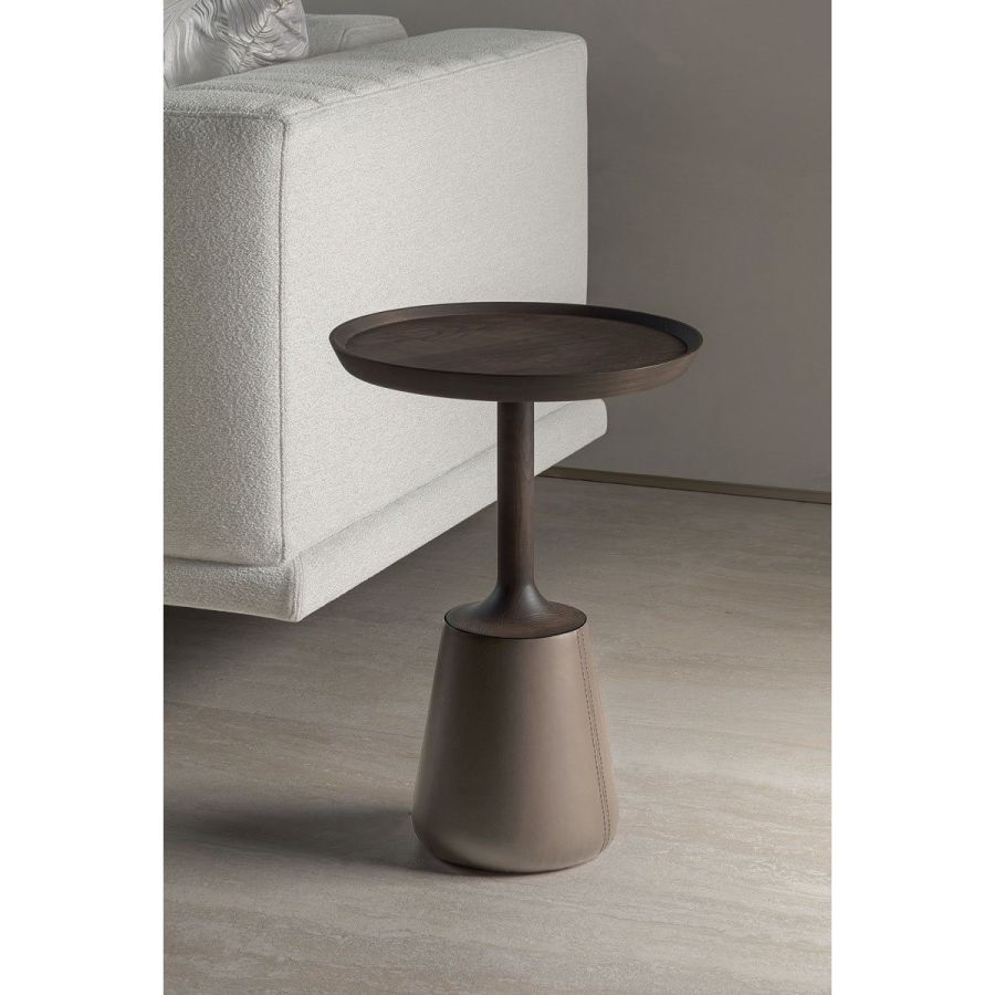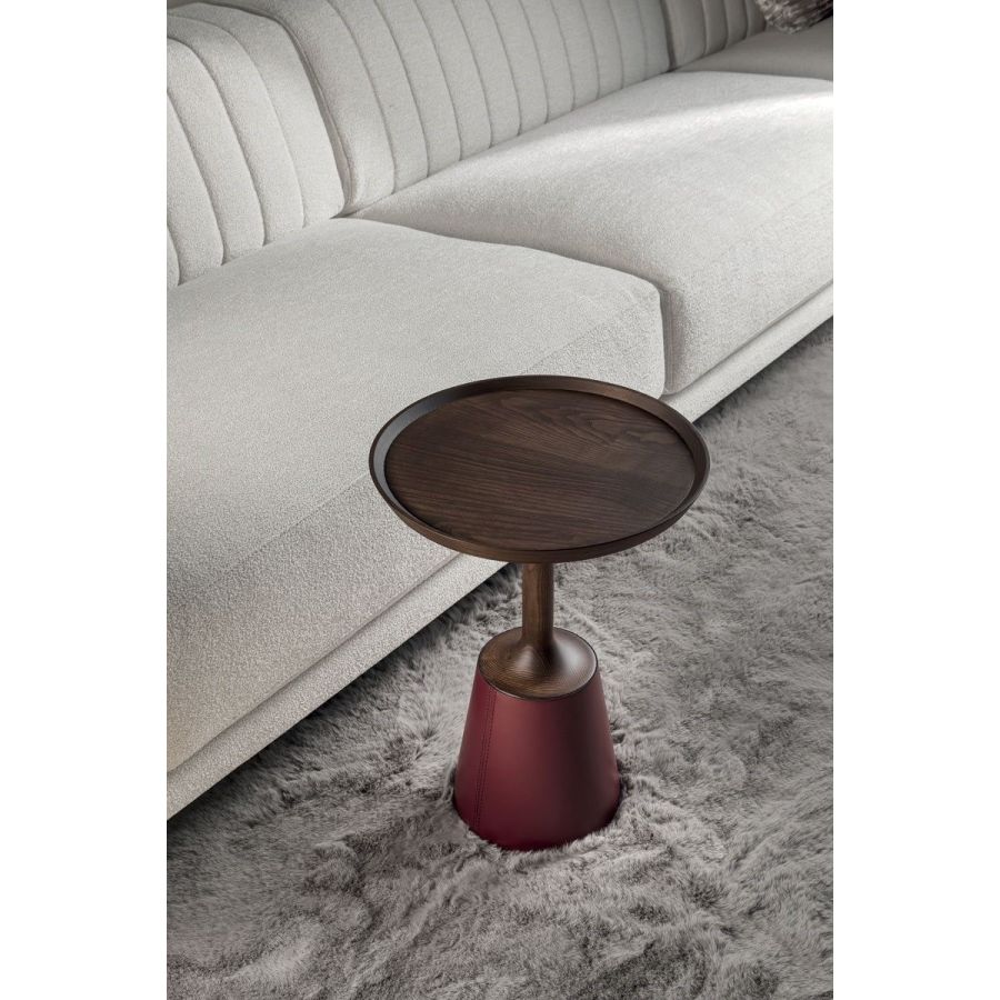 Round utility table in solid turned wood, in a single piece, stained moka or grey. The base is covered in leather in the colours: burgundy, taupe, tobacco, natural.