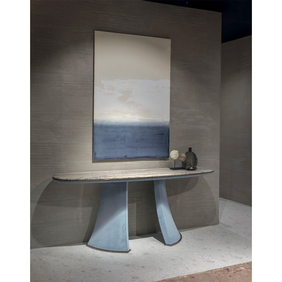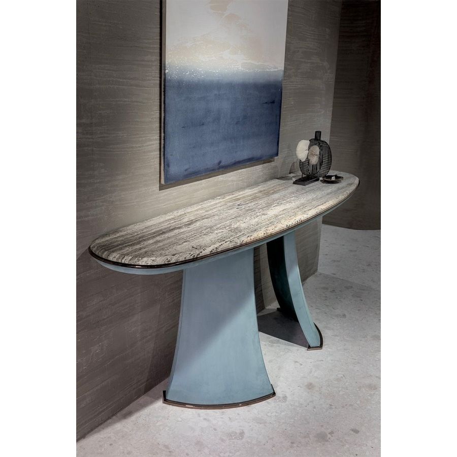 Console with 2 legs made in an exclusive mould con high density structural foam covered in leather from the catalogue. Underleg plate and undertop edge in metal in the finishes: Satined champagne, Bright/satined brown, Bright/satined Black rose, Bright/satined light gold, Bright/satined chrome, Matt satined bronze. The marble top is 20 mm thick with a bevelled edge: Travertino, Cipollino marble, Arabescato Orobico marble, Silver Stream marble, White Carrara marble, Imperial Brown marble, Elegant Brown marble, Sahara Noir marble (polyester finish), Dover White marble, Red Levanto marble, Shale Rosewood marble, Emperador Dark marble, Silver Wave marble, Agatha Black marble, Frappuccino marble, Calacatta marble, Patagonia marble, Juliet Quartz marble.