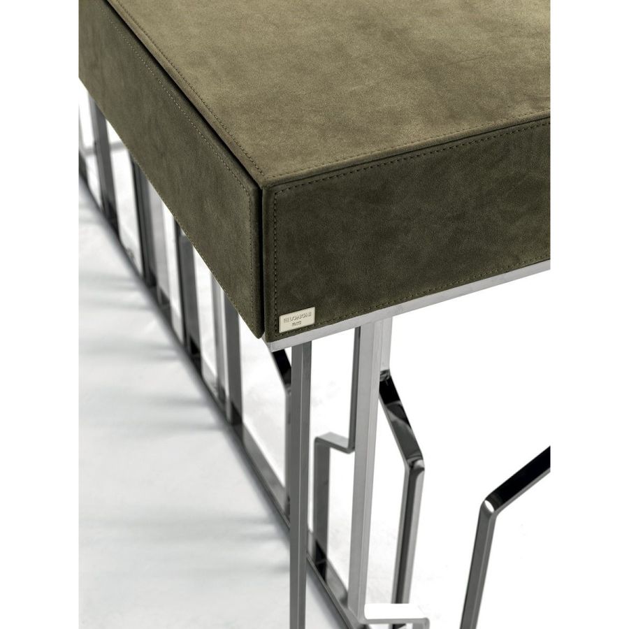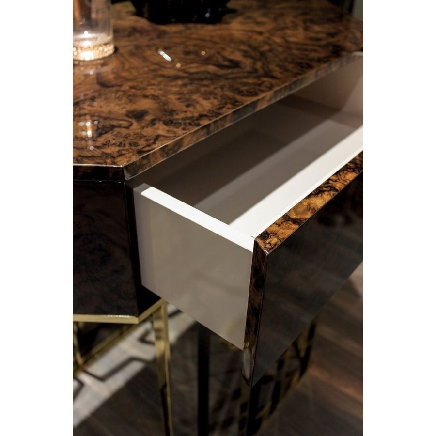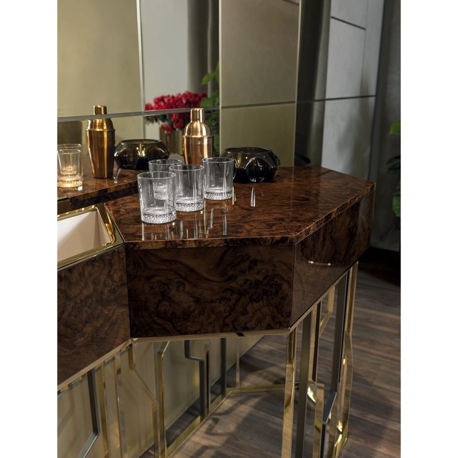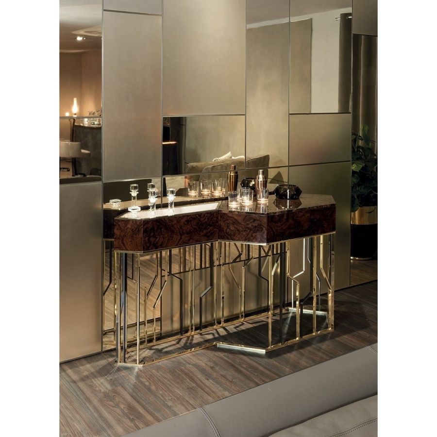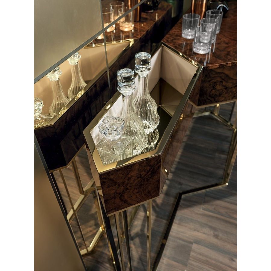A - Version with open bottle holder and wood drawer in the finishes: glossy/matt Maple, glossy/matt heat treated Eucalyptus, glossy/matt ebony, glossy/matt Canaletto walnut, glossy/matt Sycamore frisè, glossy walnut burl wood, upholstered in leathers in the range. The interior of the bottle holder compartment is lacquered in glossy colours from the range with compartment bottom in bronze or smoky mirror.compartment edge in metal in the same finish as the base. Drawer bottom covered in leather in cat. P.3Miami/SoftLeather/Suede. Metal base, available in the following finishes: Satin nickel, bright shaded brown,Black Rose gold, bright light gold, matt Champagne gold, bright chrome, bright black chrome, matt satin bronze, bright pink gold, matt pink gold. two-tone finish, upon request. B - Version with 3 small wood drawers in the finishes: glossy/matt Maple, glossy/matt heat-treatedEucalyptus, glossy/matt ebony, glossy/matt Canaletto walnut, glossy/matt Sycamore frisè, glossy walnut burl wood, upholstered in leathers from the catalogue. Drawer bottoms covered in leather in cat. P.3 Miami/SoftLeather/Suede. Metal base, available in the following finishes: Satin nickel, bright shaded brown, BlackRose gold, bright light gold, matt Champagne gold, bright chrome, bright black chrome, matt satin bronze, bright pink gold, matt pink gold. two-tone finish, upon request.