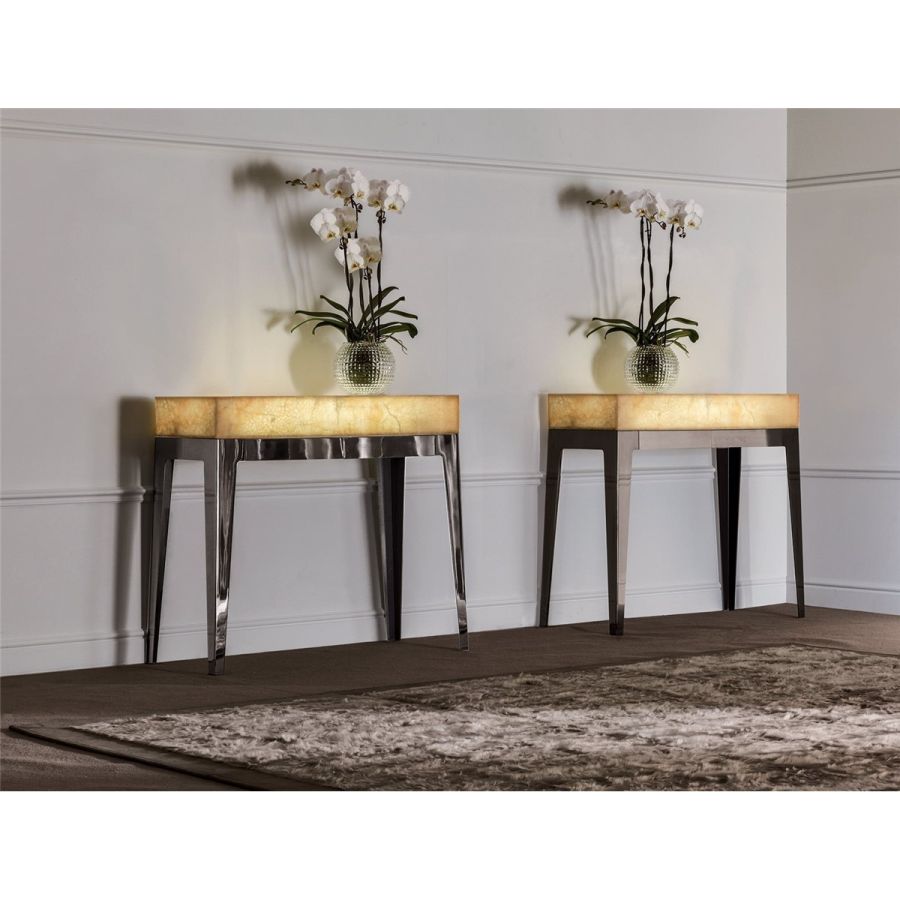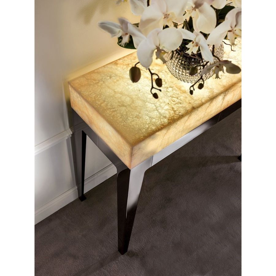 A console with distinctive style, one of a kine, with a strong aesthetic value because the top is box-structured piece of backlit onyx. The piece can be used alone in a hallway or simply behind a sofa. With Gorky, it is easy to transform the room to create an extremely rich and sophisticated mood. The base is in metal and sets on 4 slim legs, the same shape as those of other types of products from the Loveluxe collection, such as Lady and Grandeur.
