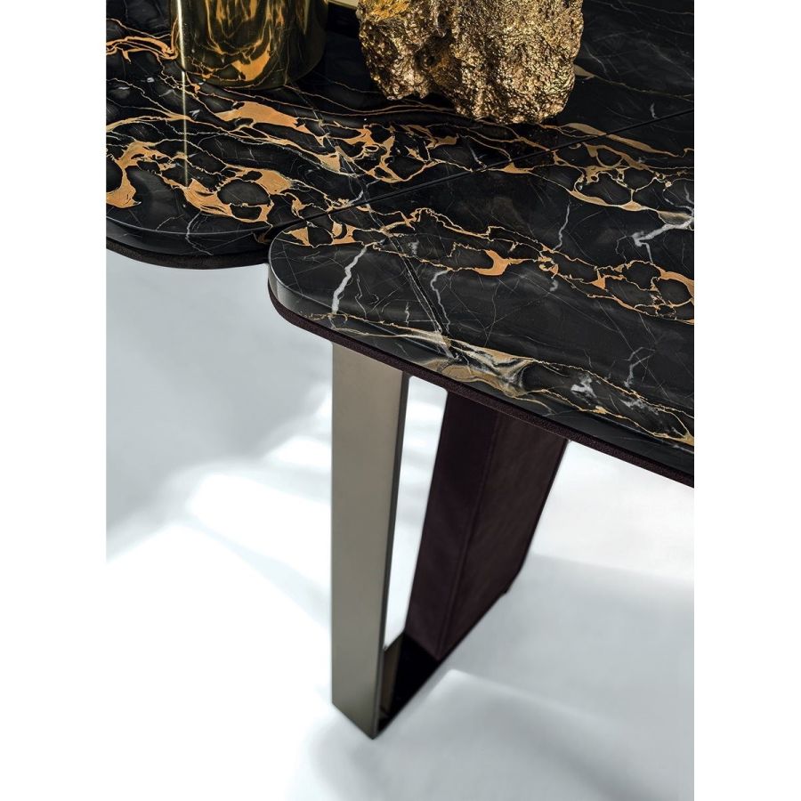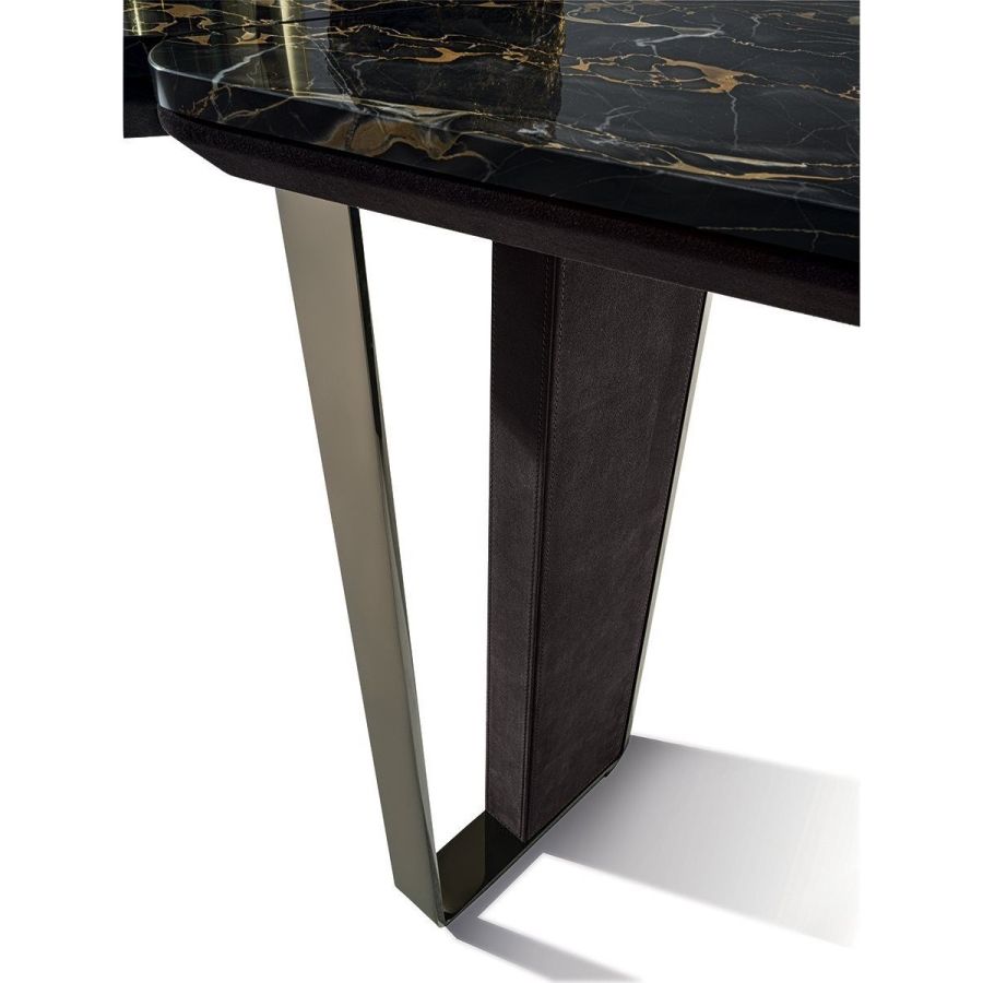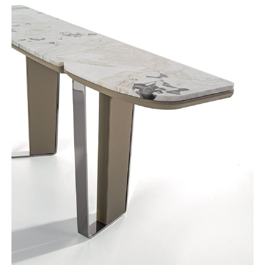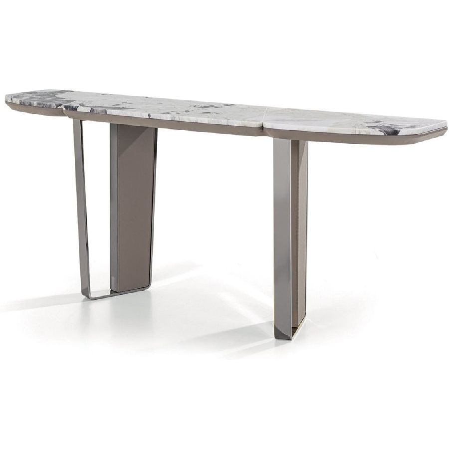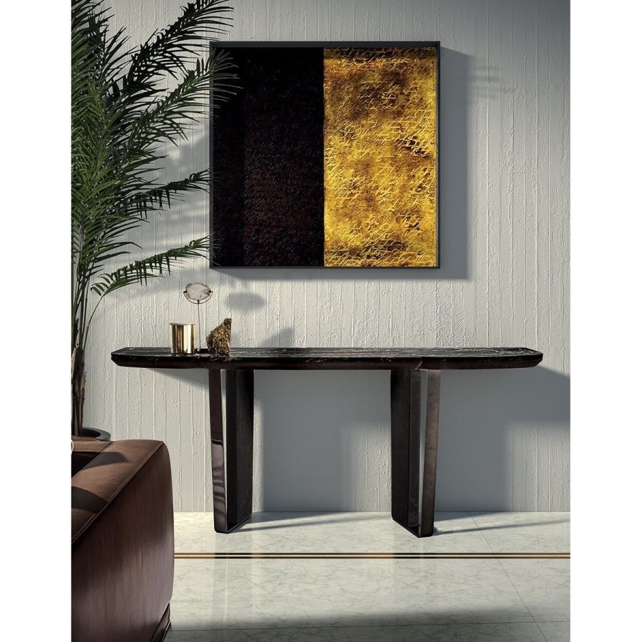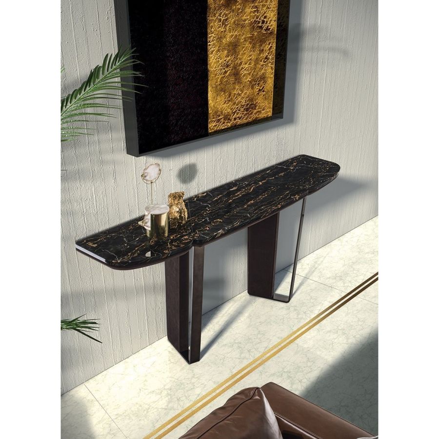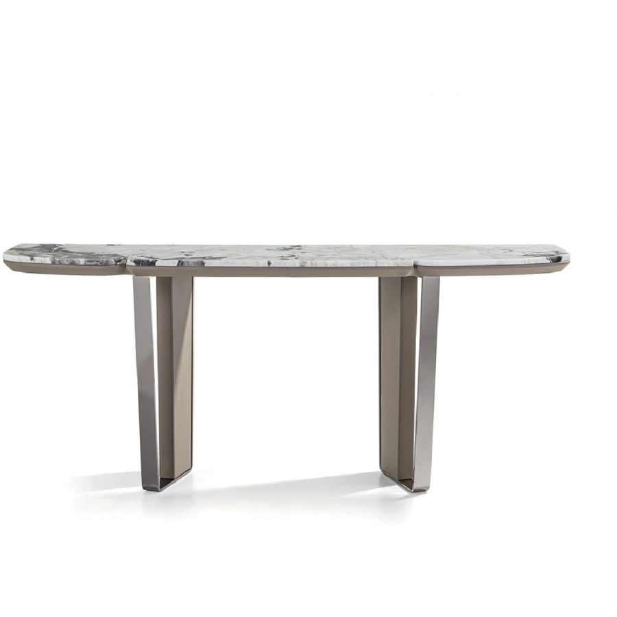 Console consisting of 2 trapezoidal legs and a shaped and sectioned top made of different materials. Machined and laser cut ground metal base in the finishes: Satin nickel, bright shaded brown, Black Rose gold, bright light gold, matt Champagne gold, bright chrome, bright black chrome, matt satin bronze, bright pink gold, matt pink gold. The leg insert is covered in leather from the catalogue or in wood: glossy/matt ebony, glossy/matt Maple, glossy/matt heat-treated Eucalyptus, Canaletto walnut stained glossy/matt Macadamia, glossy/matt Sycamore frisè. Under-top covered in leather from the catalogue, if desired, matching the leg insert. The top, divided into 3 parts, is in the finishes: White Carrara marble, Imperial Brown marble, Sahara Noir marble (glossy and matt polyester finish), Dover White marble, Panda White marble, Guatemala Green marble, Corteccia marble, Port Saint Laurent marble, Red Levanto marble, Bardiglio Nuvolato marble, Elegant Brown marble, Shale Rosewood marble, Emperador Dark marble, SilverWave marble, Agatha Black marble, Frappuccino marble, Calacatta marble, Fusion Light marble, Patagonia marble, Explosion Blue marble, Fusion Multicolor marble, Juliet Quartz marble, Azul Macauba marble,(Onyxes on request), or in wood.