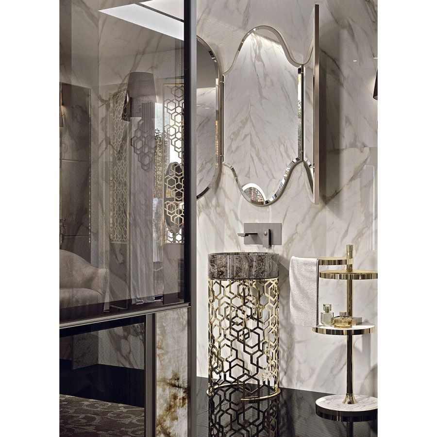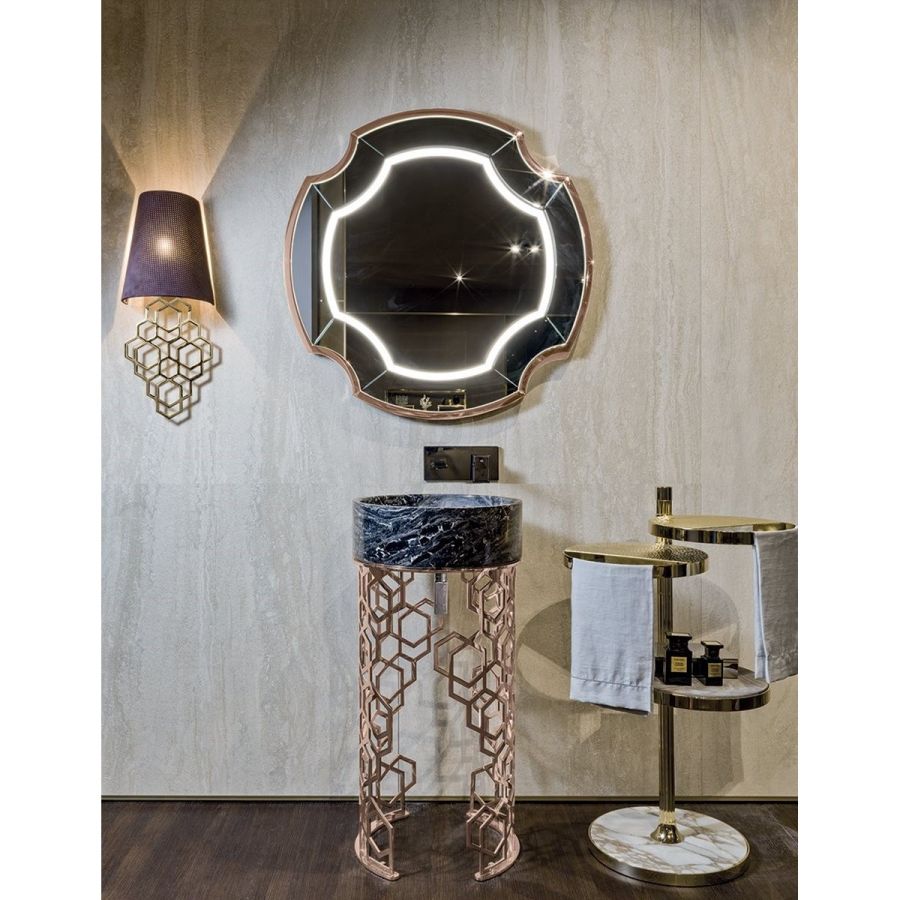 This precious washbasin is made from a whole block of marble and set on a metal base decorated with the “Sequence” pattern: a perforated design that looks like it was done by hand, but is instead the result of a sophisticated laser cutting process. The “beehive” decoration, by Giuseppe Iasparra, is a style, an authentic iconographic pattern that appears on several pieces in the Loveluxe collection - including tables of all sizes, furniture, and boiserie panels. It is an authentic expression of the Longhi personality.