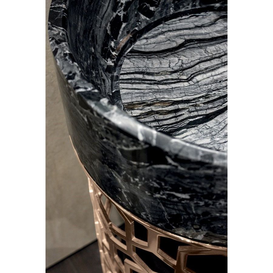 Basin with base machined in ground metal with laser cut “Sequence” decoration and calendered, in the finishes: Black Rose gold, bright pink gold, matt pink gold, bright shaded brown, bright light gold, matt Champagne gold, bright chrome, bright black chrome, matt satined bronze. Washbasin in solid marble in the variations: Calacatta marble, Silver Wave marble, Corteccia marble.