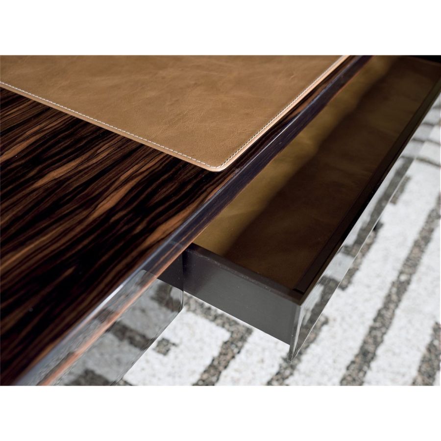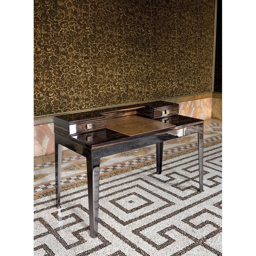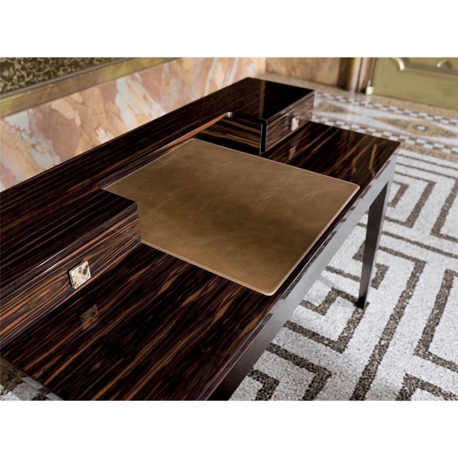 Console/Desk in wood with finishes: glossy lacquered wood in range colours, glossy/matt ebony, glossy/matt Canaletto walnut, glossy/matt Sycamore frisè. Desk top and drawer interiors covered in leather. Laser-cut ground metal base in the finishes: bright shaded brown, bright light gold, matt Champagne gold, bright chrome, bright black chrome, matt satin bronze, bright pink gold, matt pink gold, Black Rose gold. Handles in marble or hide.