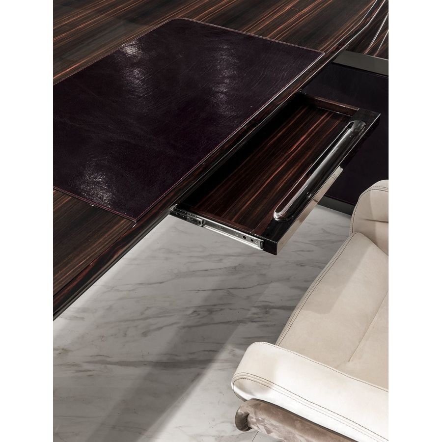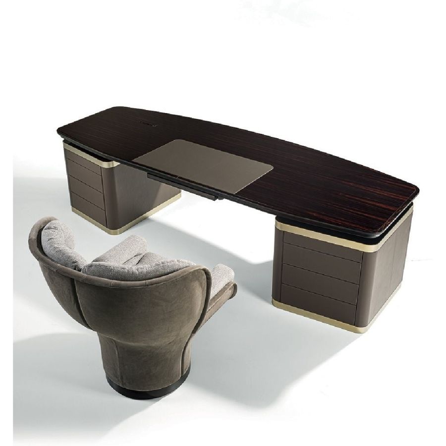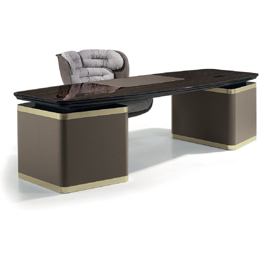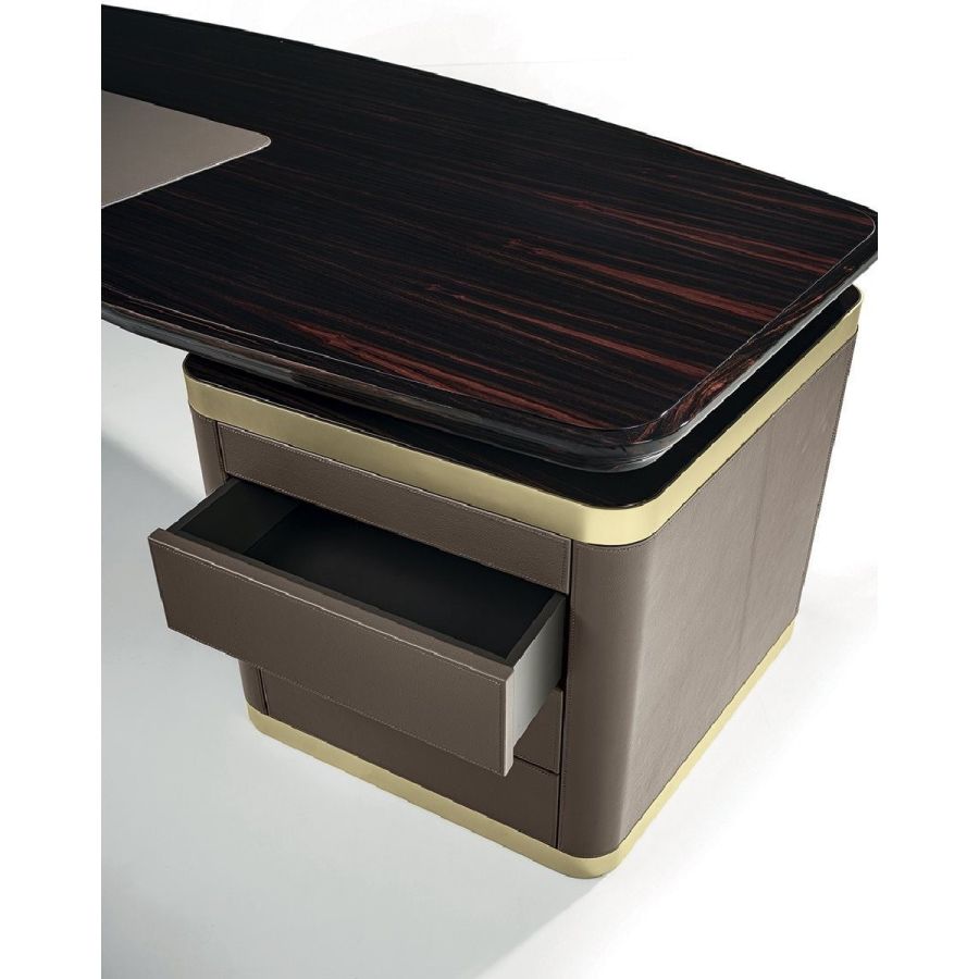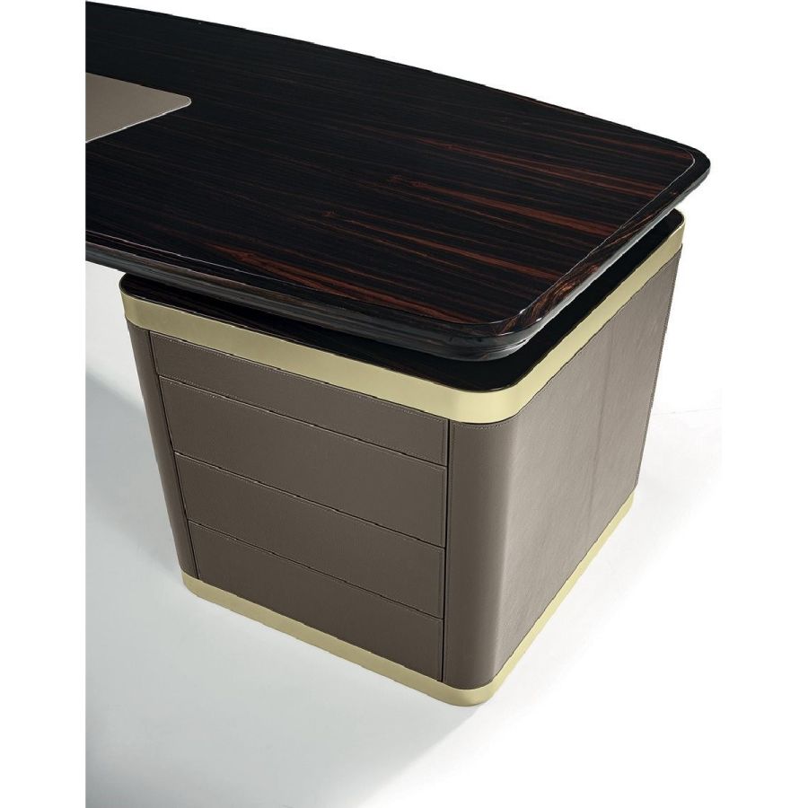 Desk in wood in the finishes glossy ebony, glossy Canaletto walnut, matt ebony or matt Canaletto walnutwith edge in shaped solid wood. Top with insert in leather, as in our sample set, and mini extractable tray.Two compositions are available for the base: A - two chests of drawers at the edges of the top, B - one chestof drawers and a peninsula with 2 doors and 4 drawers. Chests of drawers in wood covered in leather, as inour sample set, and ground metal edges in the finishes: Satin nickel, Bright shaded brown, Black Rose gold,bright light gold, matt Champagne gold, bright chrome, bright black chrome, matt satin bronze.