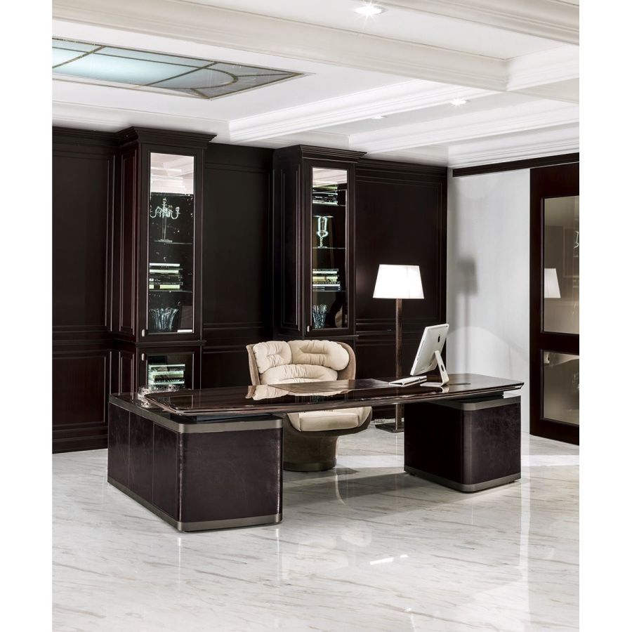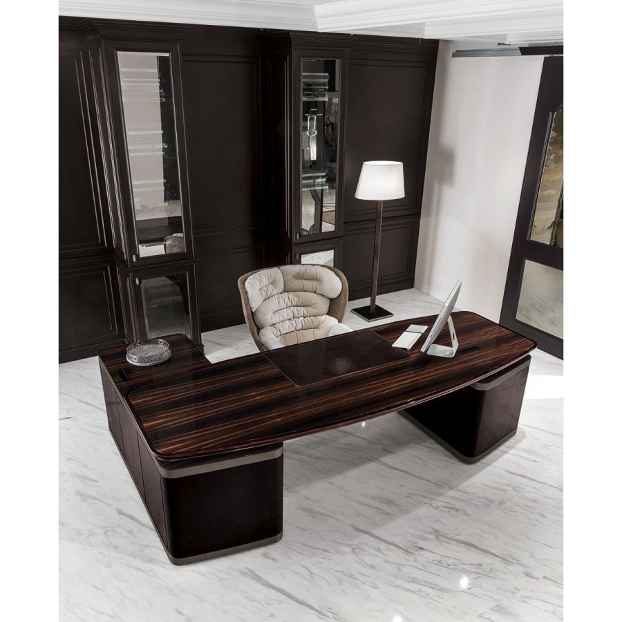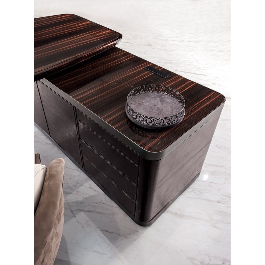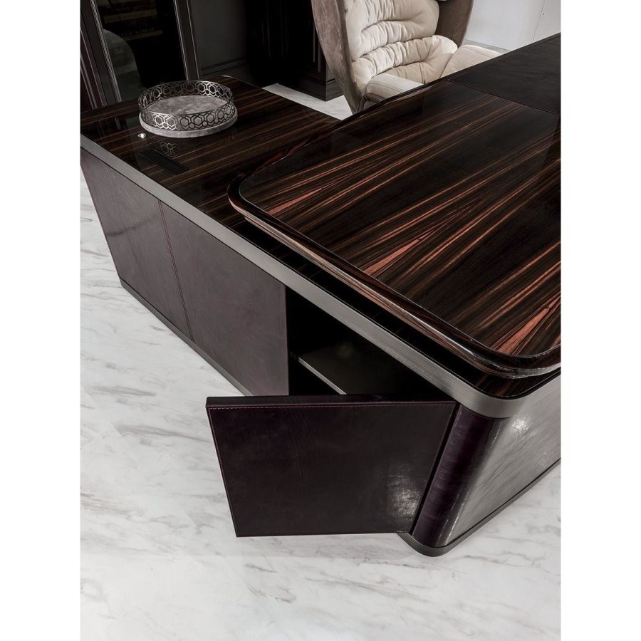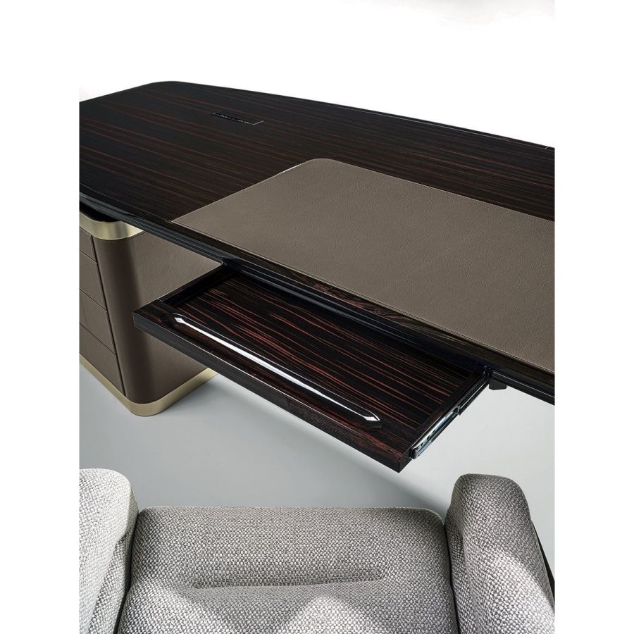 Desk in wood in the finishes glossy ebony, glossy Canaletto walnut, matt ebony or matt Canaletto walnutwith edge in shaped solid wood. Top with insert in leather, as in our sample set, and mini extractable tray.Two compositions are available for the base: A - two chests of drawers at the edges of the top, B - one chestof drawers and a peninsula with 2 doors and 4 drawers. Chests of drawers in wood covered in leather, as inour sample set, and ground metal edges in the finishes: Satin nickel, Bright shaded brown, Black Rose gold,bright light gold, matt Champagne gold, bright chrome, bright black chrome, matt satin bronze.