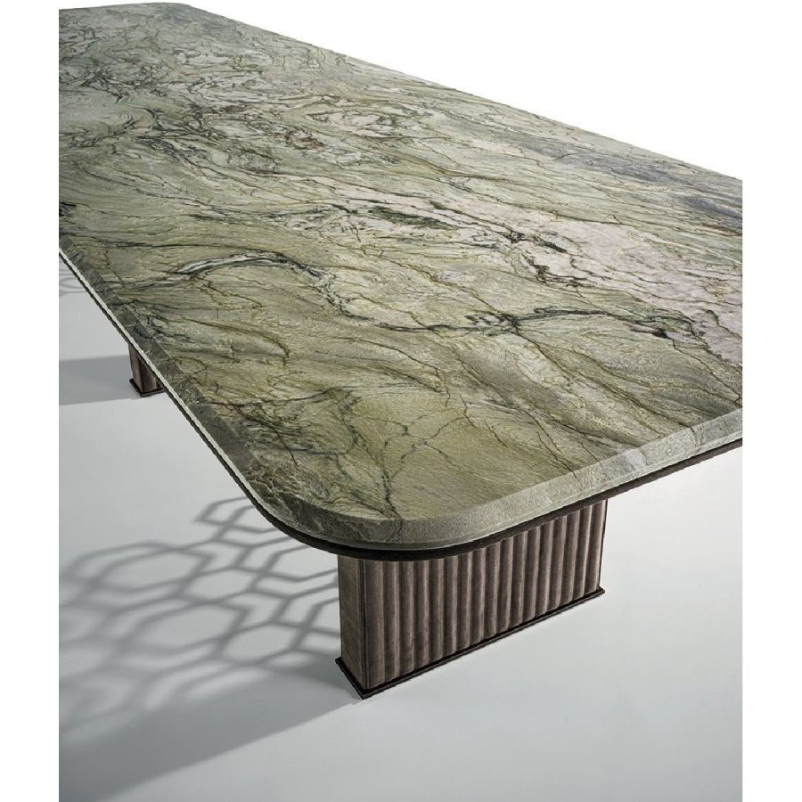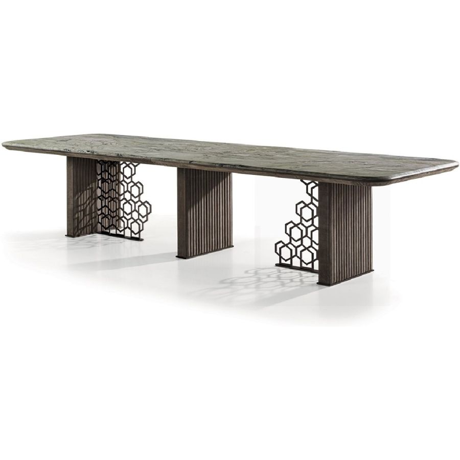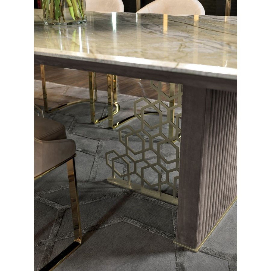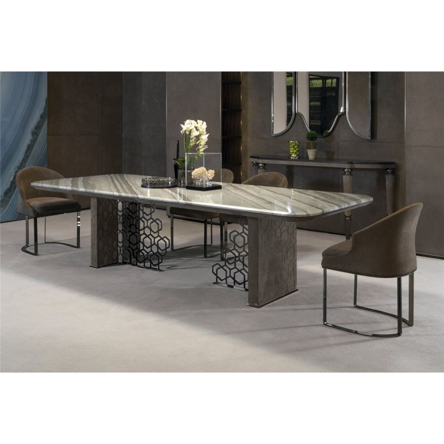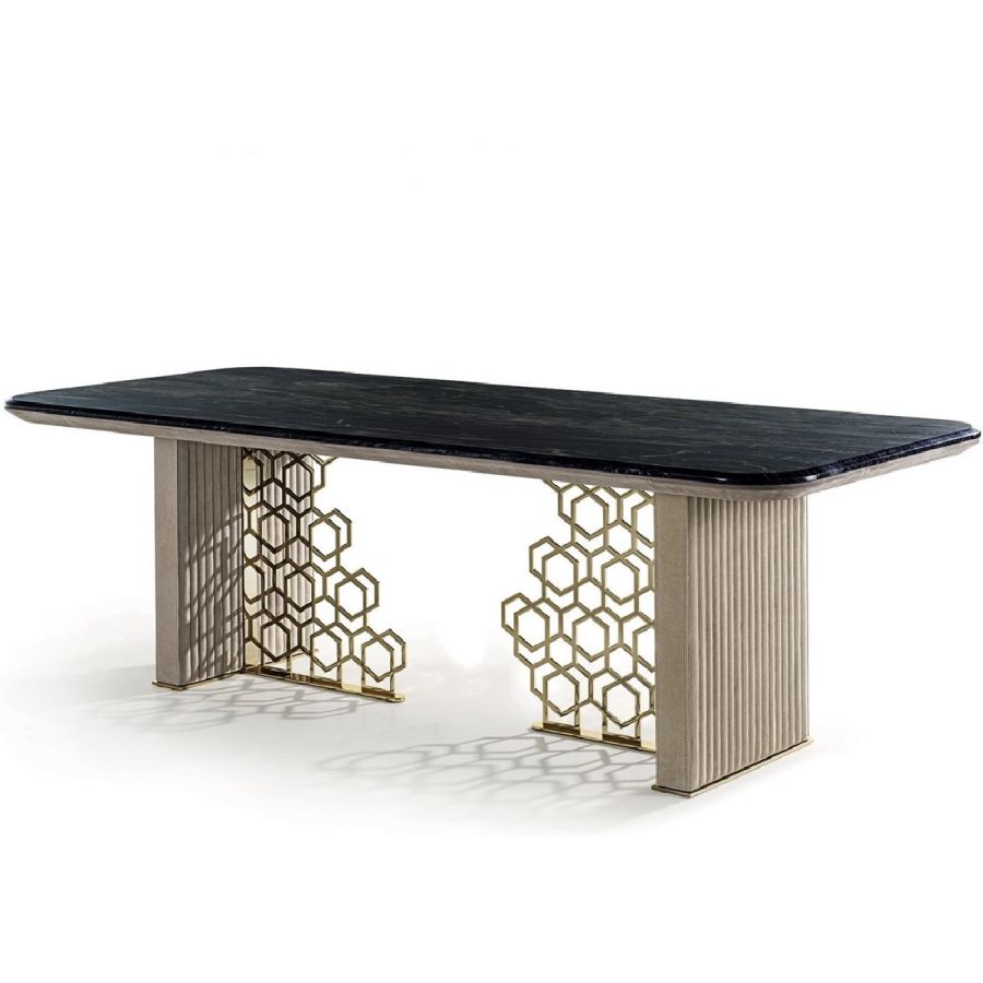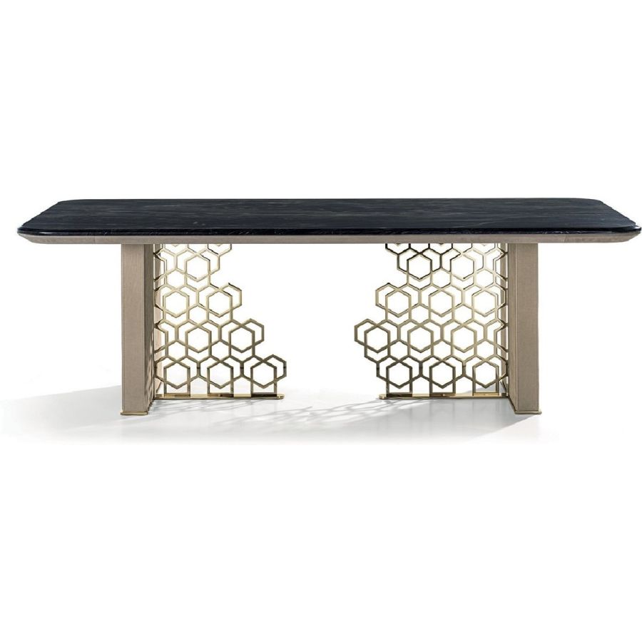 Table with base comprising an external side in wood, covered with quilted suede, and an internal section in ground metal with the “Sequence” decoration: a perforated pattern that looks like the result of a manual process but is actually the result of a sophisticated laser cutting process. The “beehive” decoration, by Giuseppe Iasparra, is a style, an authentic iconographic pattern that appears on several pieces in the Loveluxe collection - including tables, furniture and boiserie panels. It is an authentic expression of the Longhi personality. With its rounded corners, the Exelsior table has a unique shape, sophisticated in the choice of materials and balanced in proportions and thicknesses.