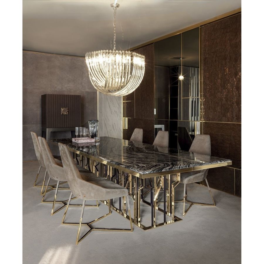 A must from the Loveluxe collection: this famous series offers tables of all sizes, consoles and other pieces designed with the unmistakeable style of Alessandro La Spada. To set in the centre of a room, and ideal when matched with the Miu chair and lighted with the impressive Narita chandelier, the Ginza table has rectangular surfaces supported by a characteristic base decorated with polished or matt metal rods that look like stylised “flashes”. This is the distinctive mark of the entire Ginza series.