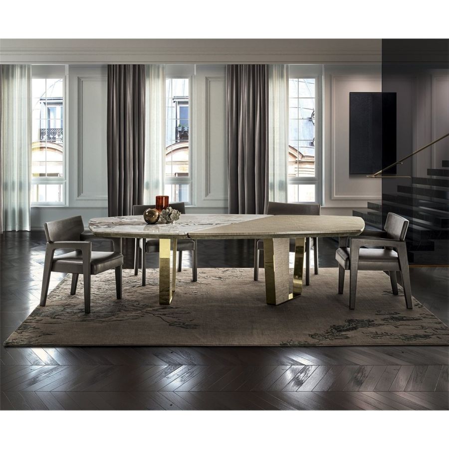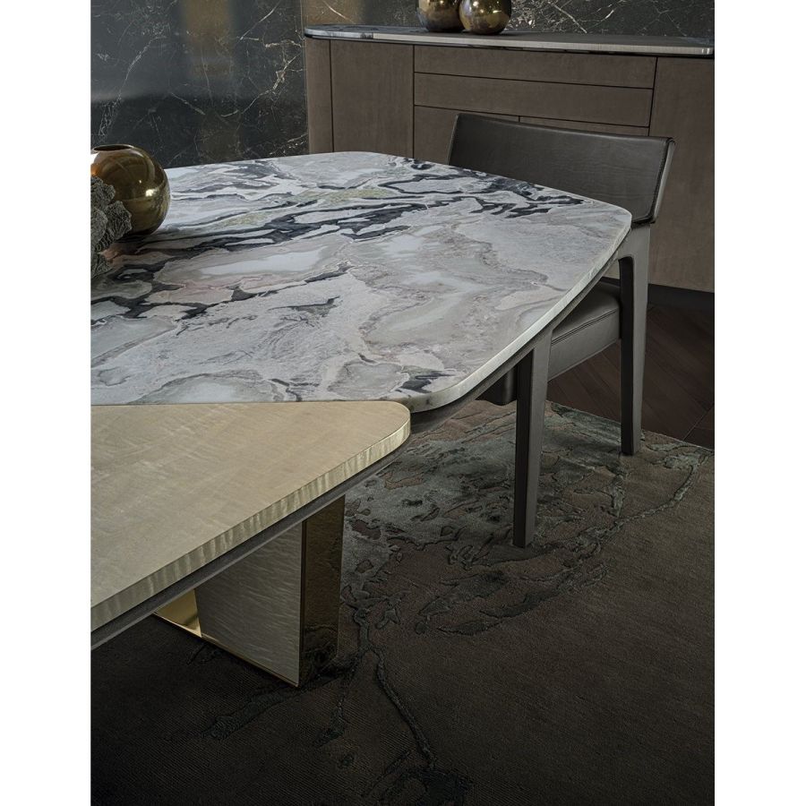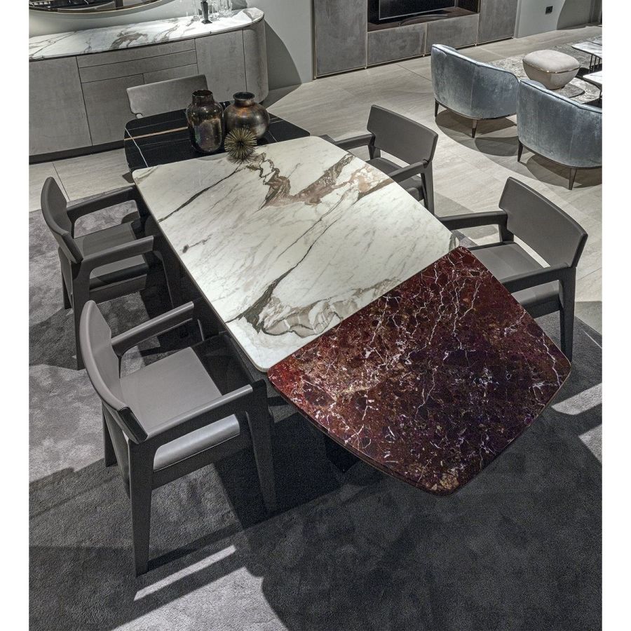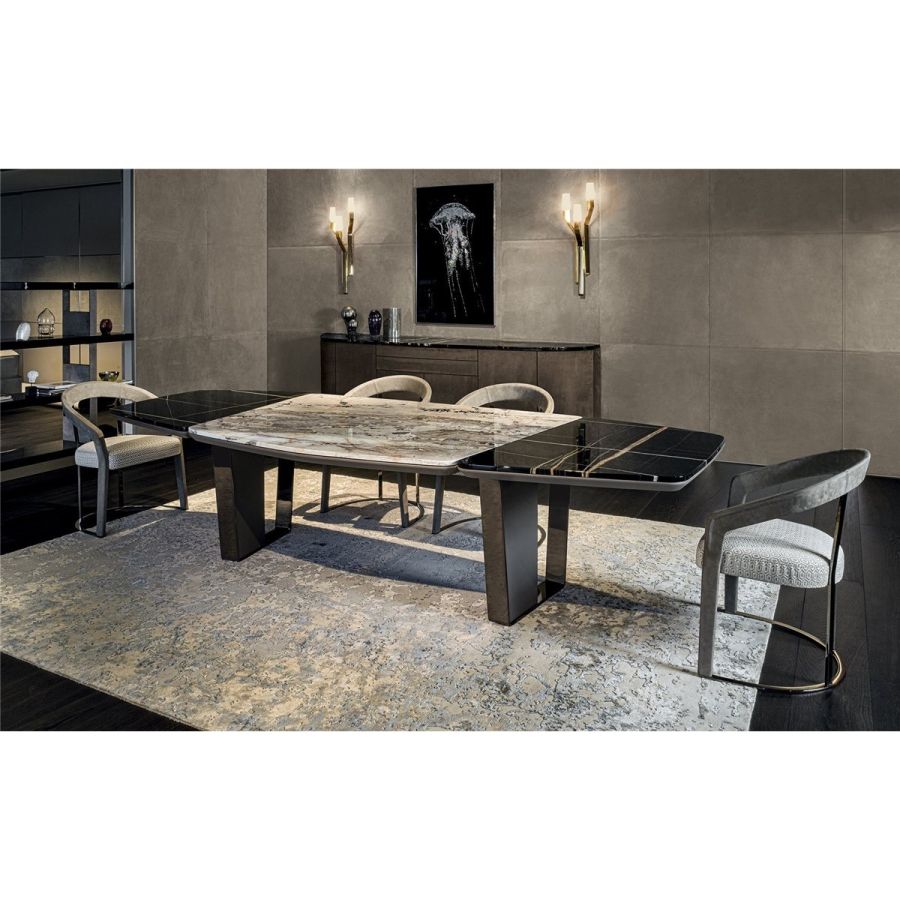 Keope is a table characterised by a contoured and sectioned top made of multiple materials and by 2 trapezoidal legs with a leather or wooden insert. Majestic and spectacular, it is available with the top divided into 2 or 3 parts. The Keope collection - table, console, and cabinet - conveys a timeless elegance, inspired by an authentic modern-chic dynamism in which sophisticated materials, quality marbles, and simple shapes evoke sensations that perfectly embody the brand’s design philosophy.